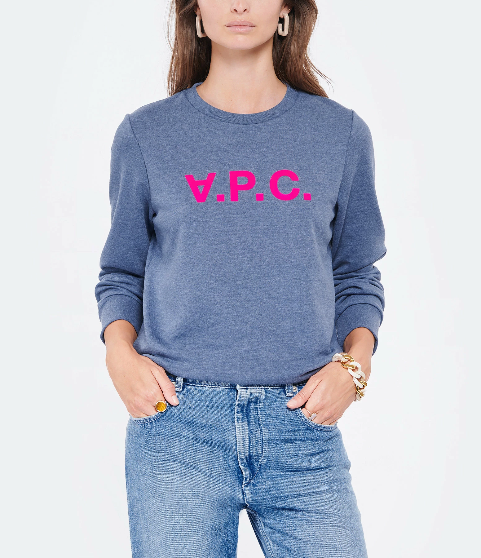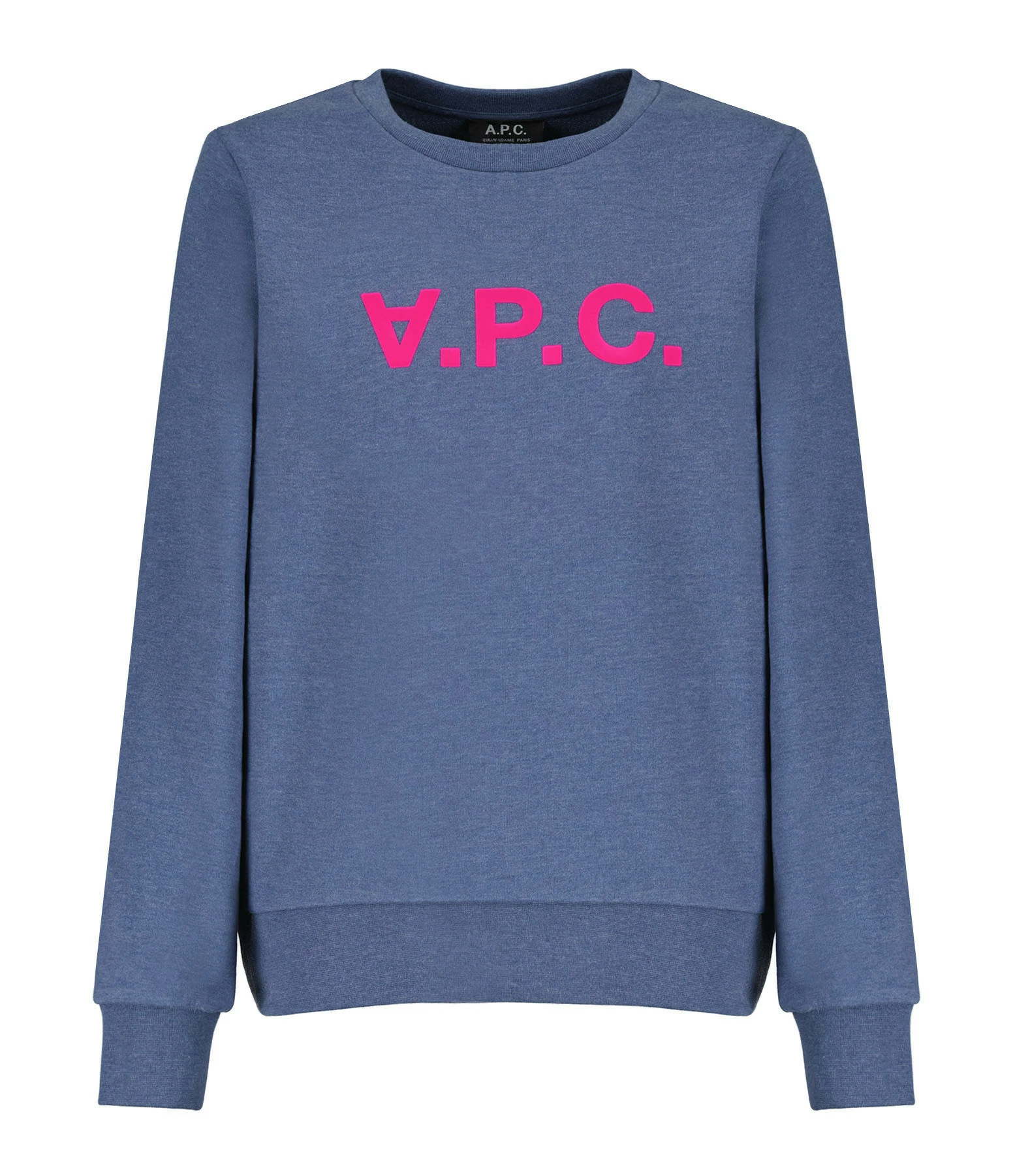 Sweatshirt en coton bleu avec logo “APC” rose fluo en velours floqué à l’avant. Col rond. Manches longues. Coupe droite. Base droite.