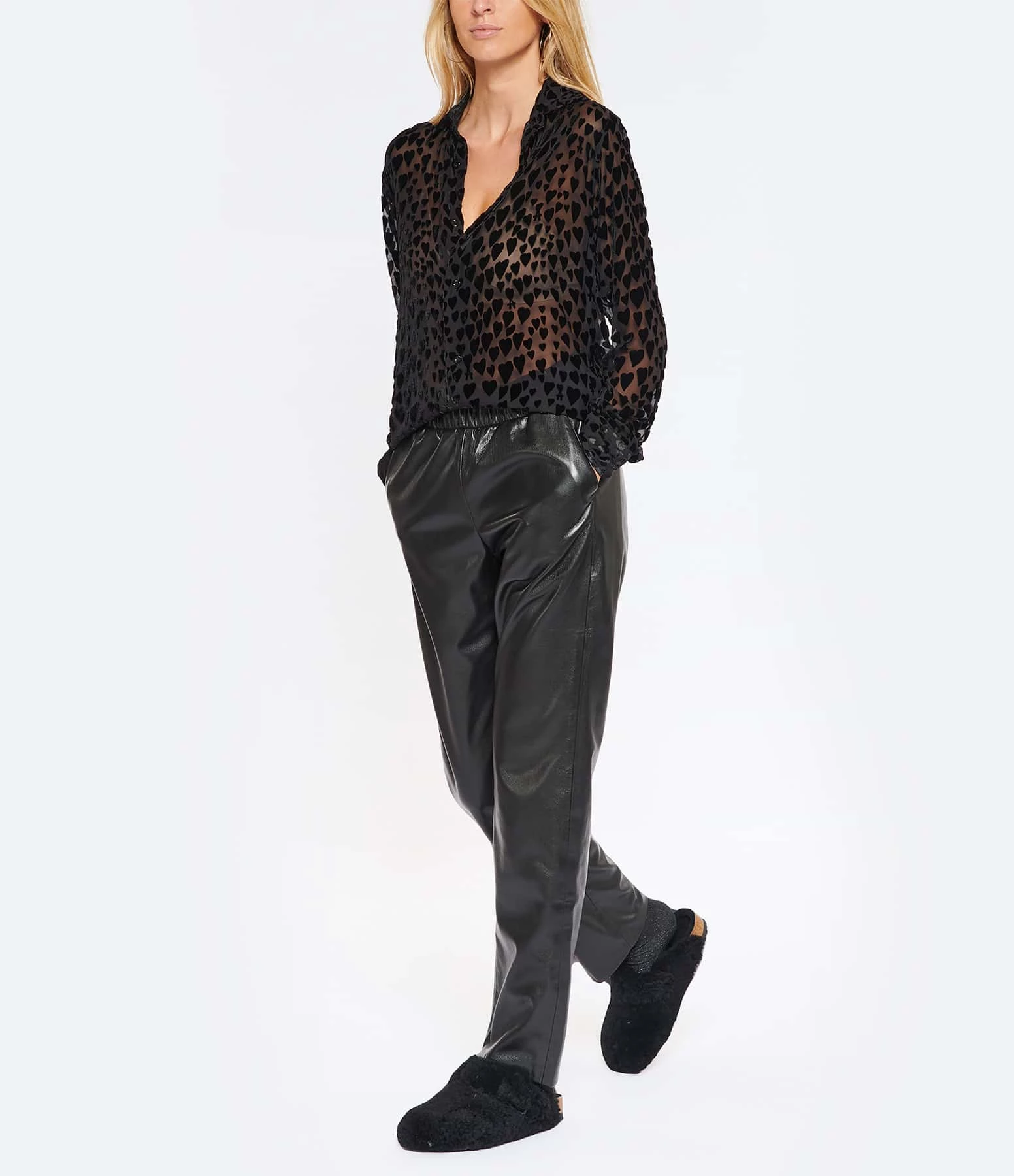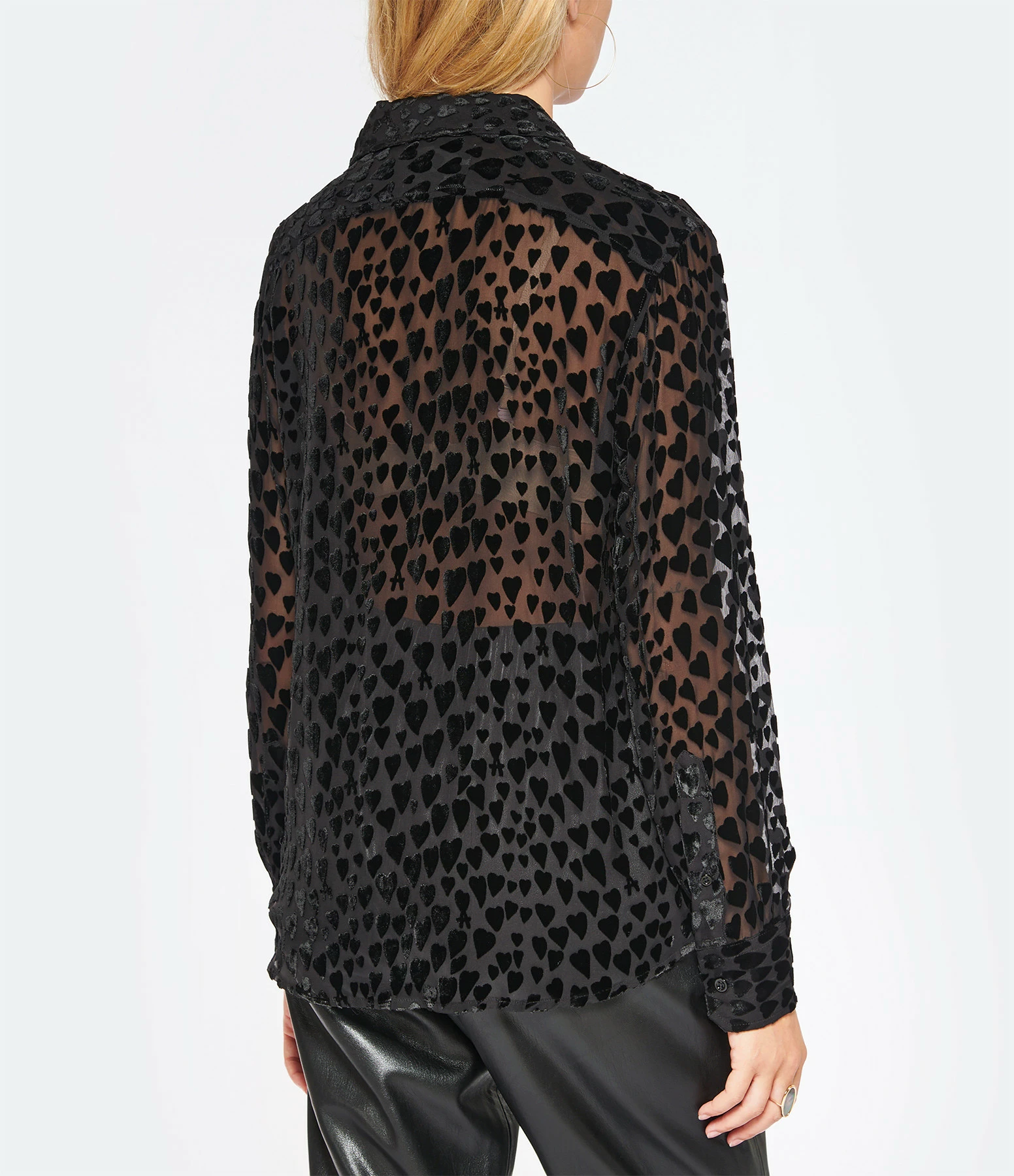 Chemise en tissu transparent de soie mélangée noir se démarquant par un motif cœur en velours noir disposé en all-over. Col chemisier. Manches longues avec fentes et poignets boutonnés. Fermeture boutonnée sur le devant. Petits boutons noirs nacrés. Coupe droite. Base droite. Non doublée.
