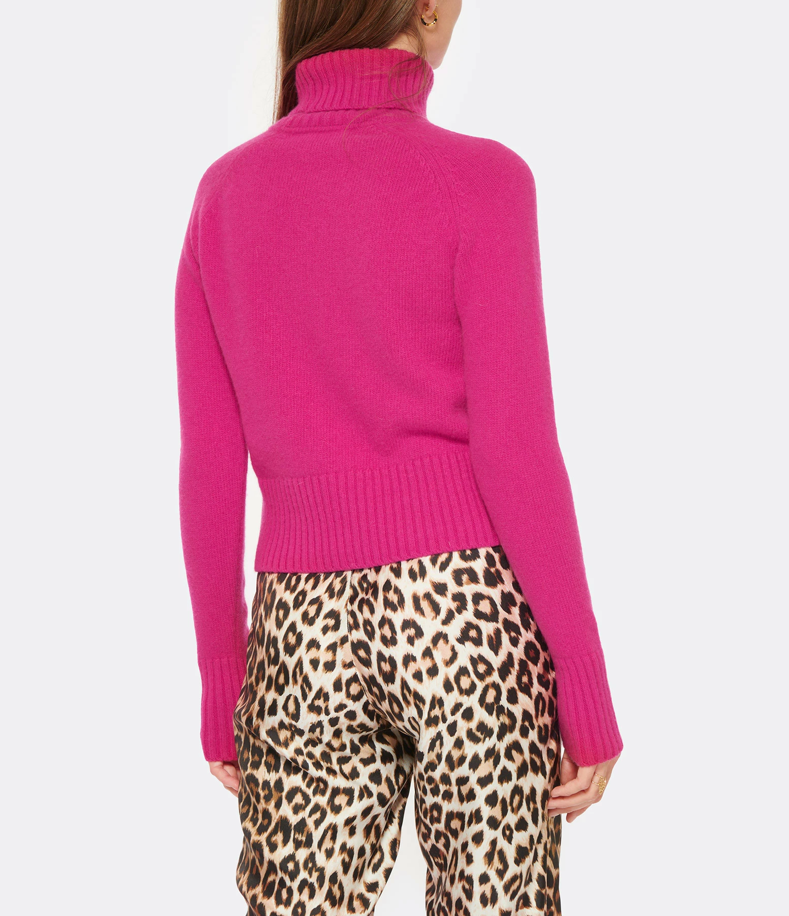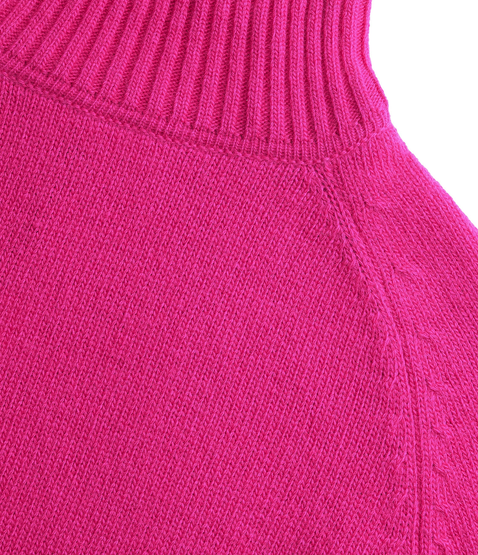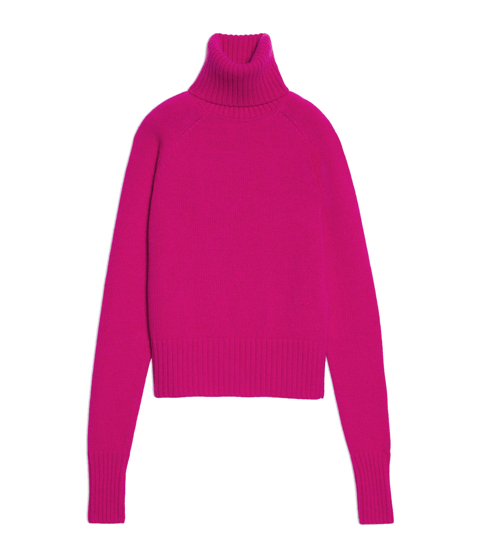 Pull en maille de laine fuchsia. Col montant côtelé. Manches longues raglans avec poignets côtelés. Coupe droite. Base droite côtelée.