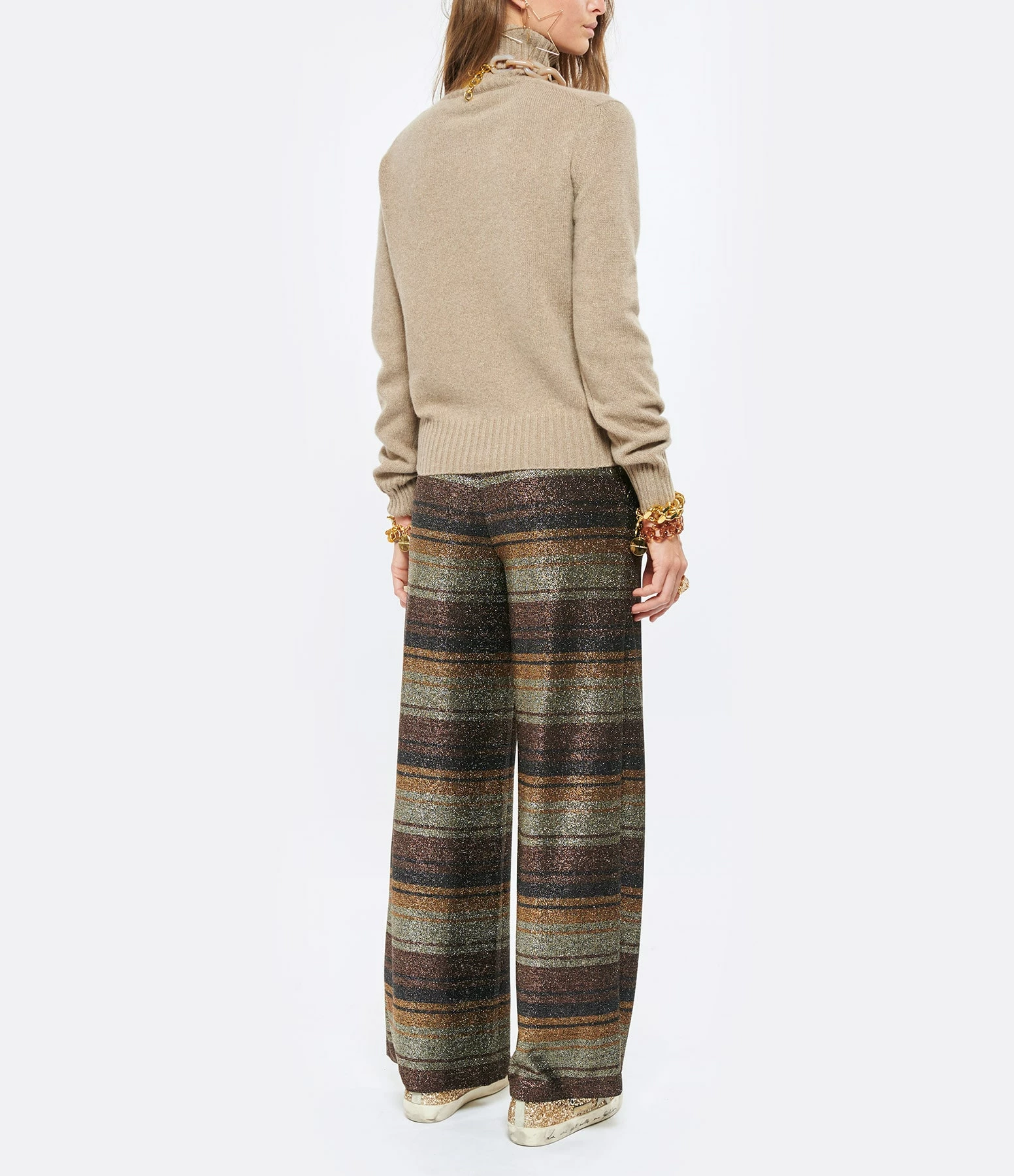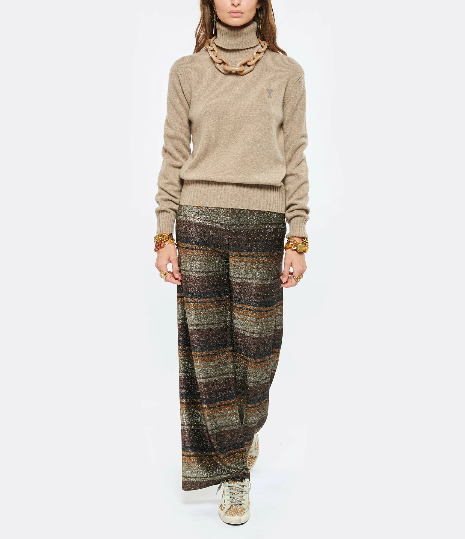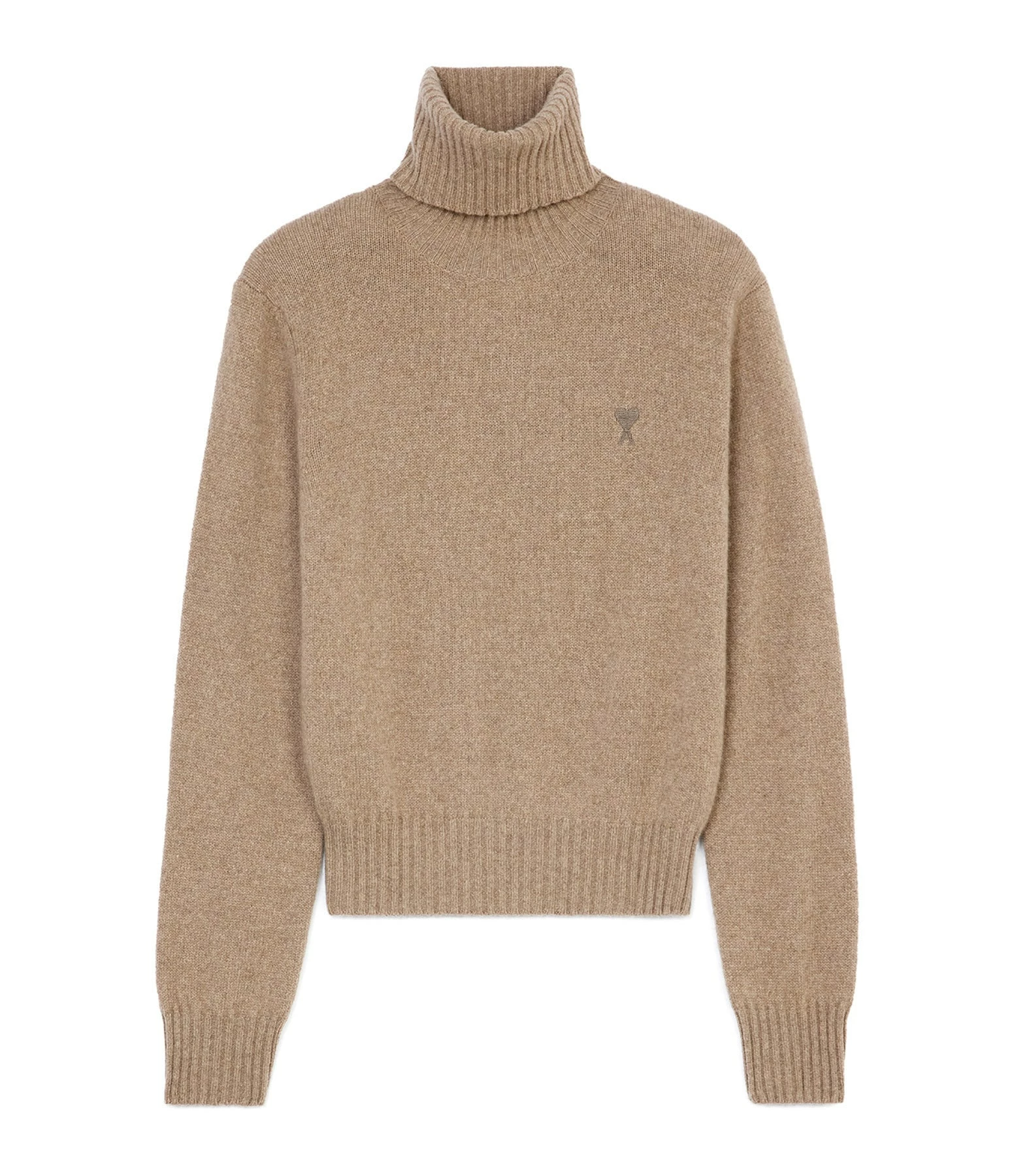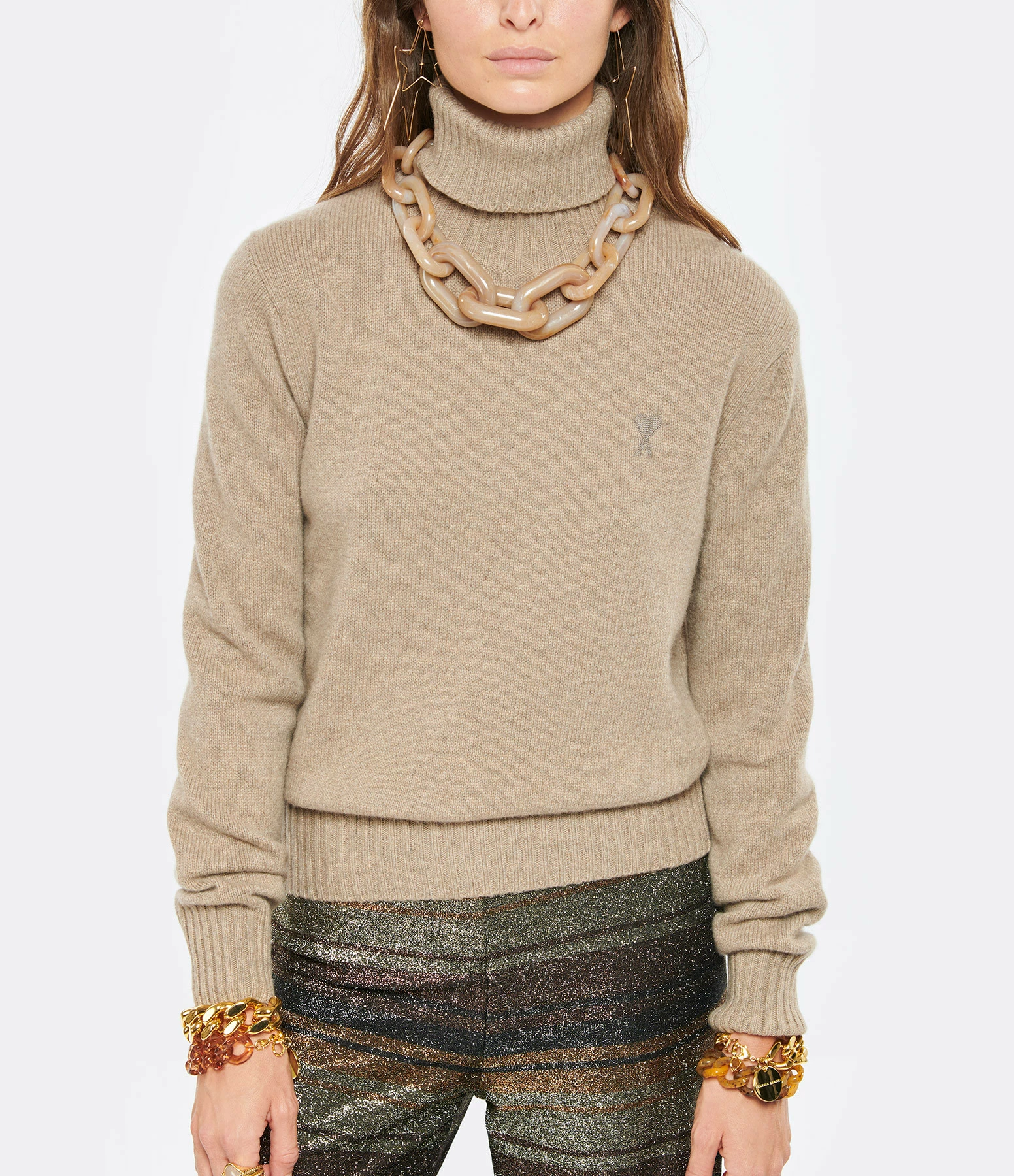 Pull en cachemire beige avec logo “Ami de cœur” beige brodé sur la poitrine. Manches longues. Col roulé. Coupe droite. Base droite.