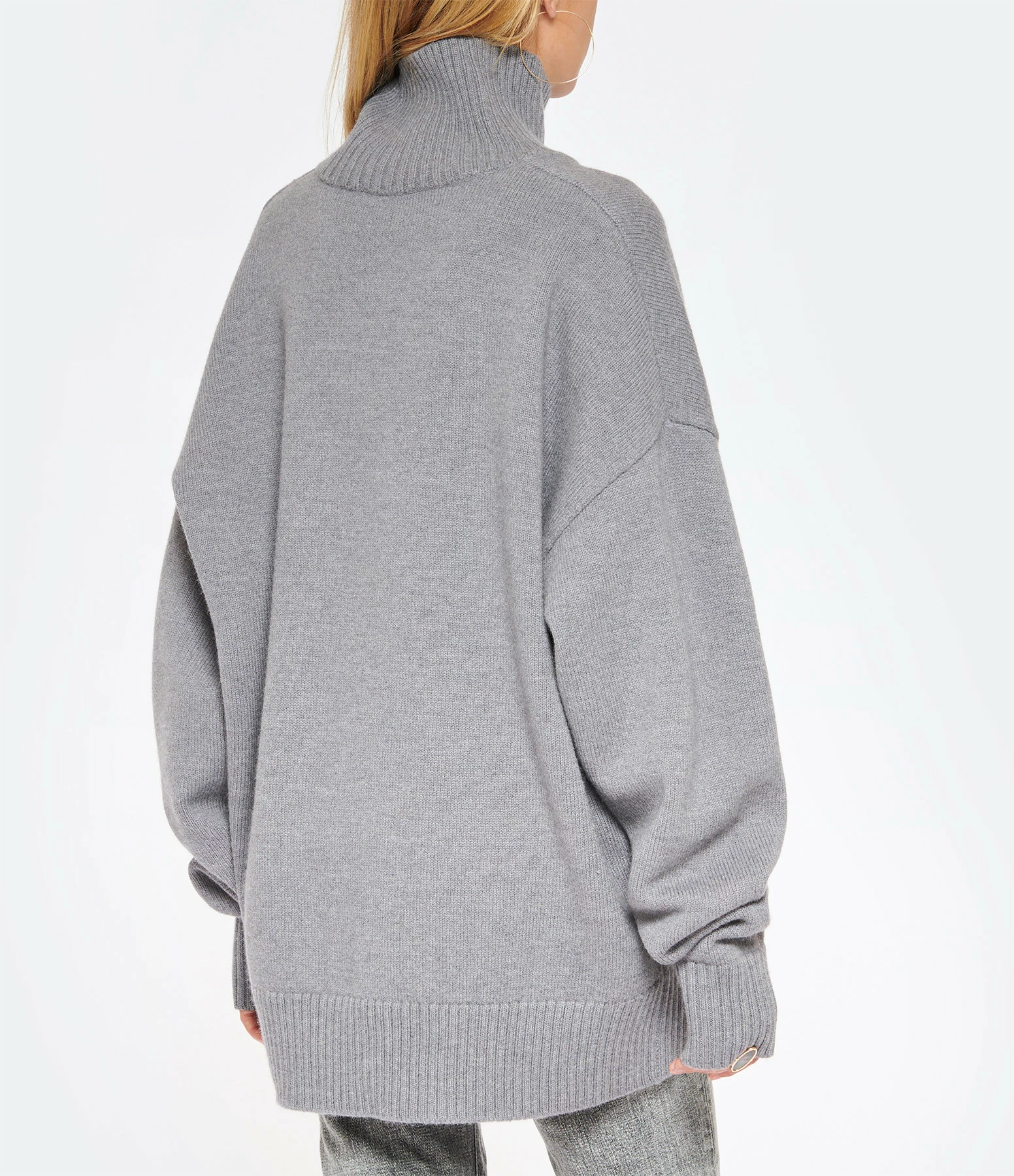 Pull en maille de laine grise ornée du logo “Ami de cœur” brodé en points chaînette noir sur la poitrine. Col montant côtelé. Manches longues avec poignets côtelés. Coupe large. Base droite côtelée.
