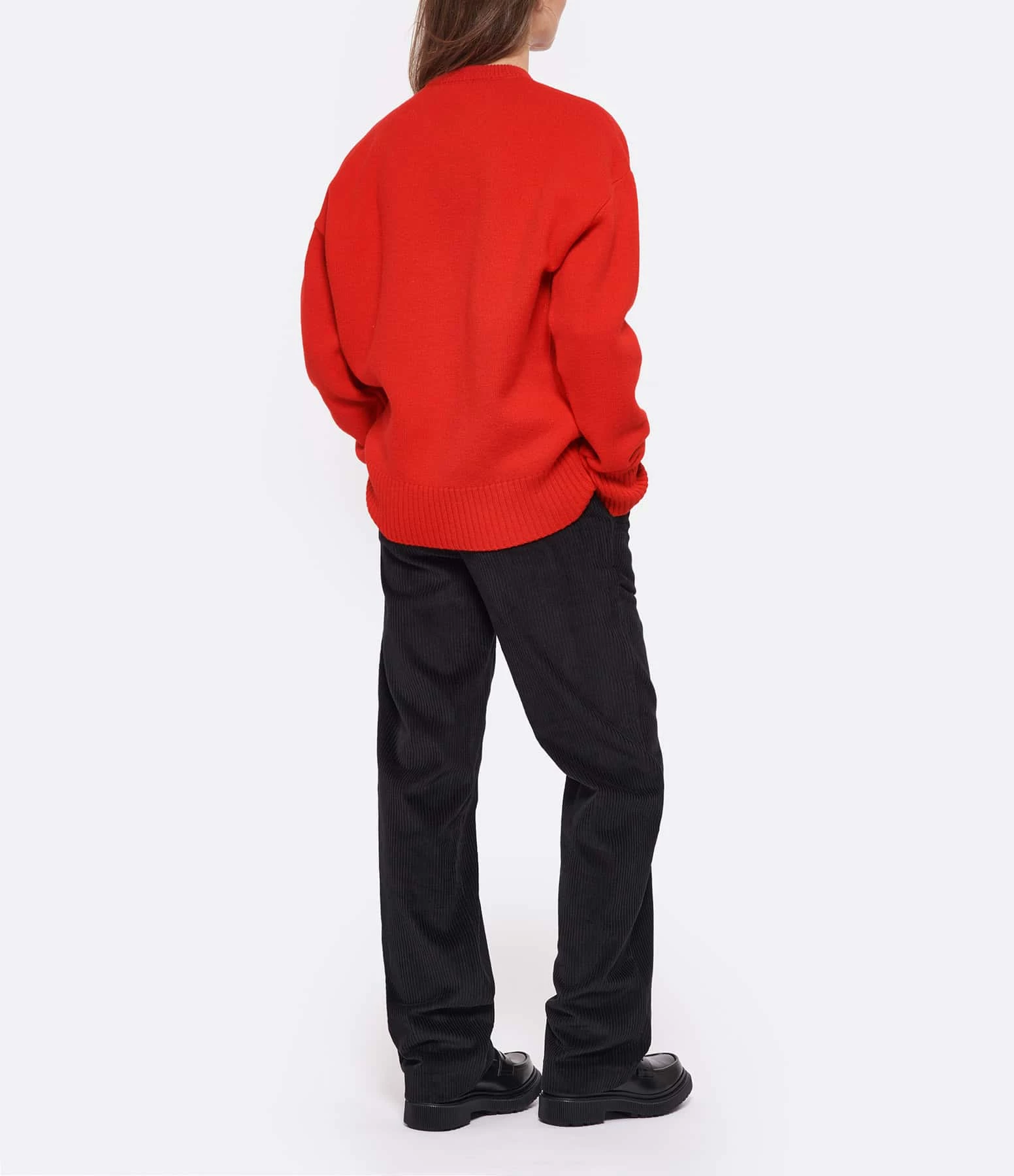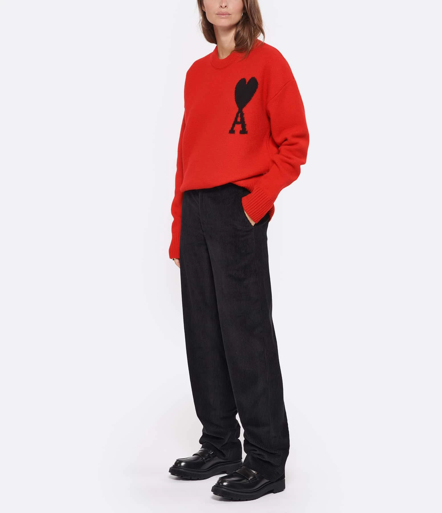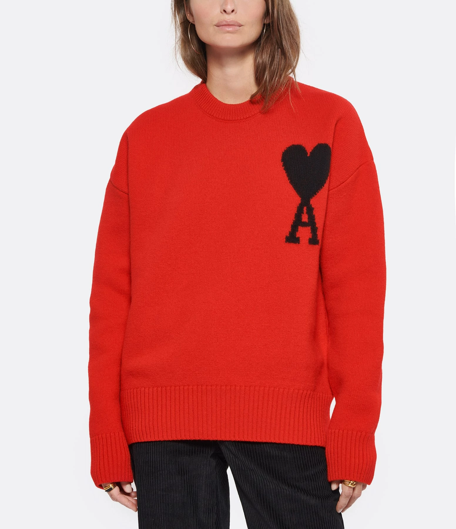 Pull en laine rouge avec logo “Ami de cœur” brodé en noir sur la poitrine. Col rond côtelé. Manches longues avec poignets côtelés. Coupe droite ample. Base droite côtelée.
