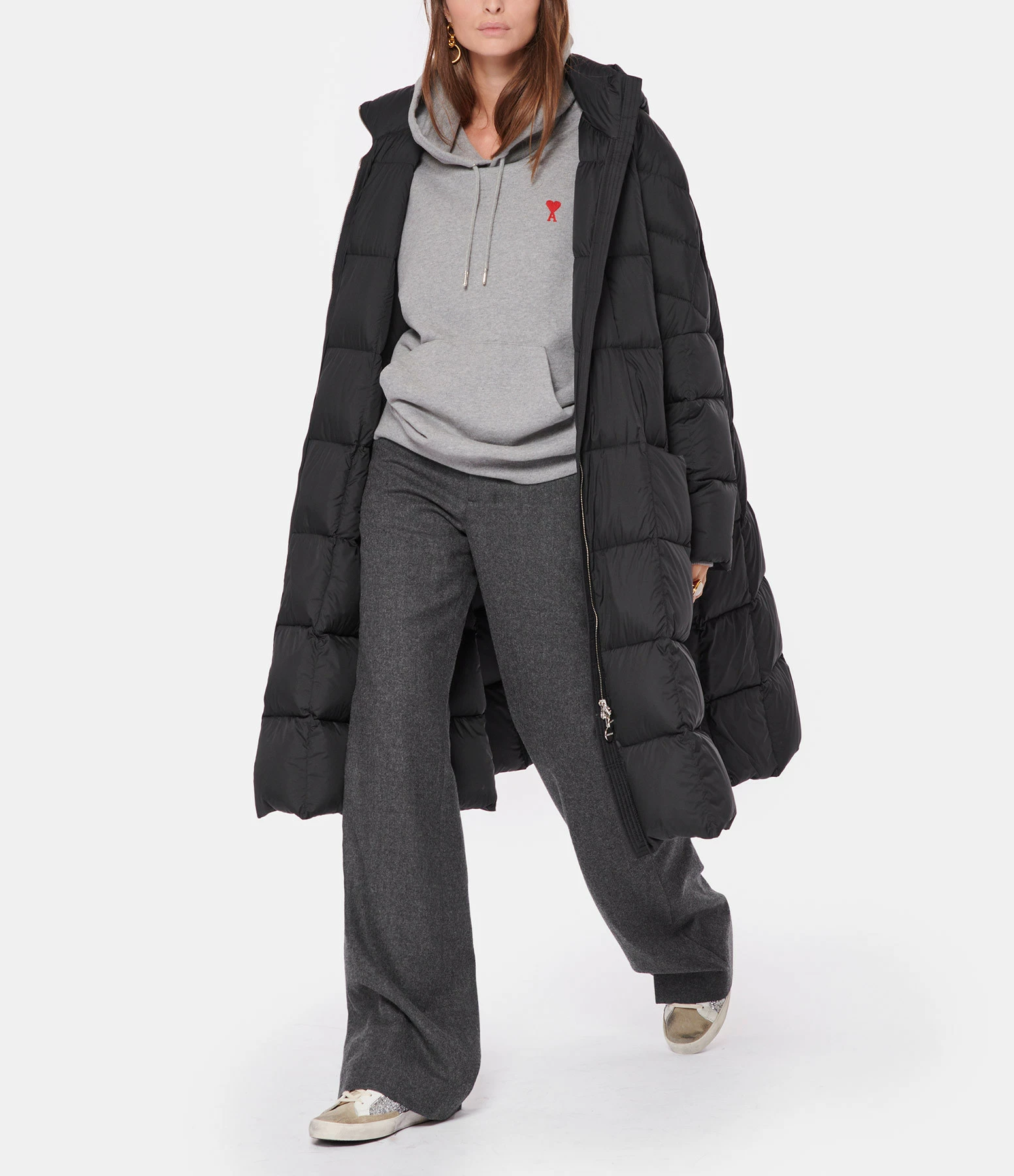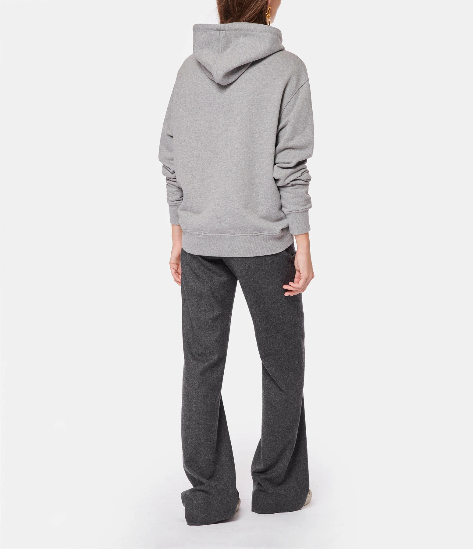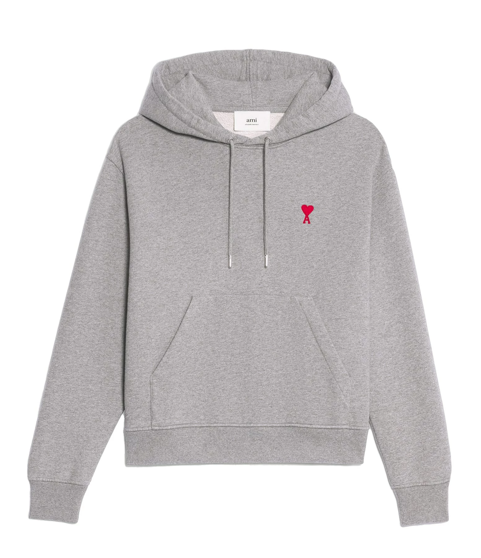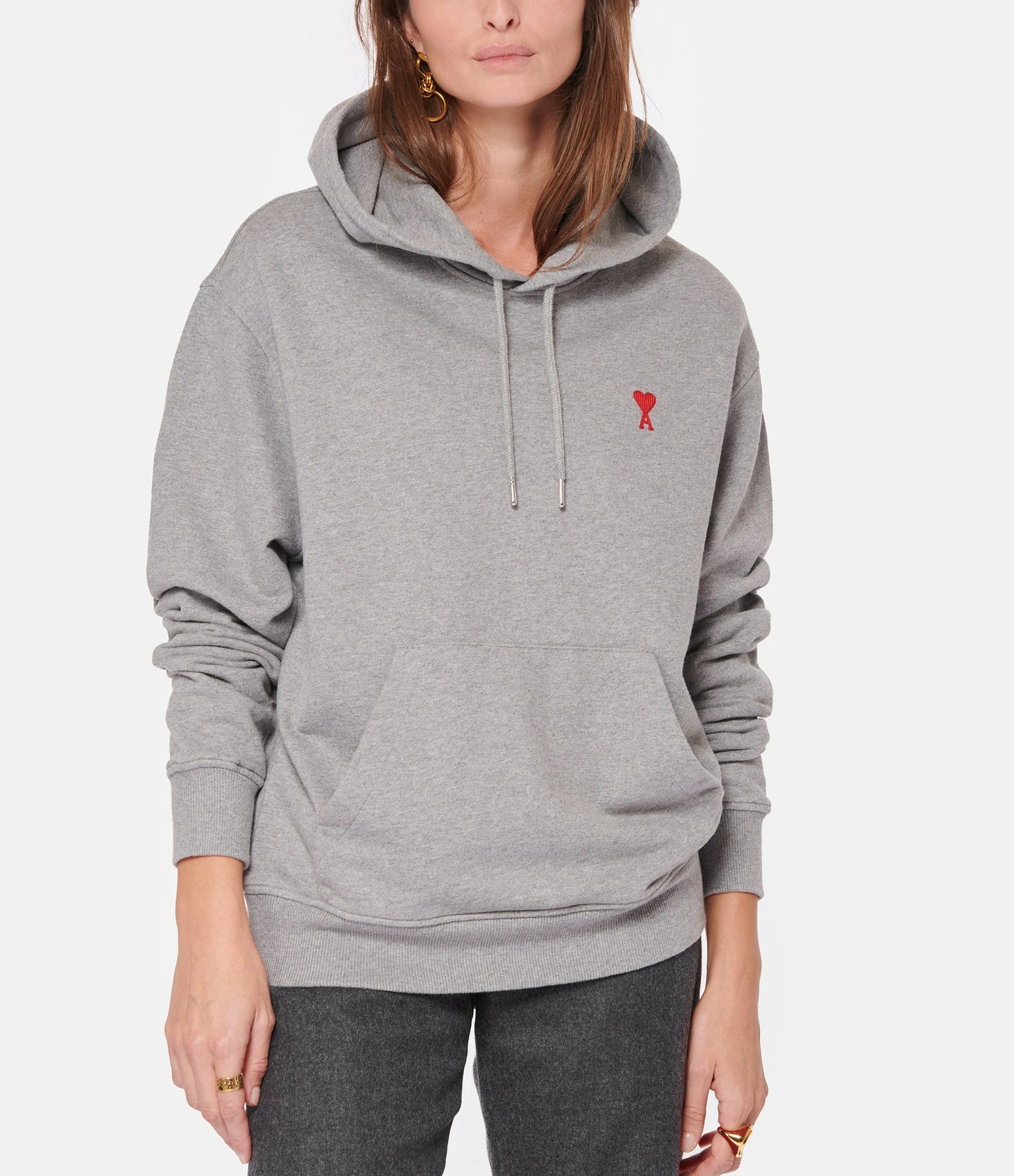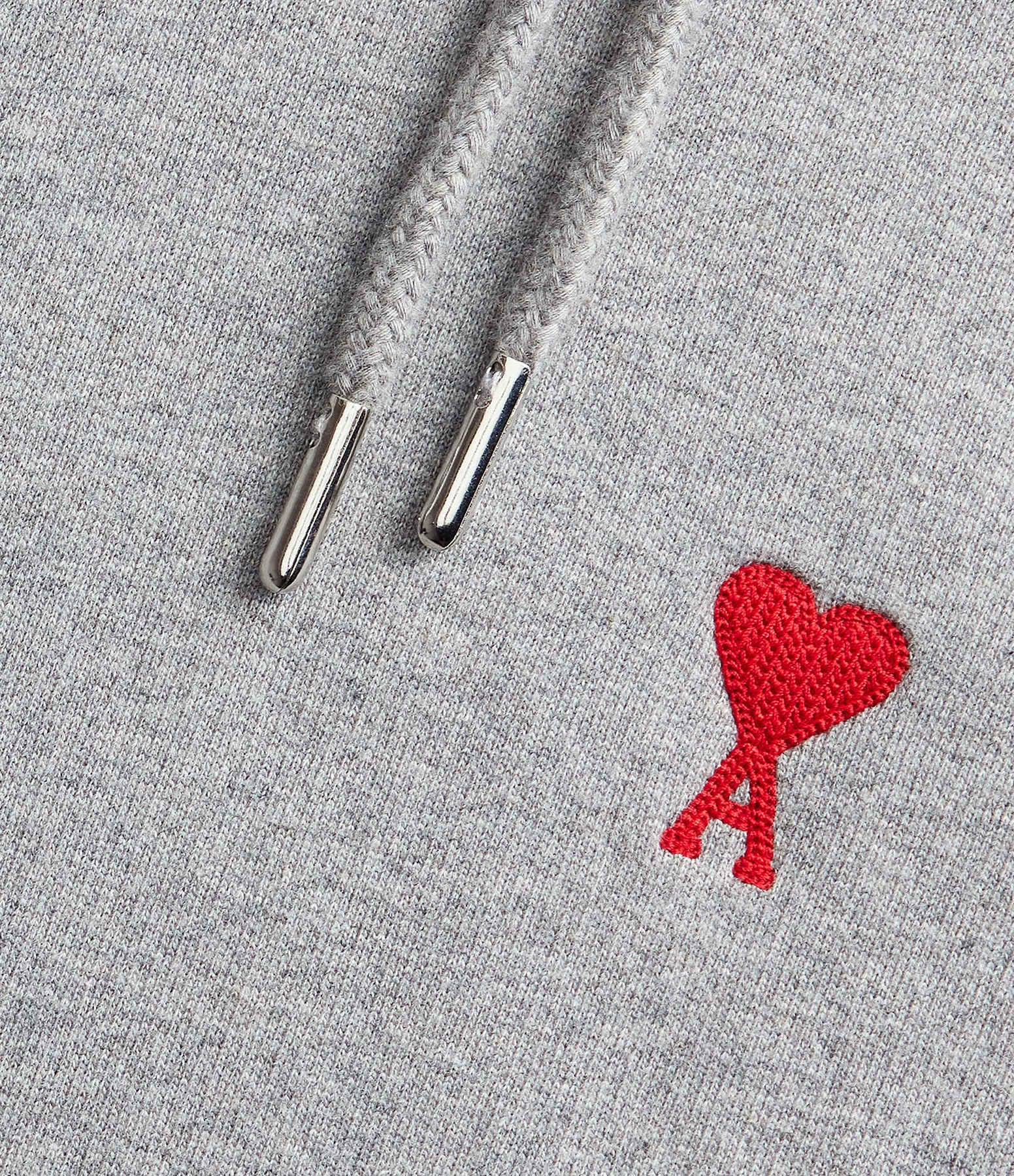 Sweatshirt à capuche en coton molletonné gris chiné. Col rond. Broderie logo “Ami de cœur” rouge sur la poitrine. Broderie “AMI” ton sur ton sous encolure dos. Une poche kangourou sur le devant. Manches longues avec poignets côtelés. Base droite côtelée. Coupe droite.