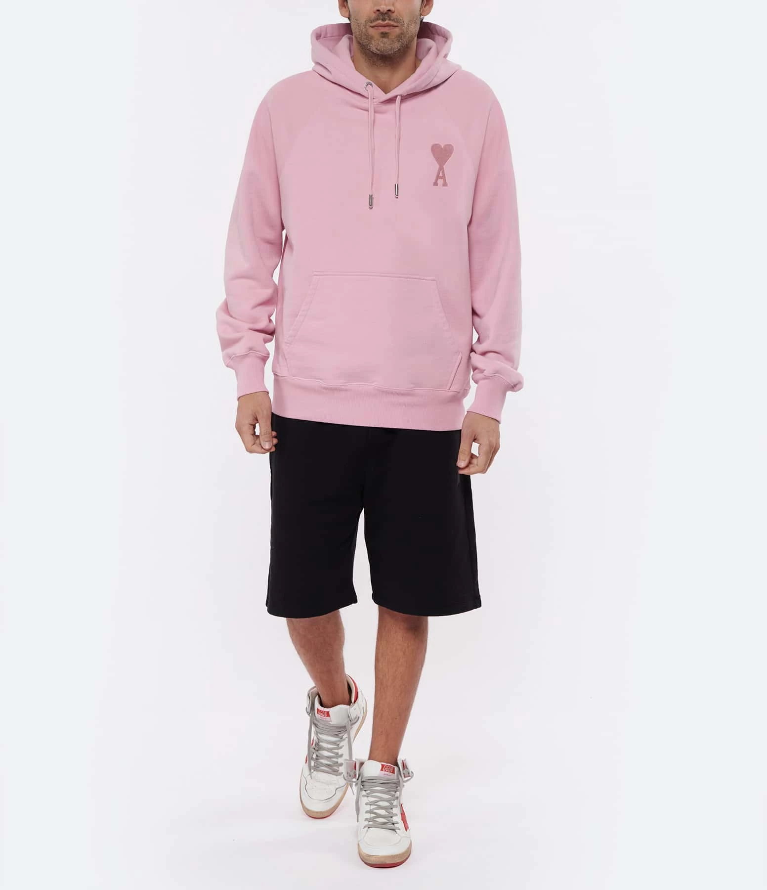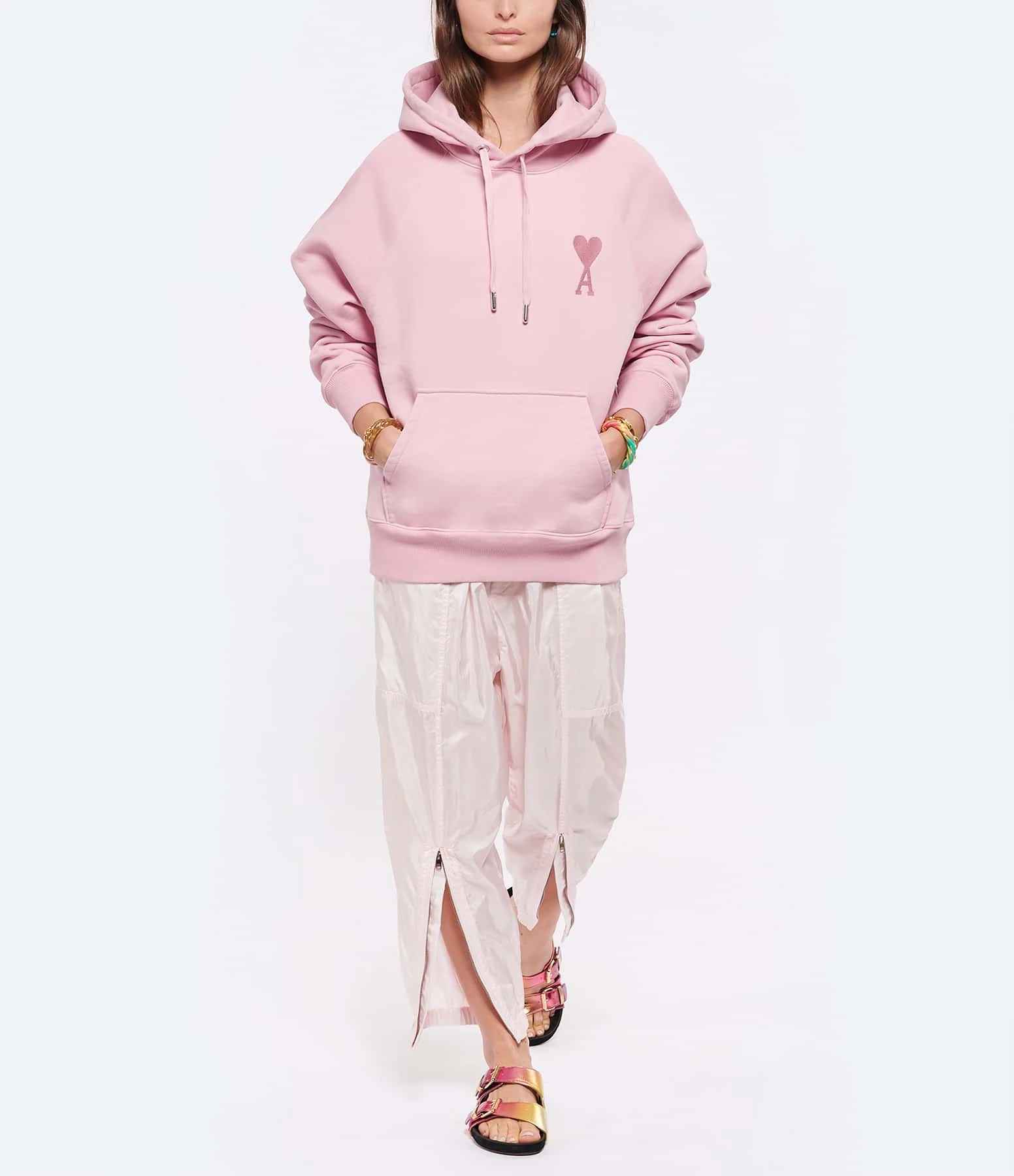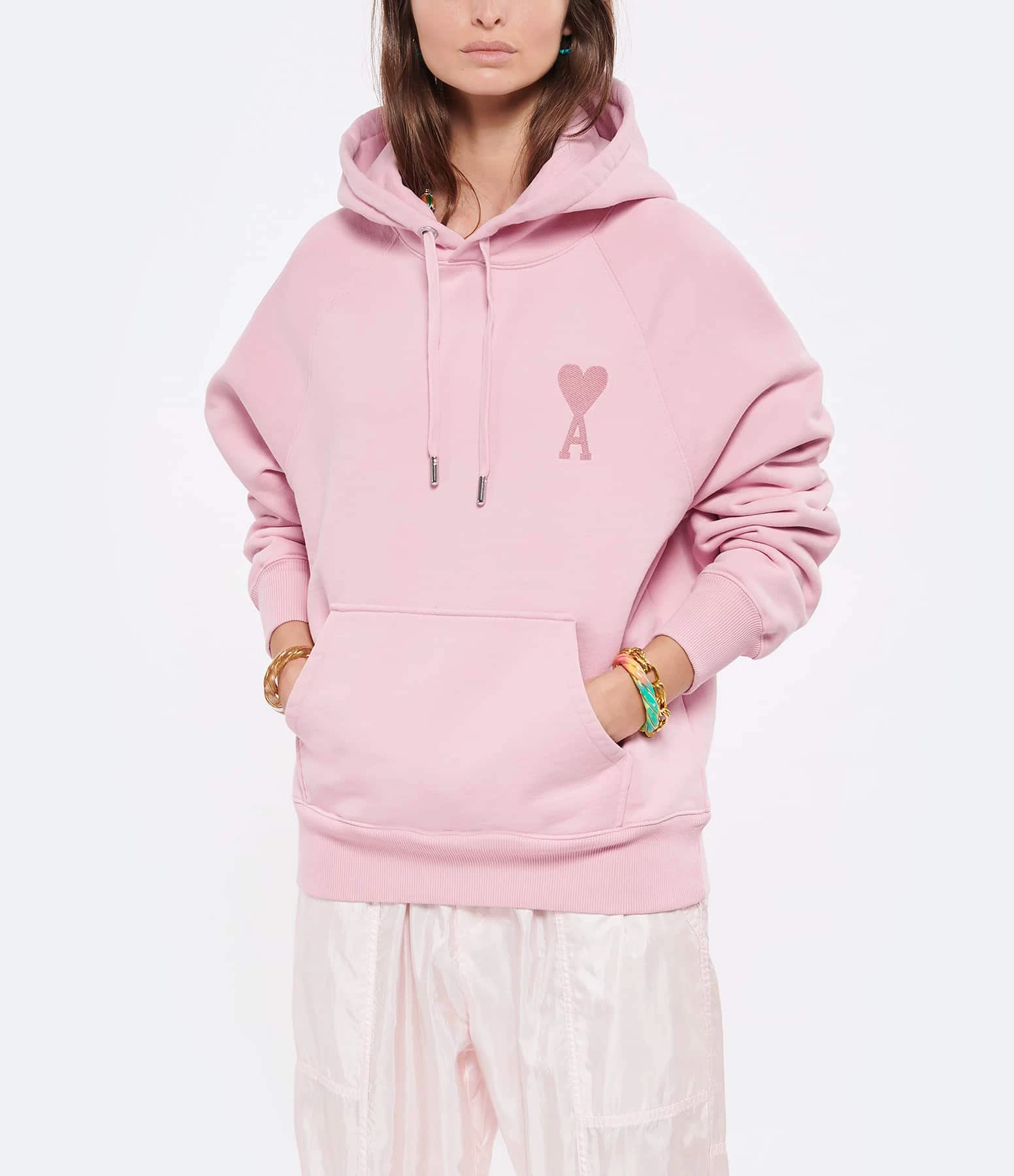 Sweatshirt à capuche en coton rose. Col rond. Broderie logo “Ami de cœur” ton sur ton sur la poitrine. Broderie “AMI” ton sur ton sous encolure dos. Manches longues. Base droite. Coupe droite.
