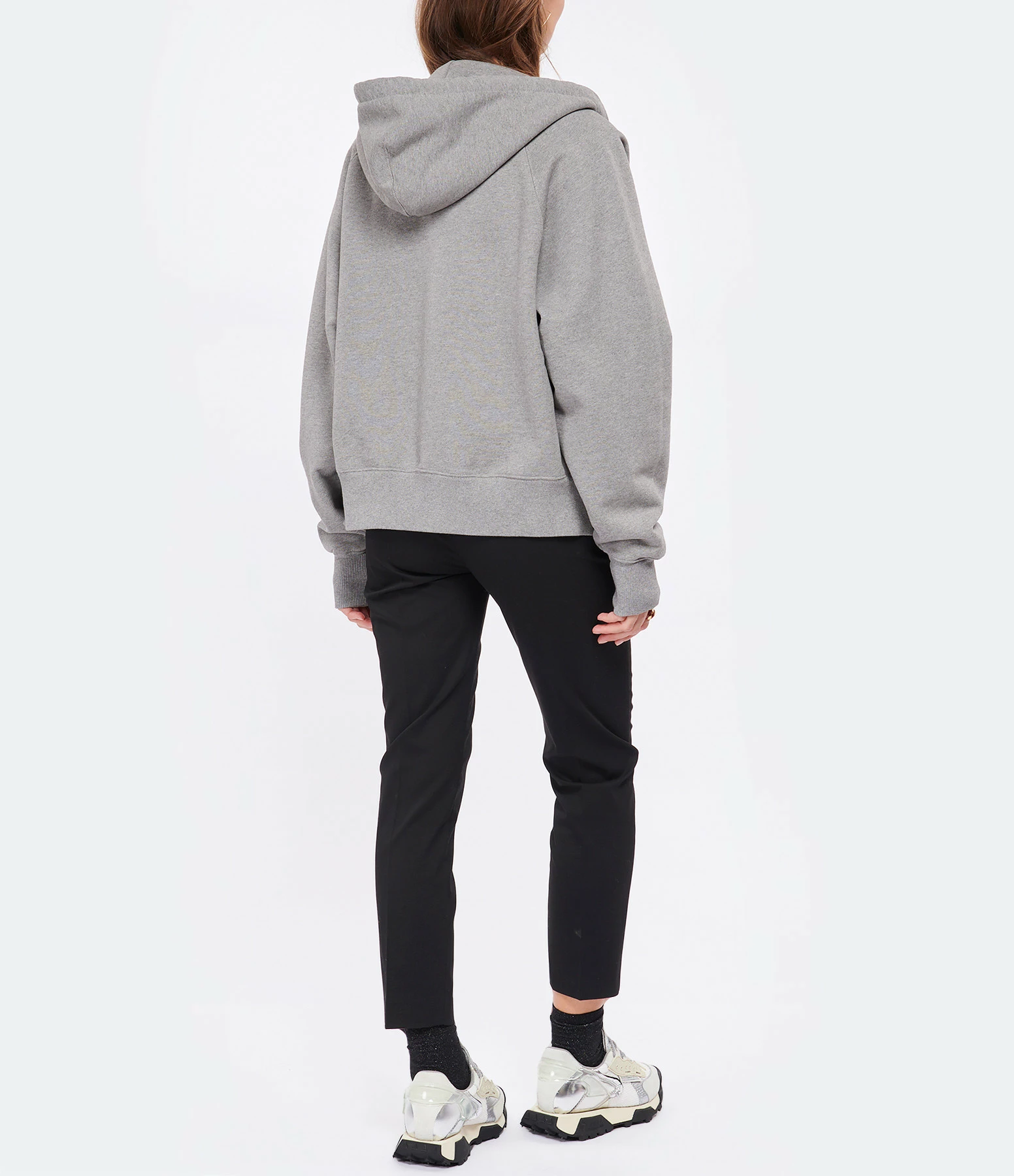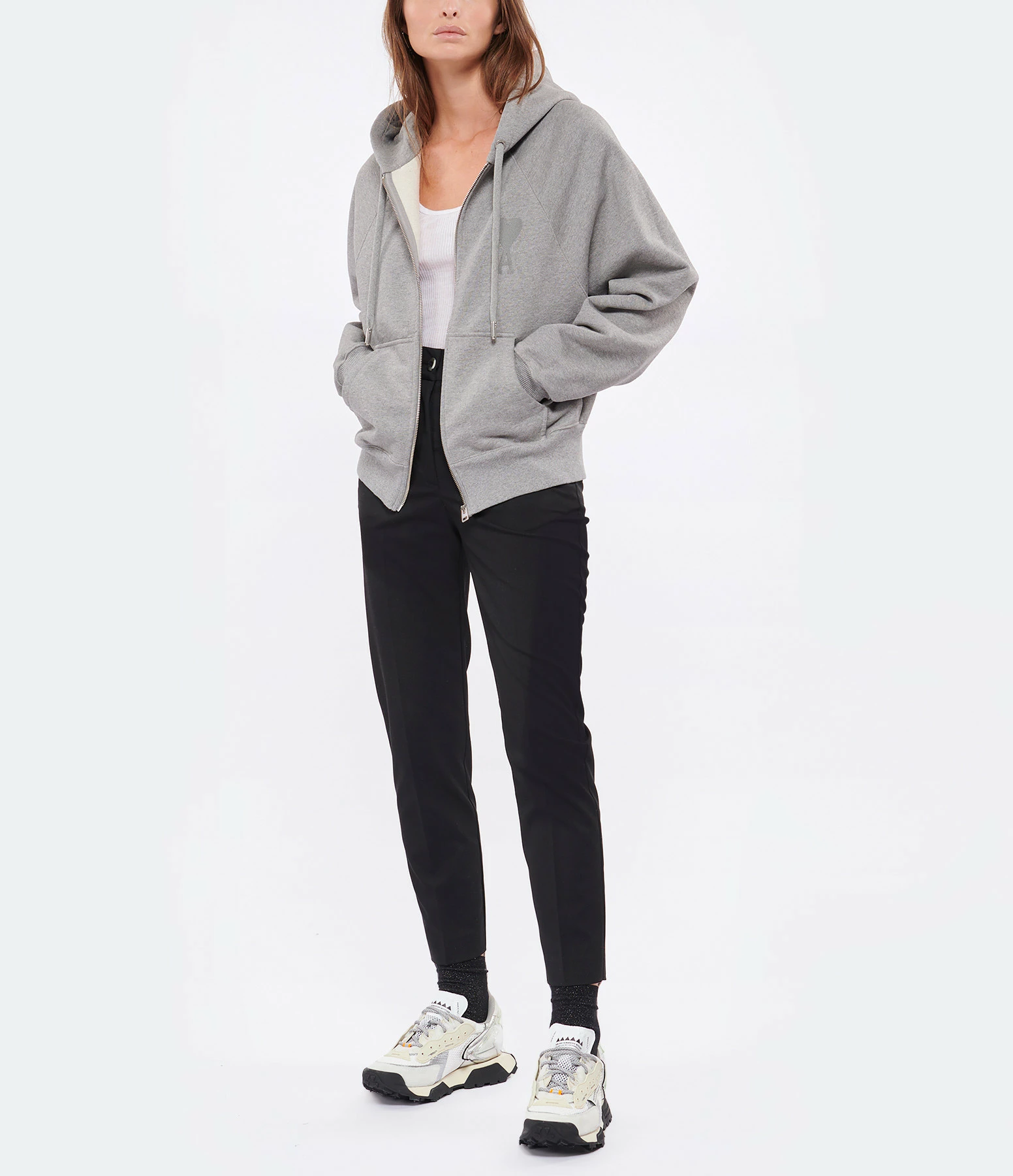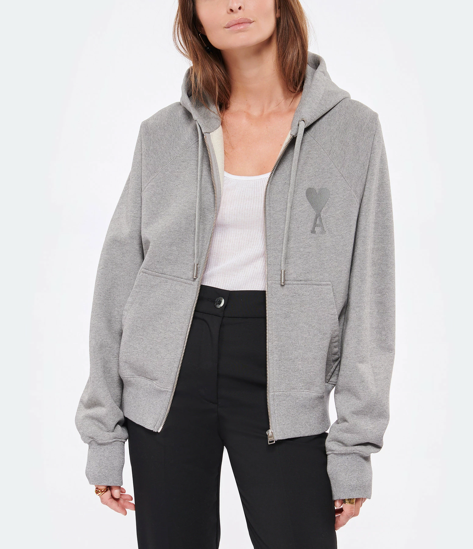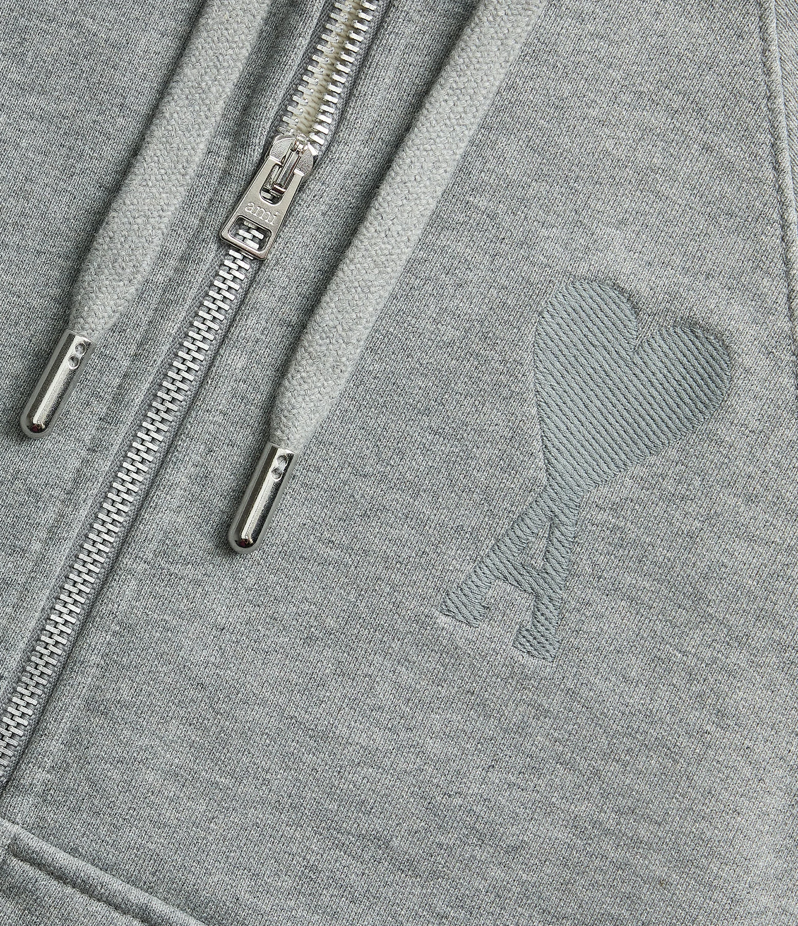 Sweatshirt à capuche en coton molletonné gris chiné orné du logo brodé ton sur ton sur le devant. Inscription “AMI” brodée ton sur ton sous encolure du dos. Col à capuche avec liens de serrage. Manches longues raglans avec poignets côtelés. Fermeture zippée sur le devant. Une poche kangourou sur le devant. Coupe droite. Base droite côtelée.