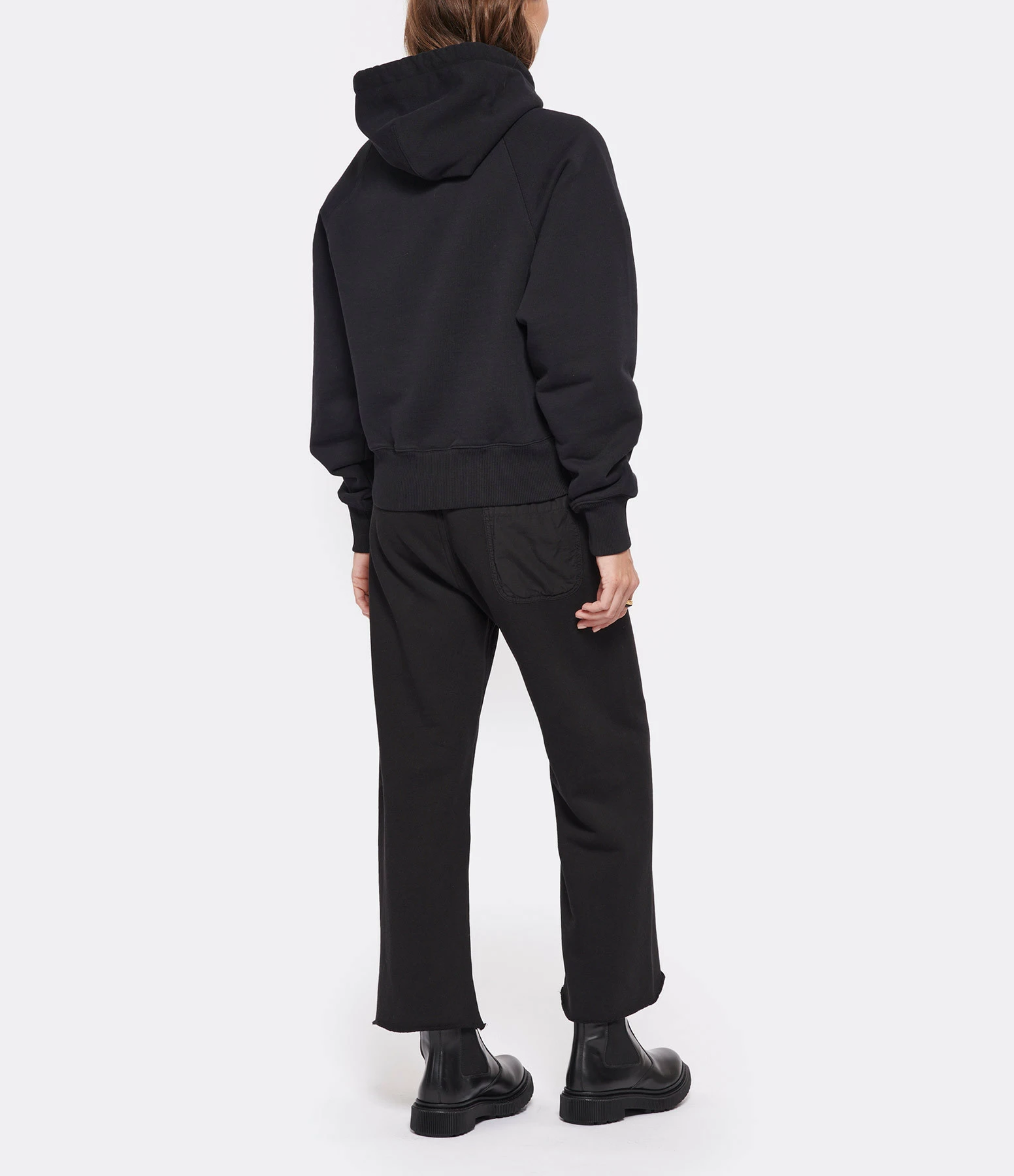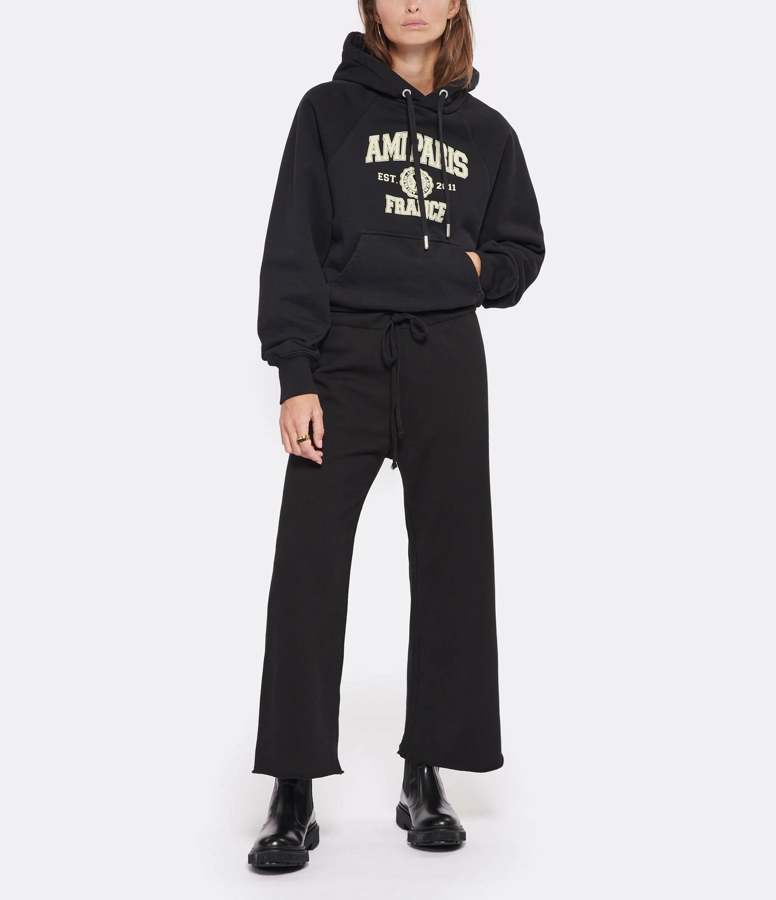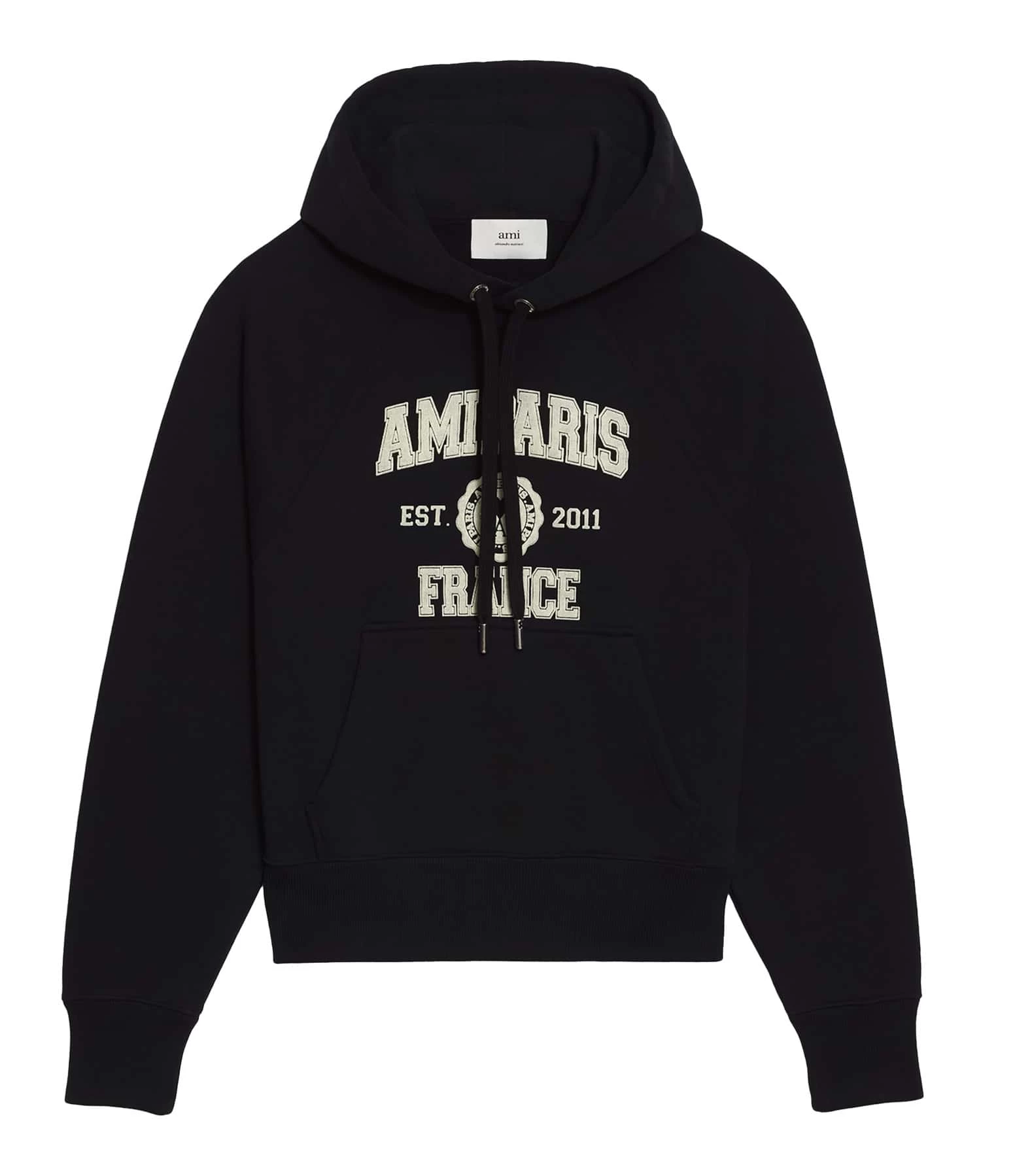 Sweatshirt unisexe en coton molletonné noir. Inscription “AMI PARIS EST 2011 FRANCE” sérigraphié en beige sur le devant. Broderie “AMI” ton sur ton dans le dos. Col à capuche. Manches longues raglans avec poignets côtelés. Une poche kangourou sur le devant. Coupe droite. Base droite.
