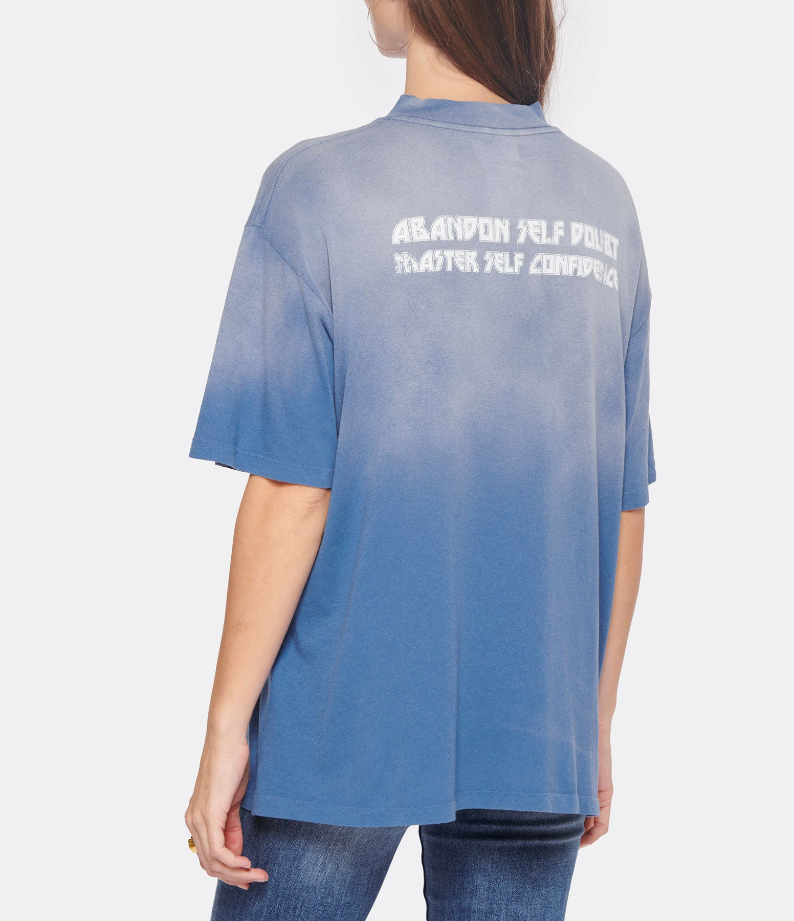Tee-shirt en coton bleu délavé sérigraphié. Col rond. Manches courtes. Inscriptions en blanc à l’avant et à l’arrière. Coupe droite. Base droite. Non doublé.