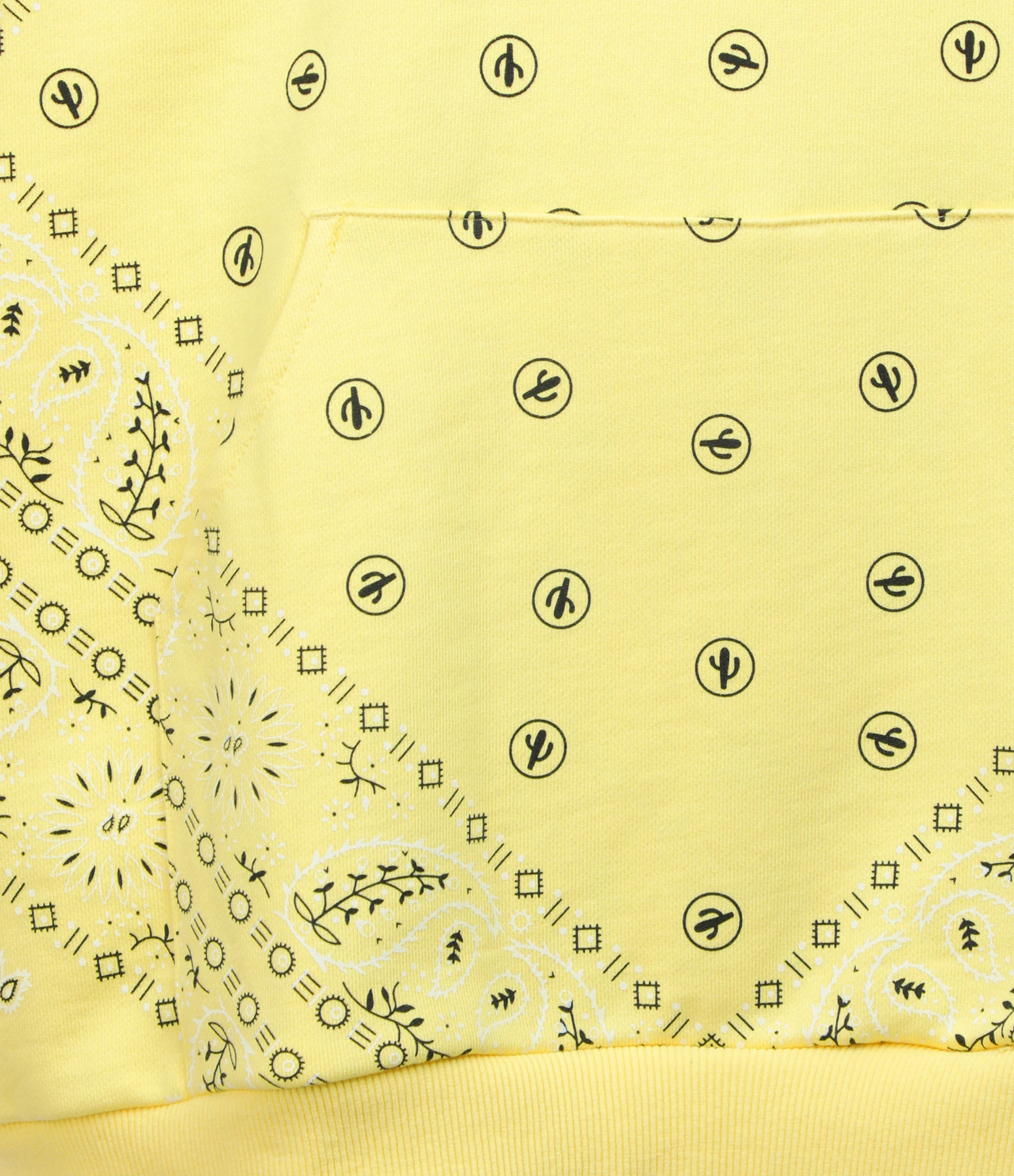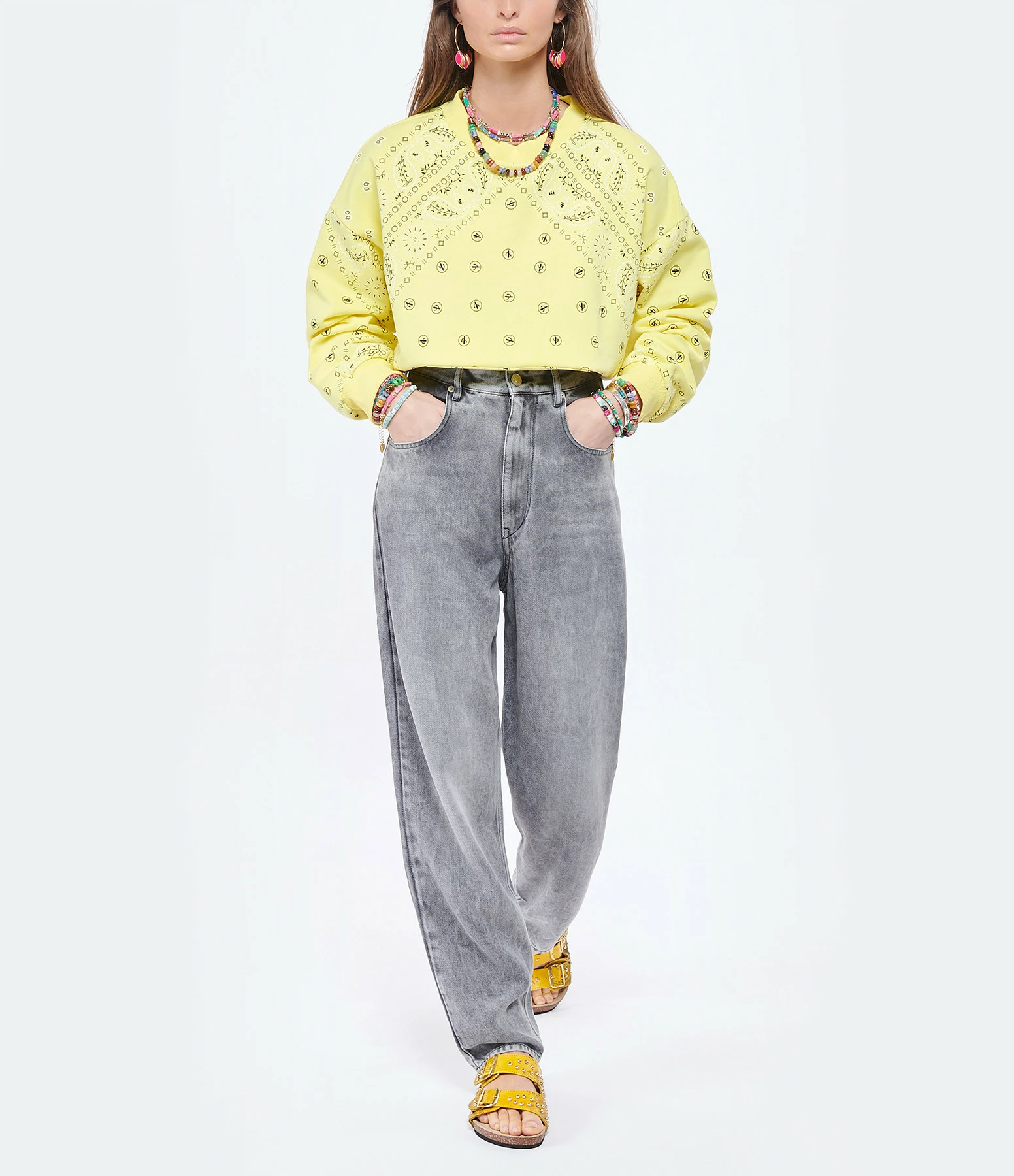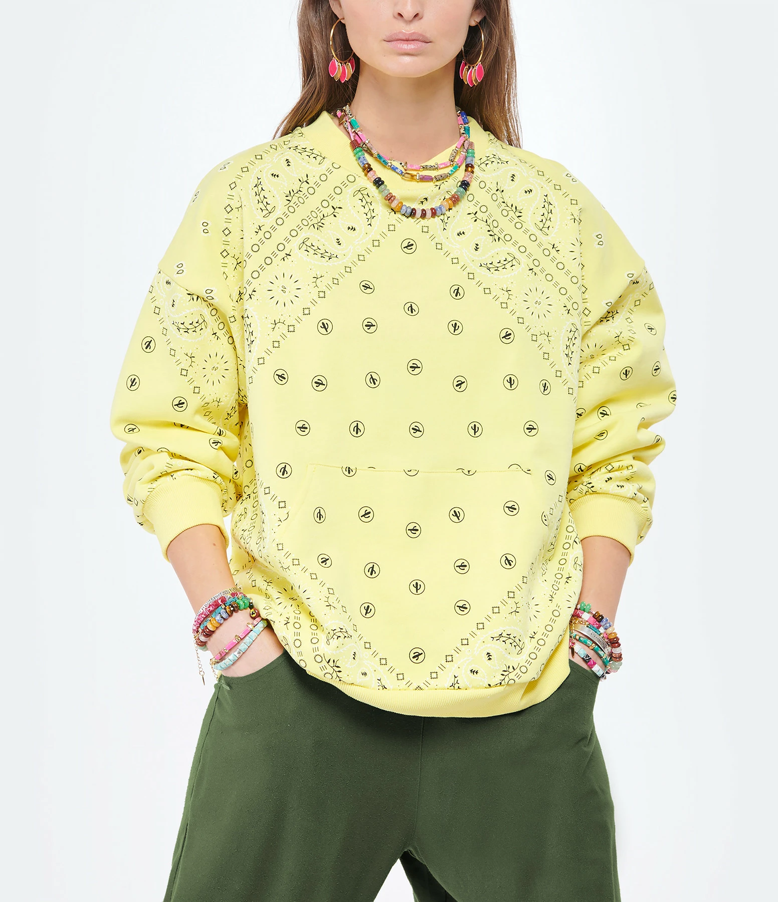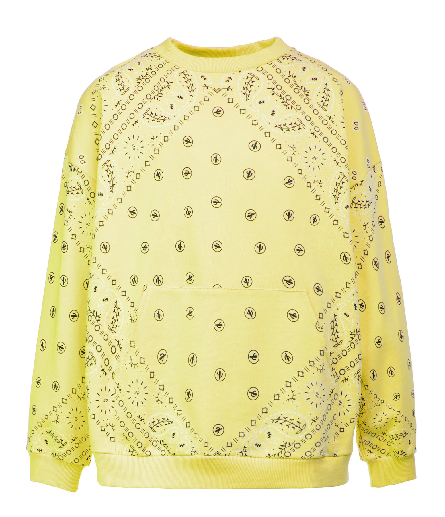 Sweatshirt en coton jaune à motif bandana. Col arrondi. Manches longues. Poche sur l’avant. Coupe ample. Base droite.