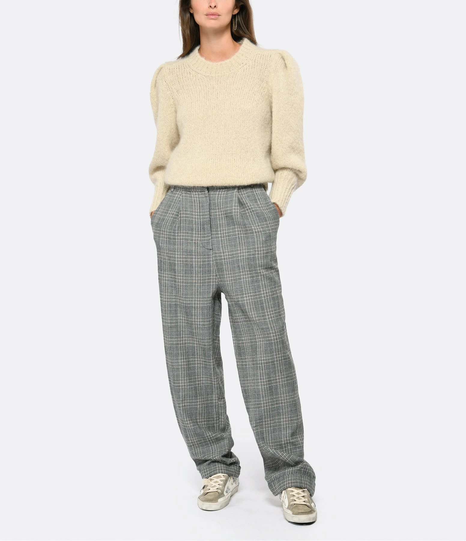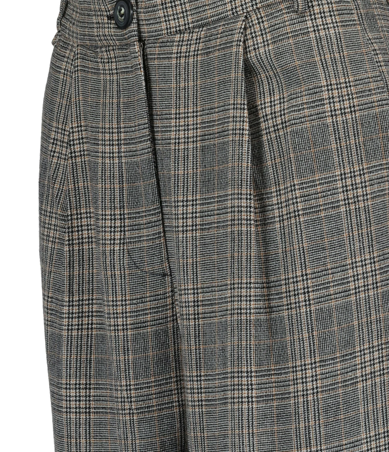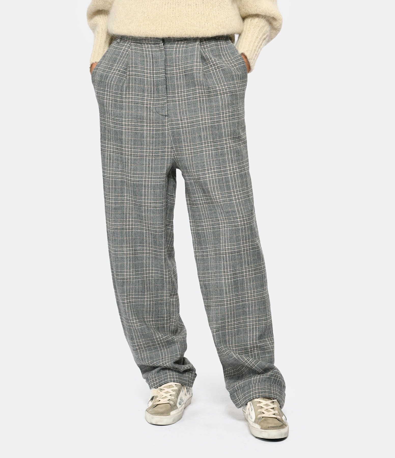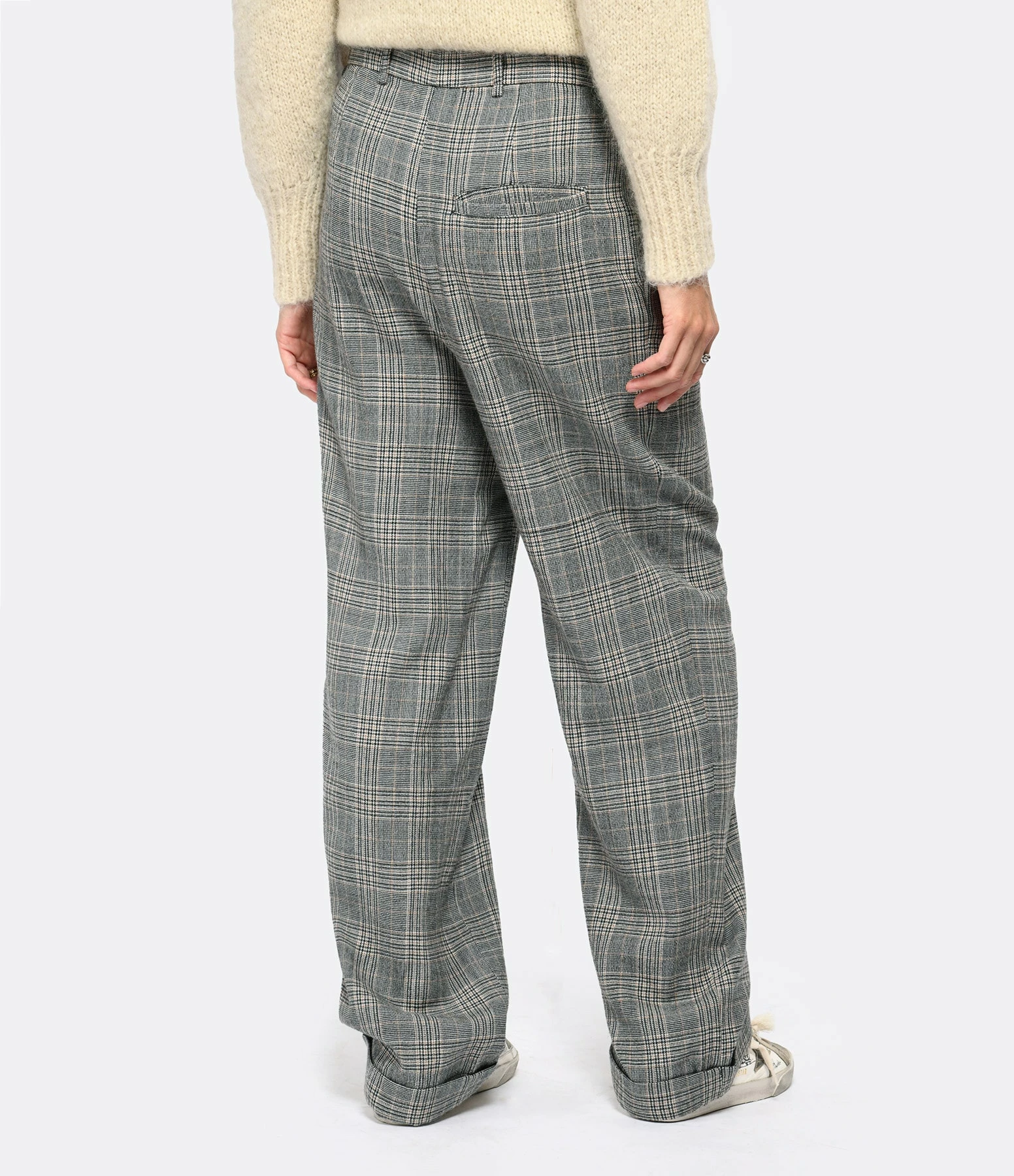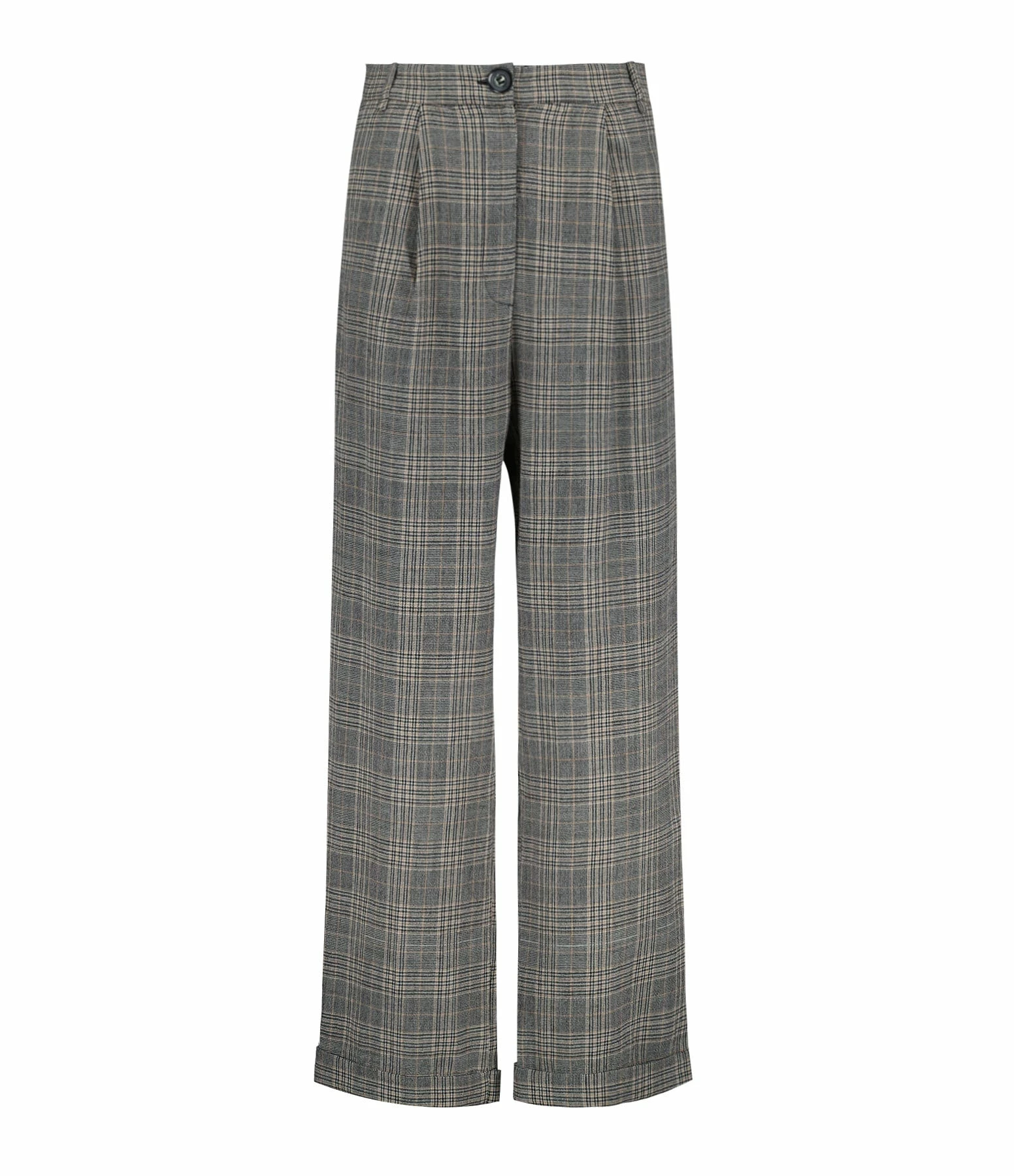 Pantalon à pinces en laine prince-de-galles. Taille haute avec passants pour ceinture. Élastique de serrage intérieure pour ajuster la taille. Fermeture zippée cachée sous la braguette et boutonnée sur le devant. Bouton effet corne. Deux poches italiennes sur le devant. Une poche passepoilée dans le dos. Coupe droite. Base droite avec ourlet rabattu.