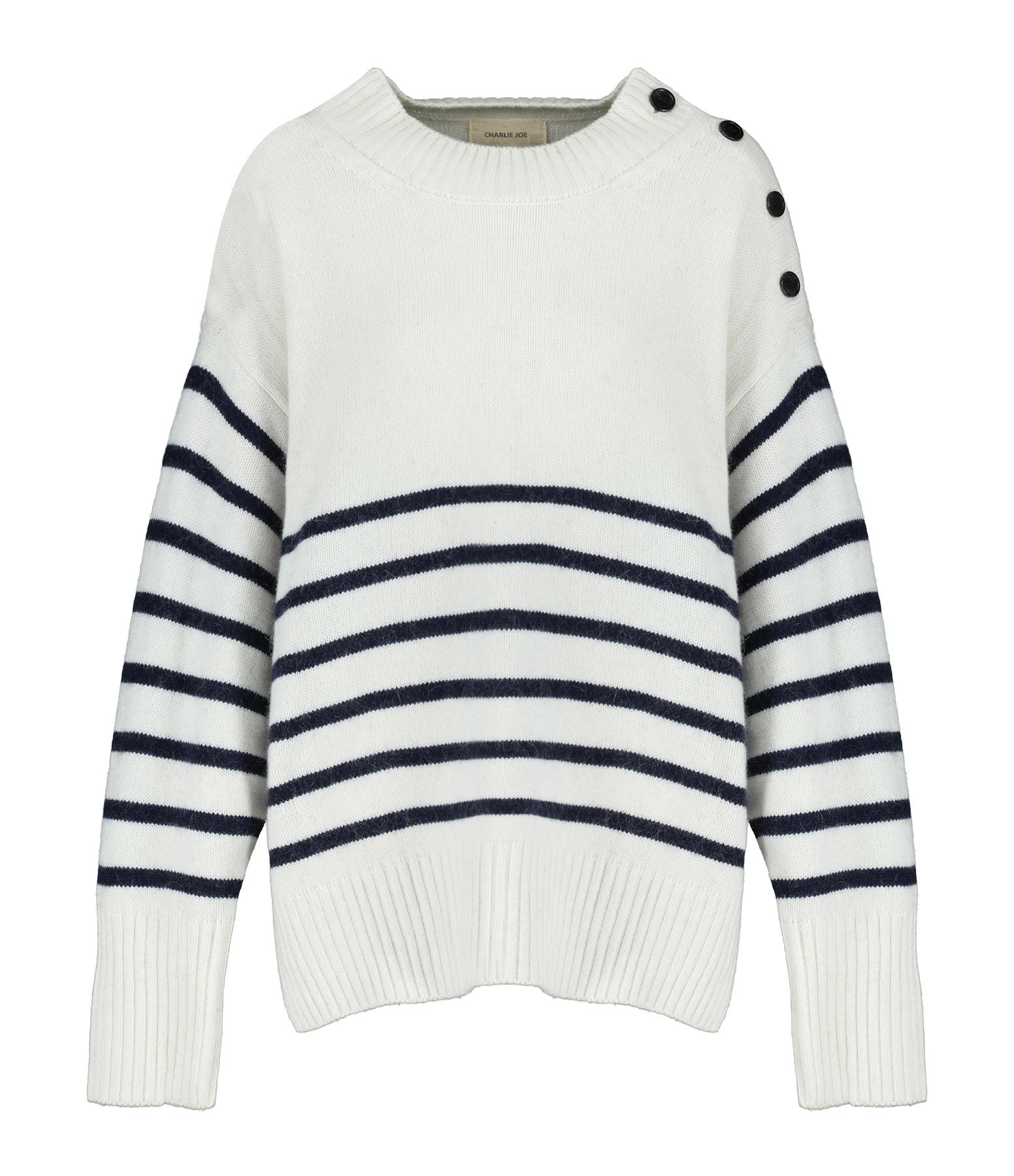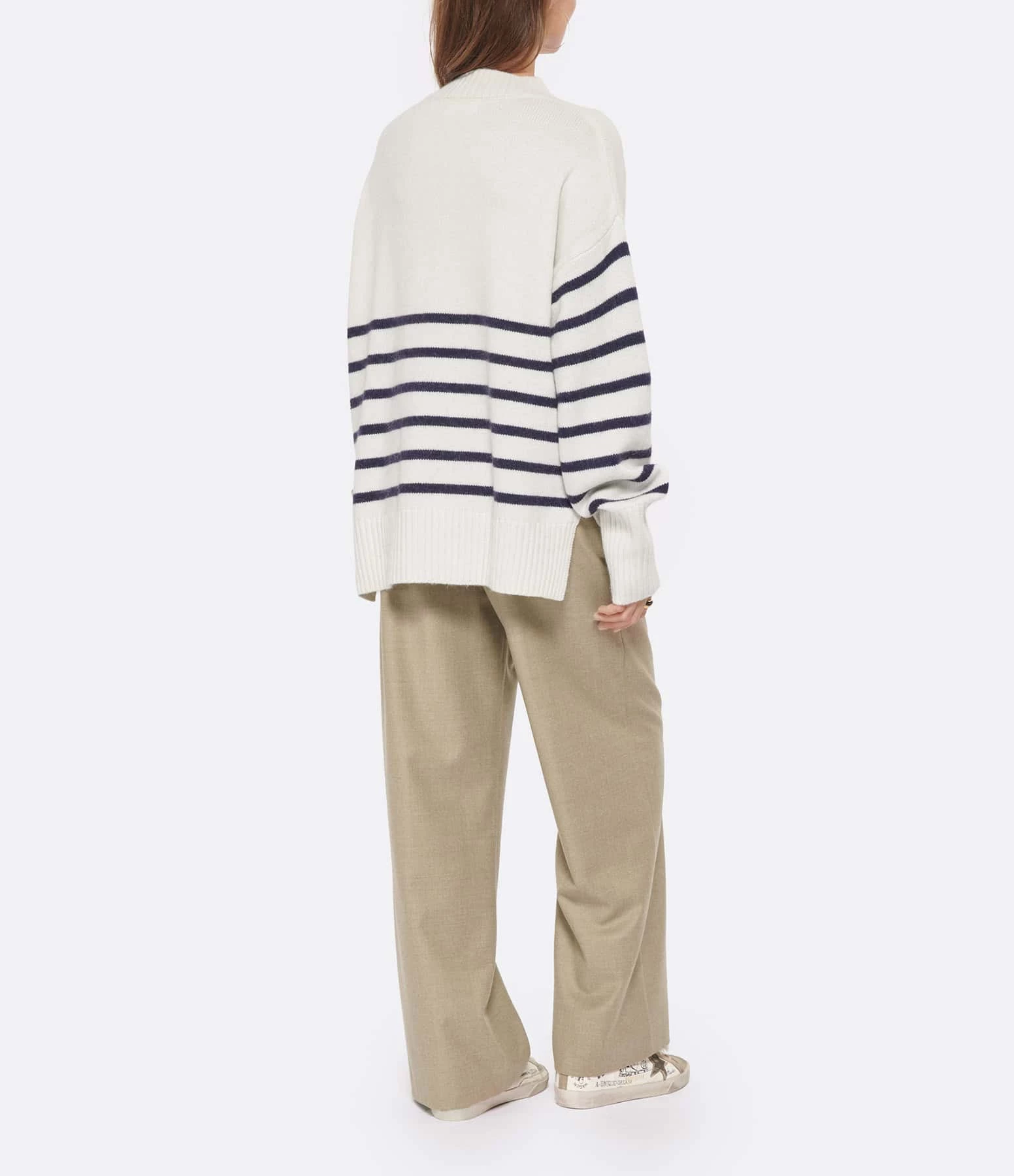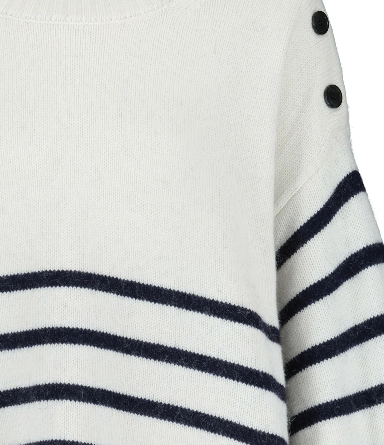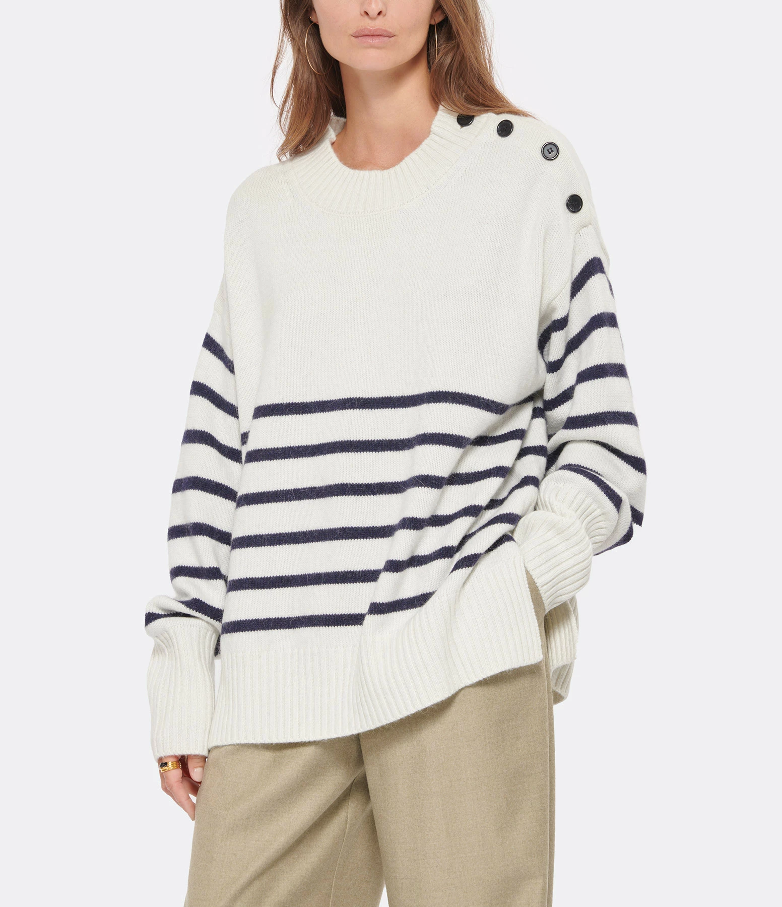 Pull en laine blanc à rayures bleu marine. Col rond avec boutons au niveau des épaules. Coupe ample. Base droite côtelée.