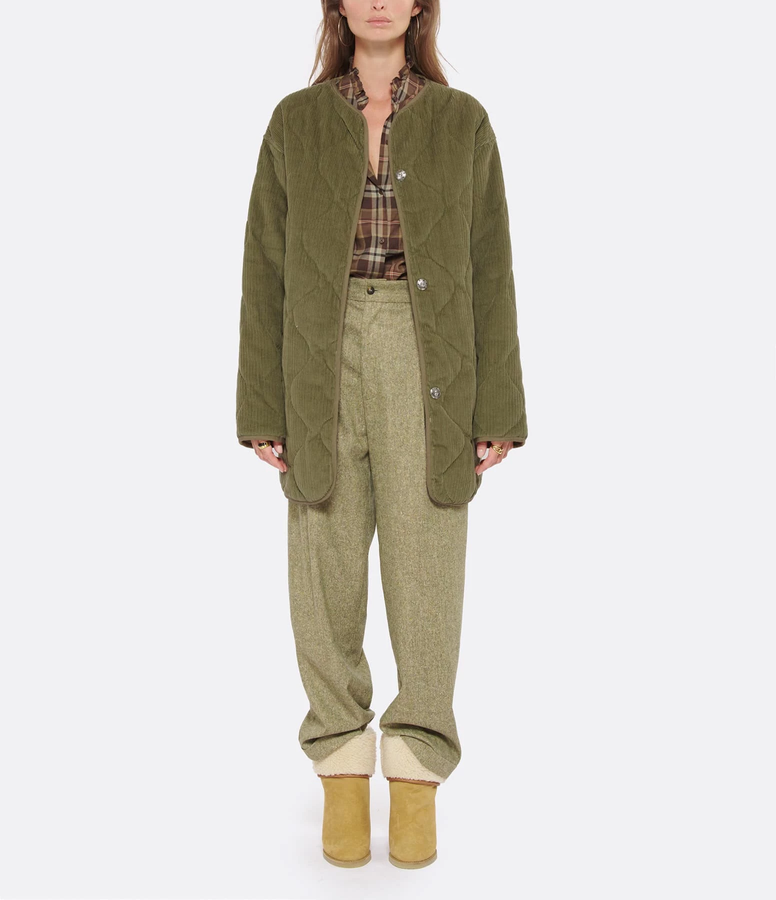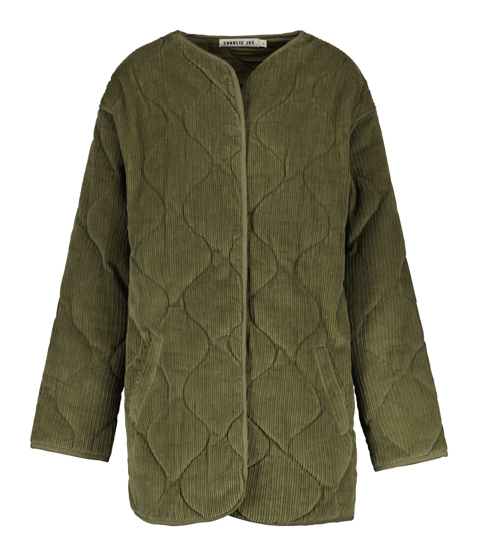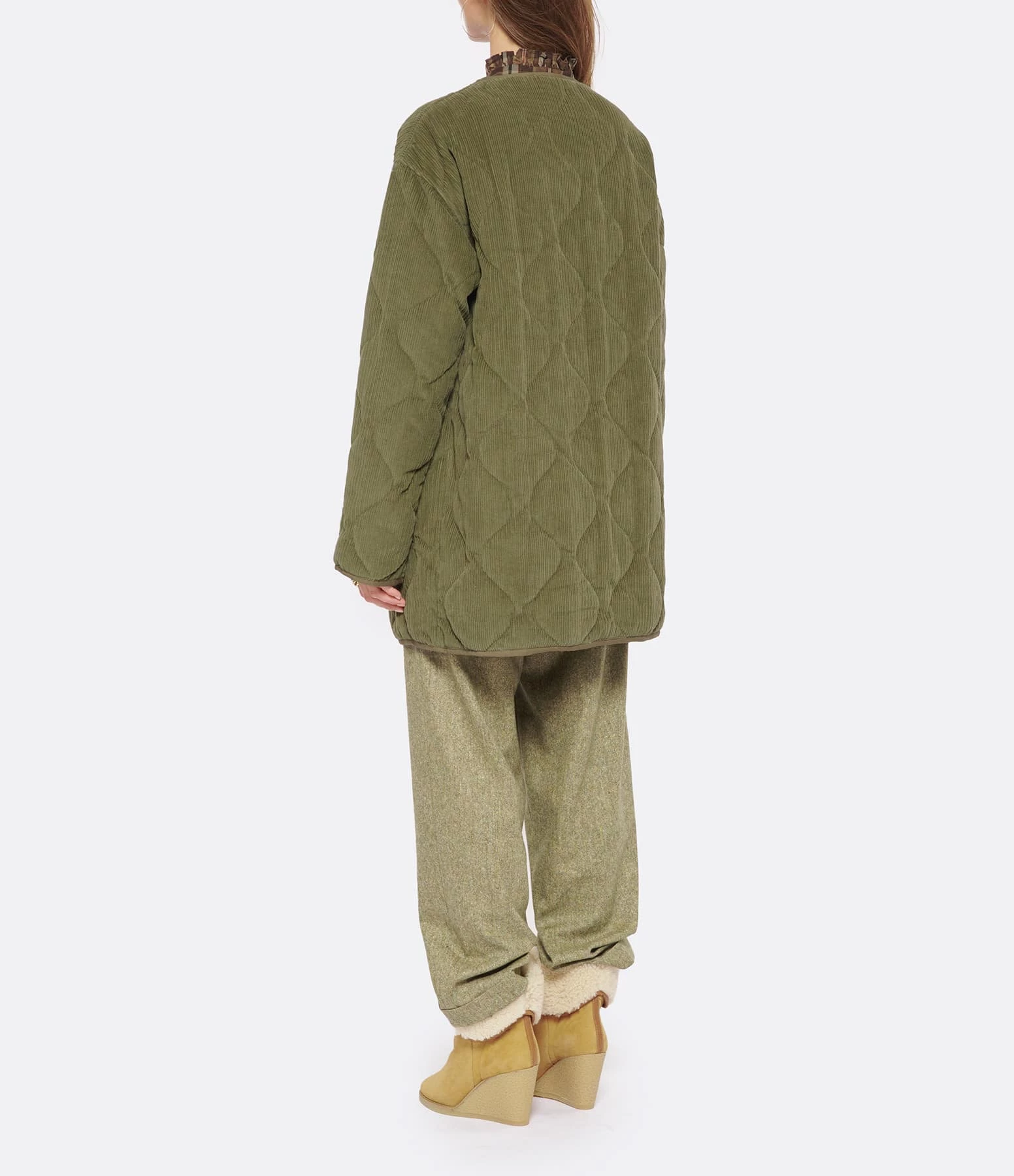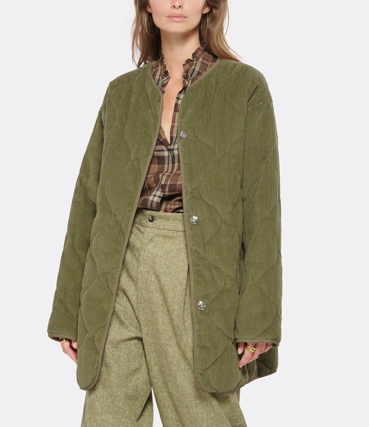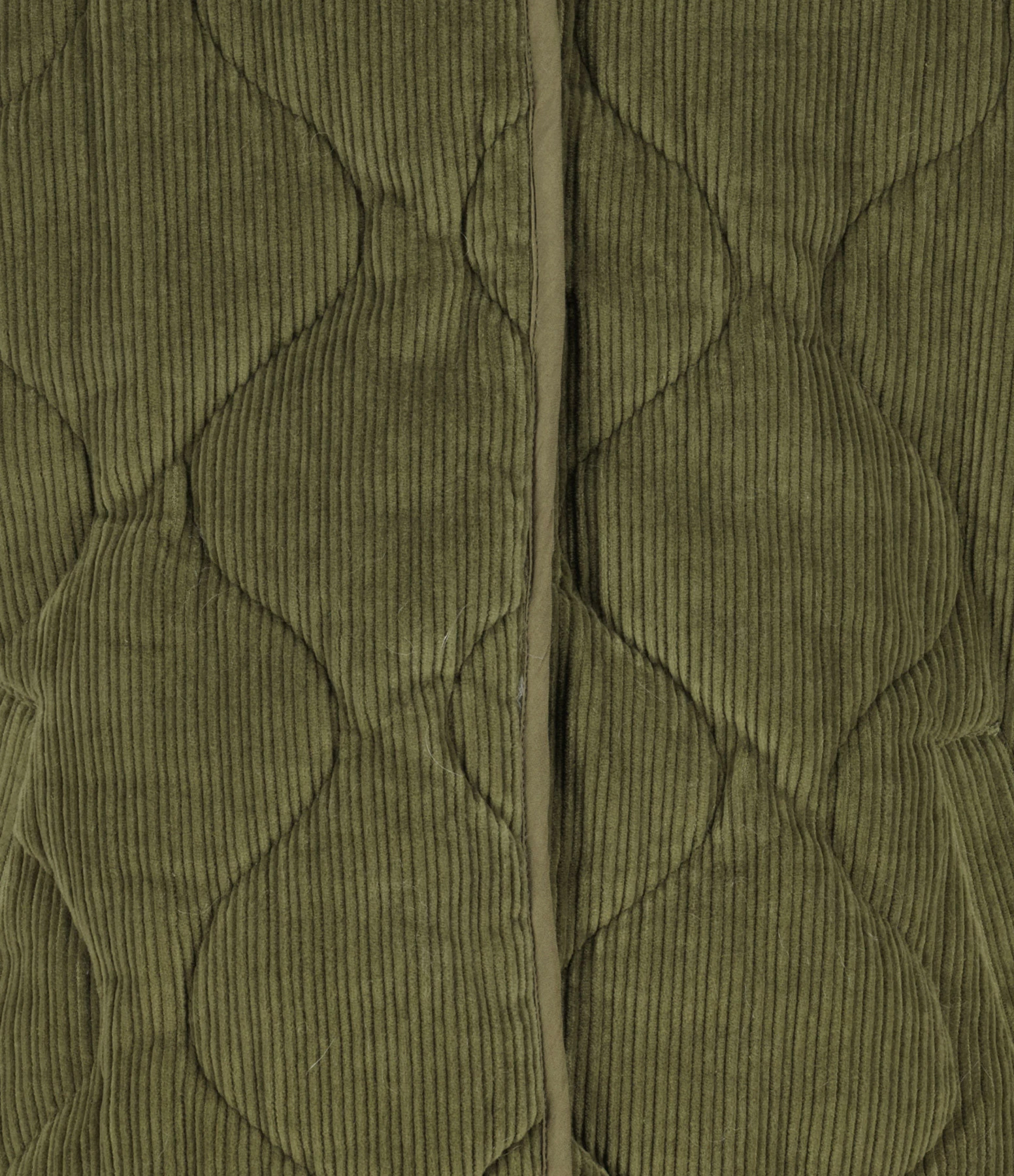 Veste mi-longue matelassée en velours côtelé de coton kaki. Col rond. Manches longues. Fermeture pressionnée sur le devant. Deux poches raglans sur le devant. Coupe droite. Base arrondie. Doublée.
