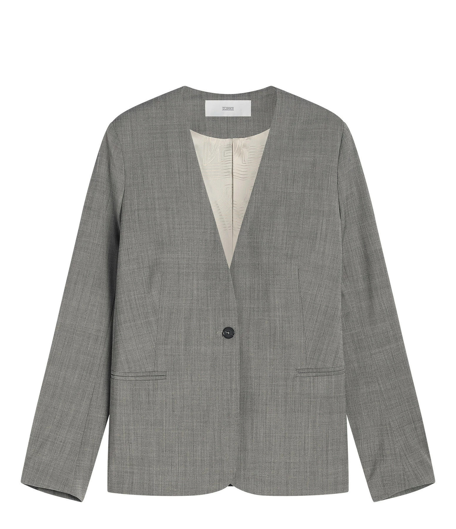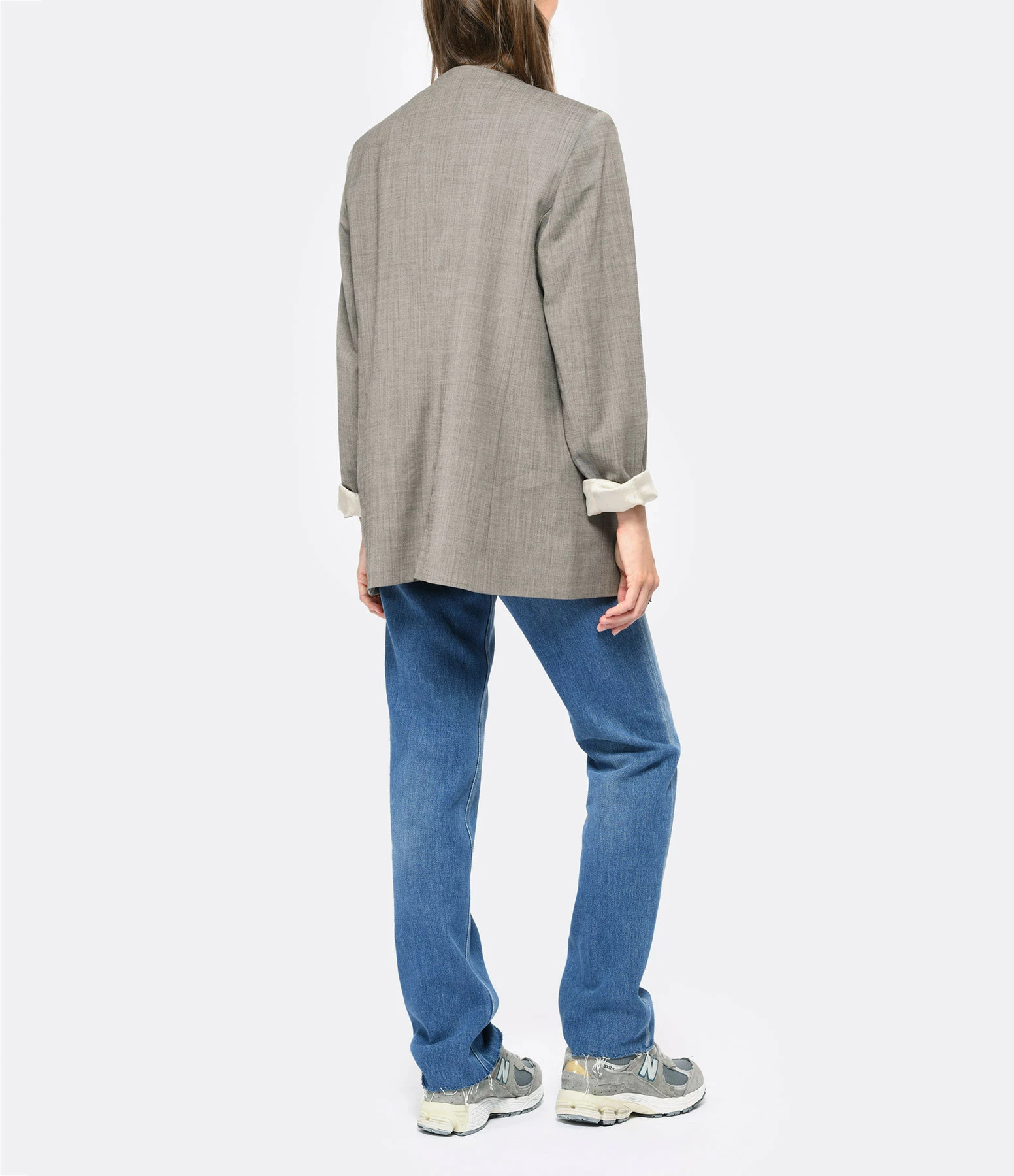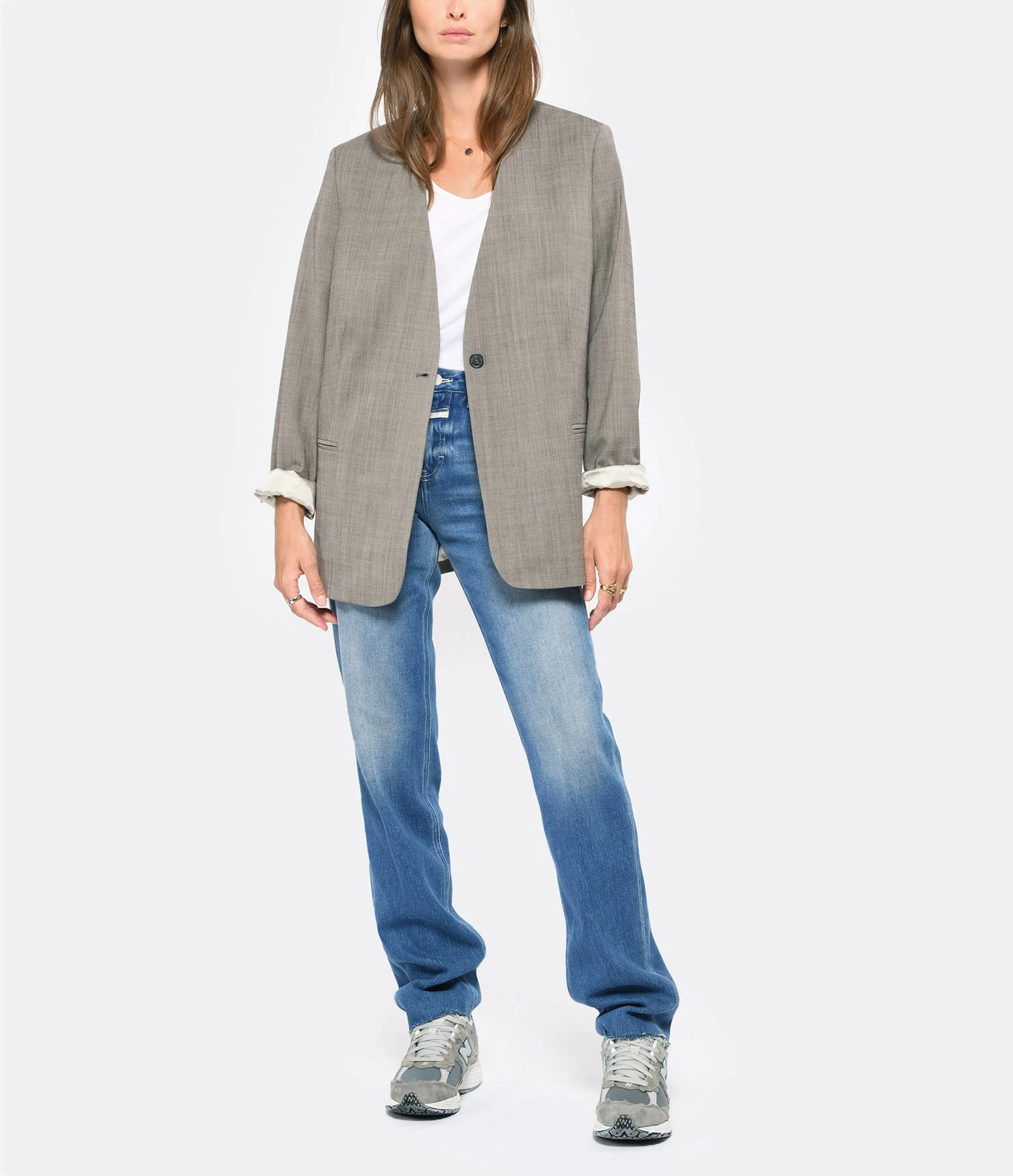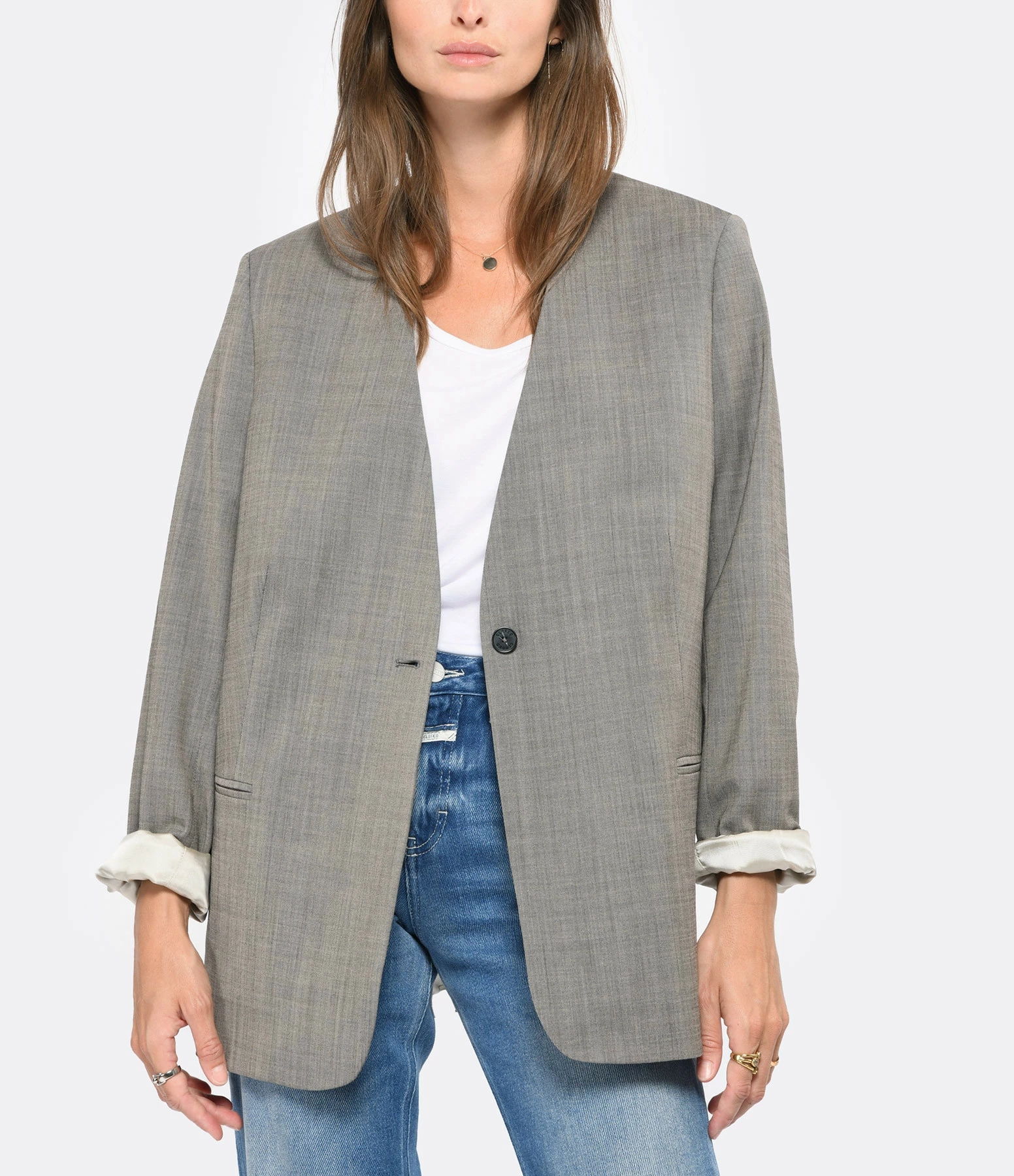 Veste blazer en laine mélangée grise. Encolure en V. Manches longues tailleur avec fentes. Épaulettes. Fermeture boutonnée simple sur le devant. Bouton noir gravé du logo. Deux poches passepoilées sur le devant. Une poche passepoilée à rabat intérieure. Une fente milieu dos. Coupe droite. Base arrondie. Doublée.
