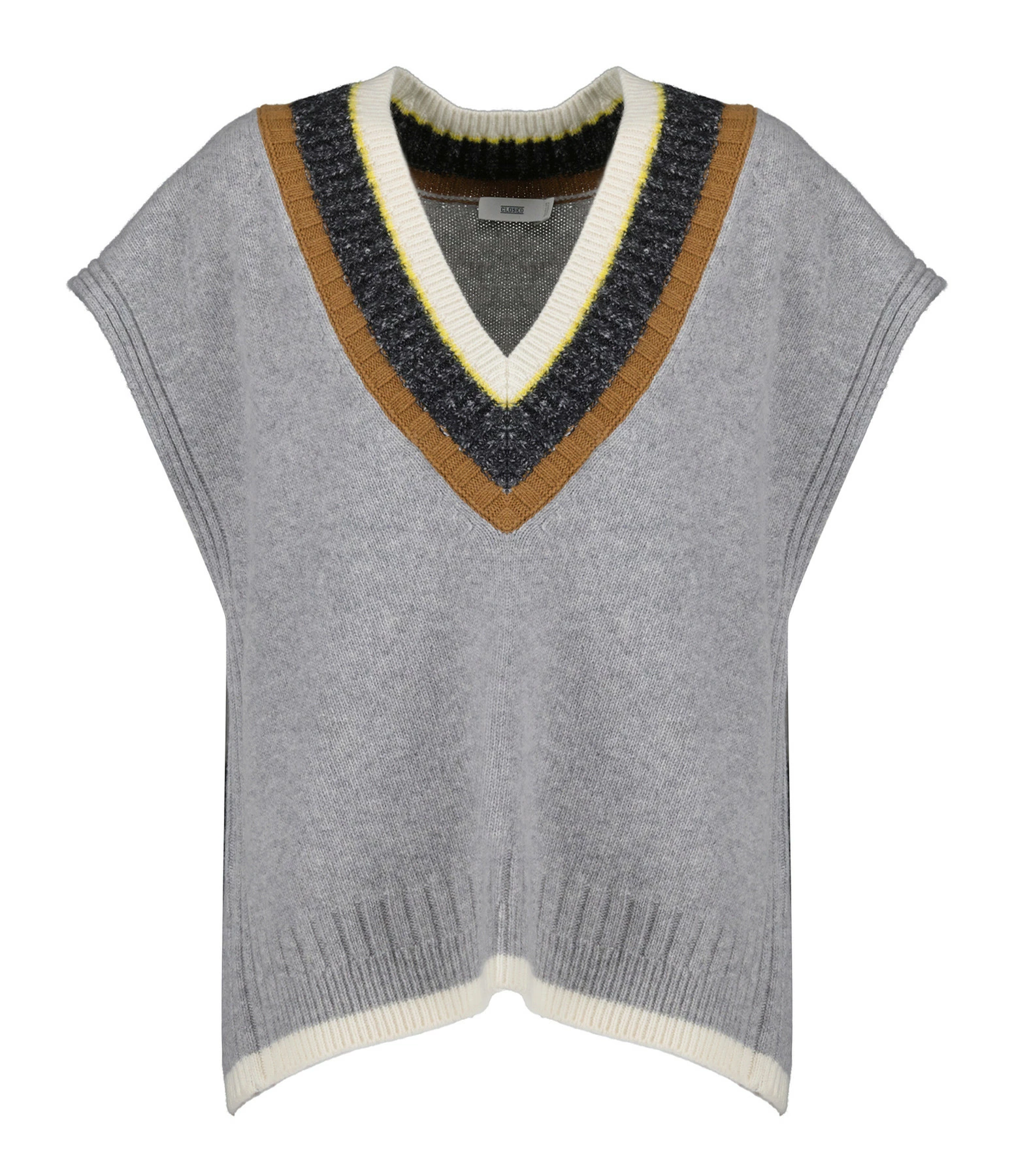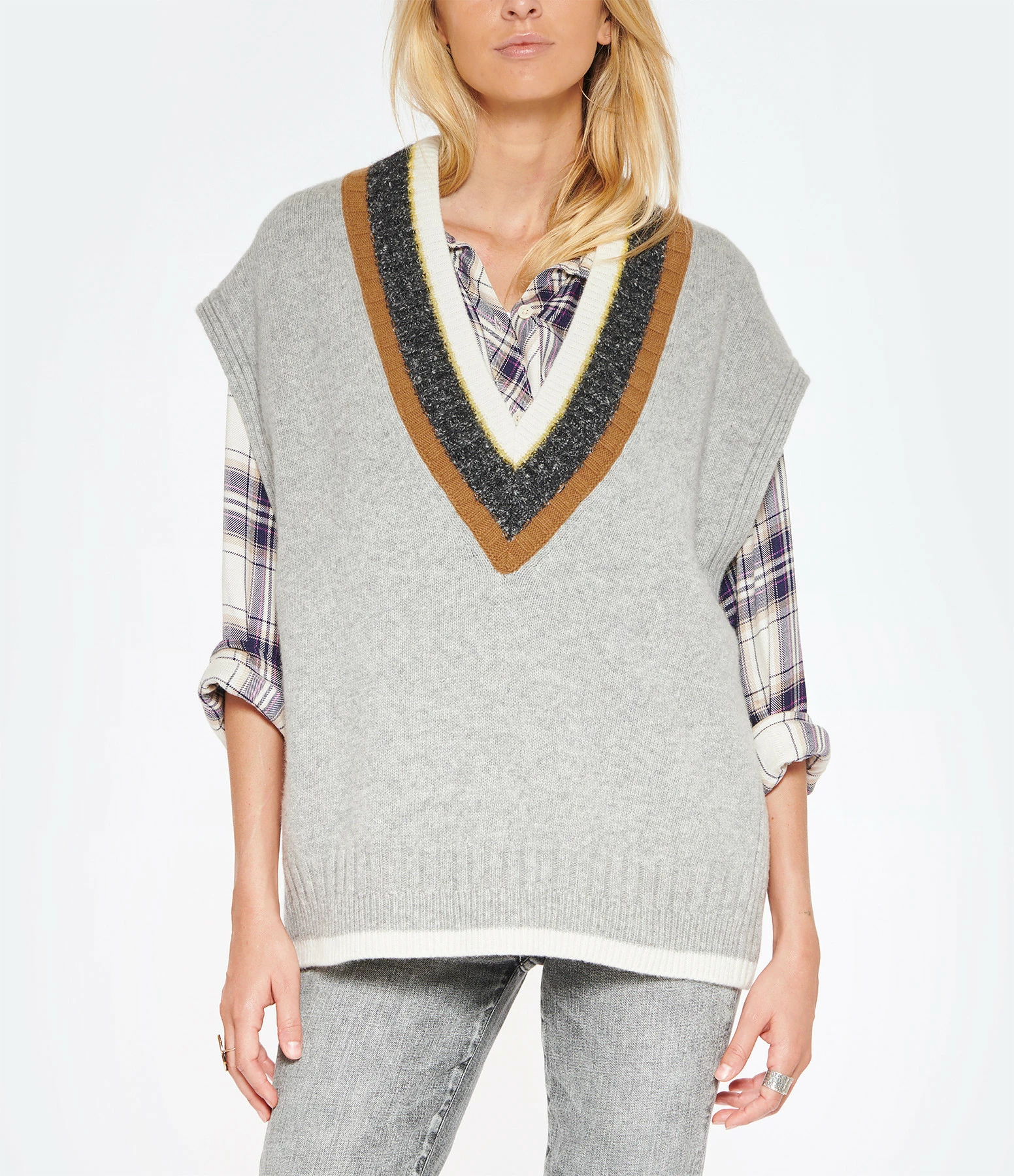 contrastantes : marron, gris anthracite chiné, jaune et écru. Col en V côtelé. Sans manches. Emmanchures côtelées. Coupe ample. Base droite côtelée soulignée par une bande écrue.