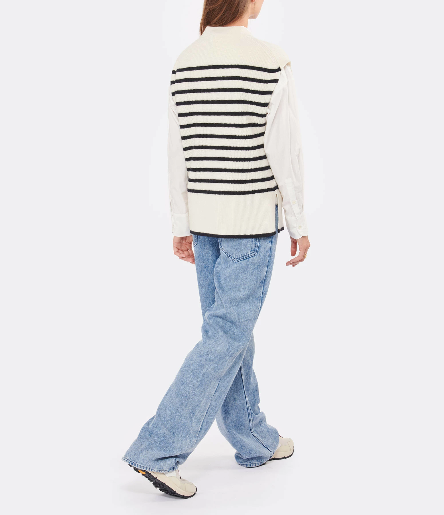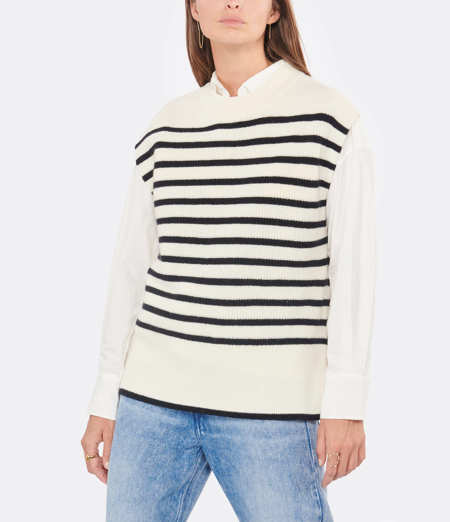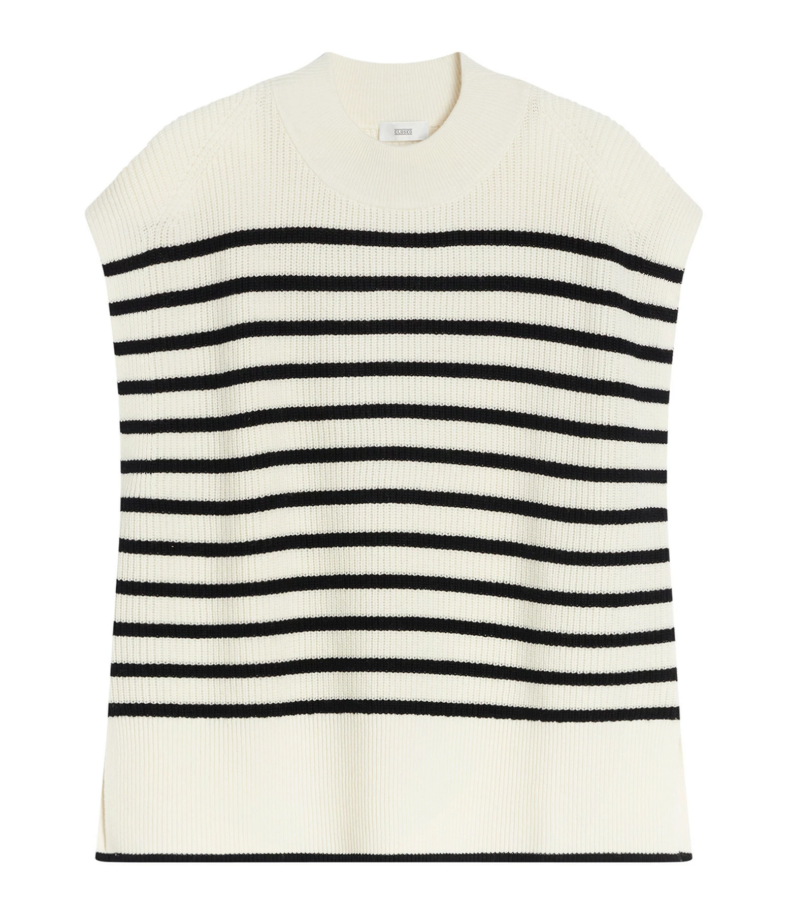 Pull en laine mélangée rayé noir et blanc. Col rond côtelée. Sans manches. Fentes latérales. Coupe droite ample. Base droite côtelée.
