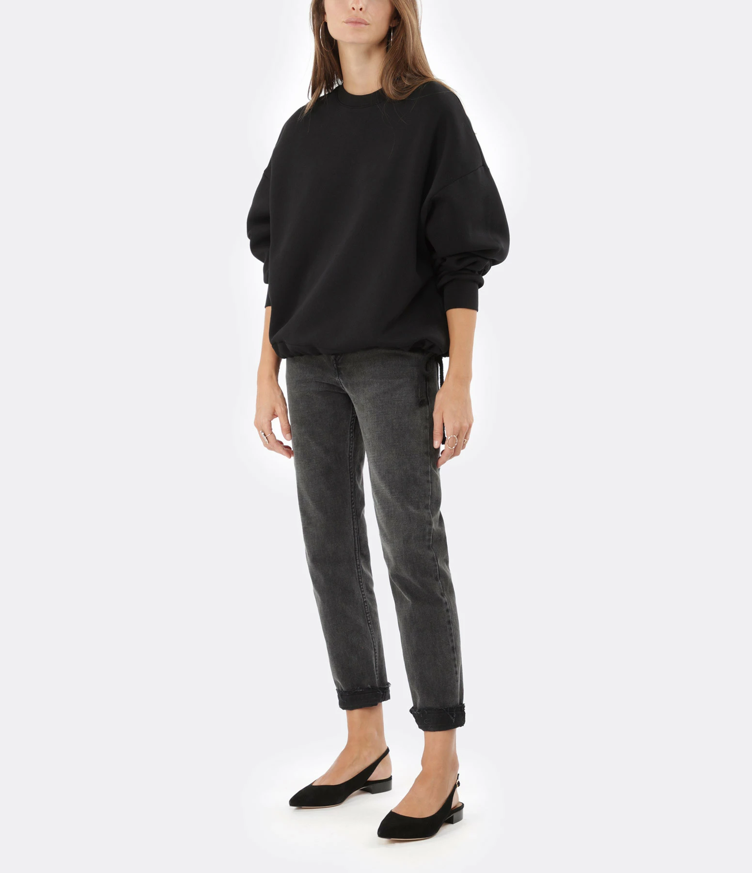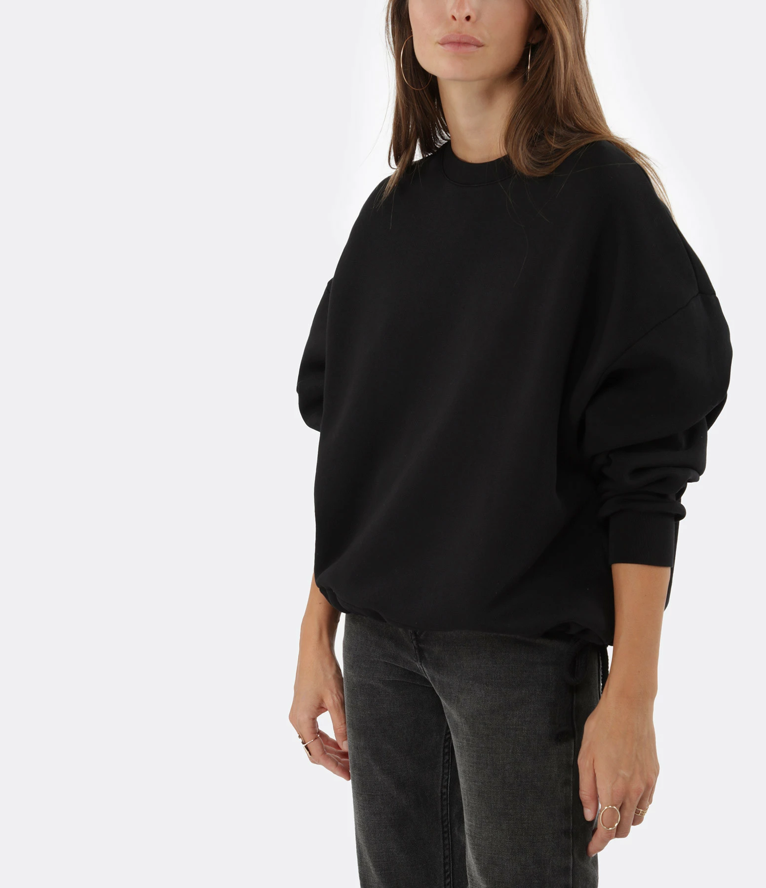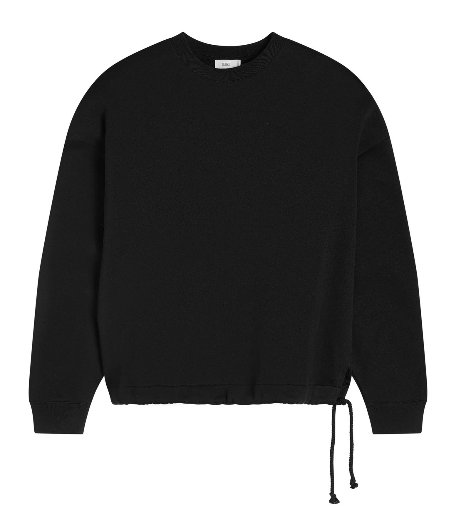 Sweatshirt en coton molletonné mélangé noir. Col rond côtelé. Manches longues larges avec poignets côtelés. Deux fentes latérales. Coupe droite large. Base droite avec cordons de serrage.