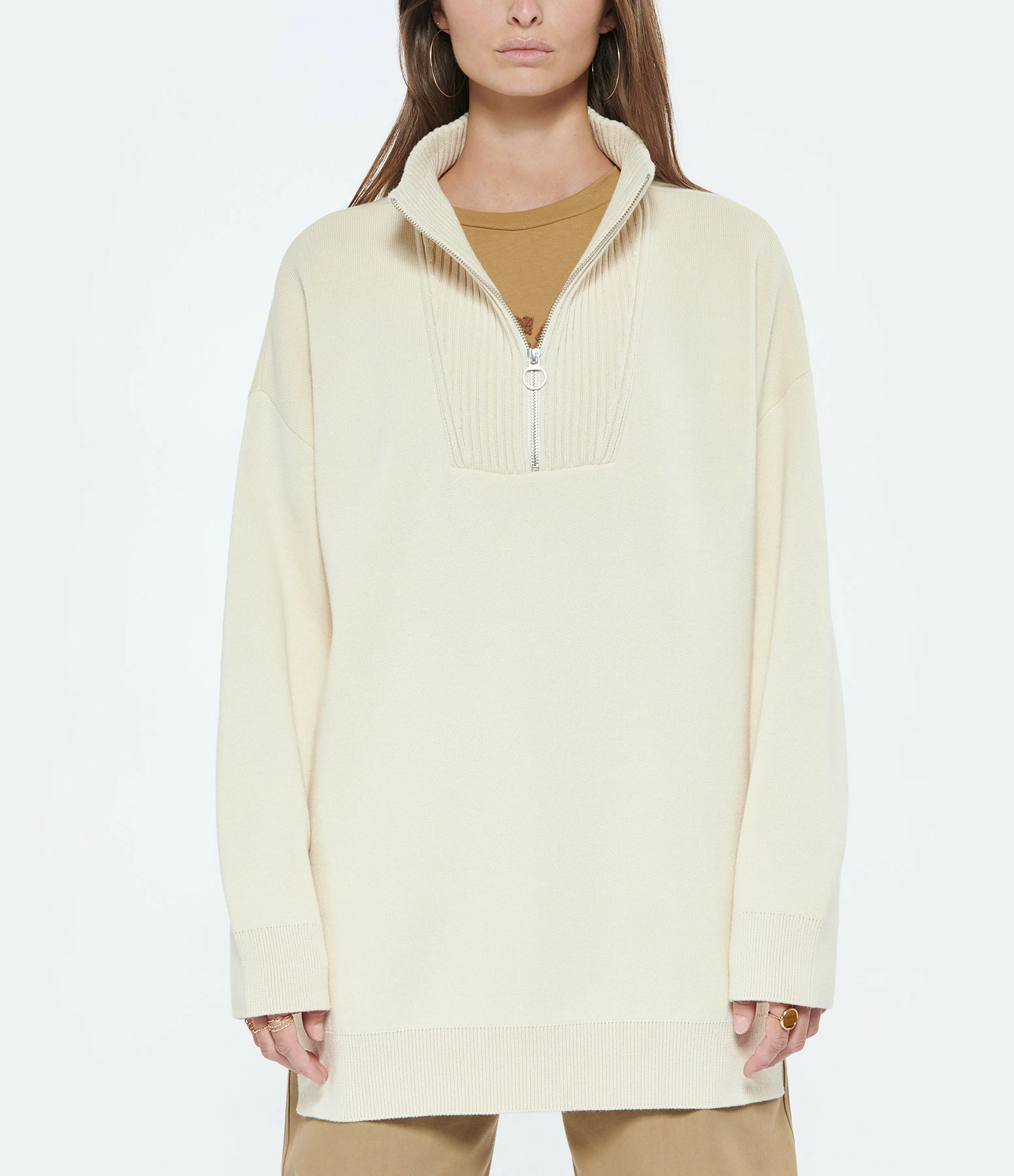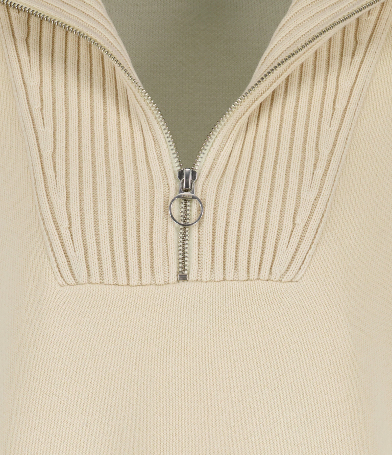 Pull épais en coton écru. Col camionneur zippé et côtelé. Manches longues. Poignets côtelés. Fentes latérales. Coupe droite. Base droite côtelée. Doublé en laine mélangée blanche.