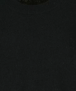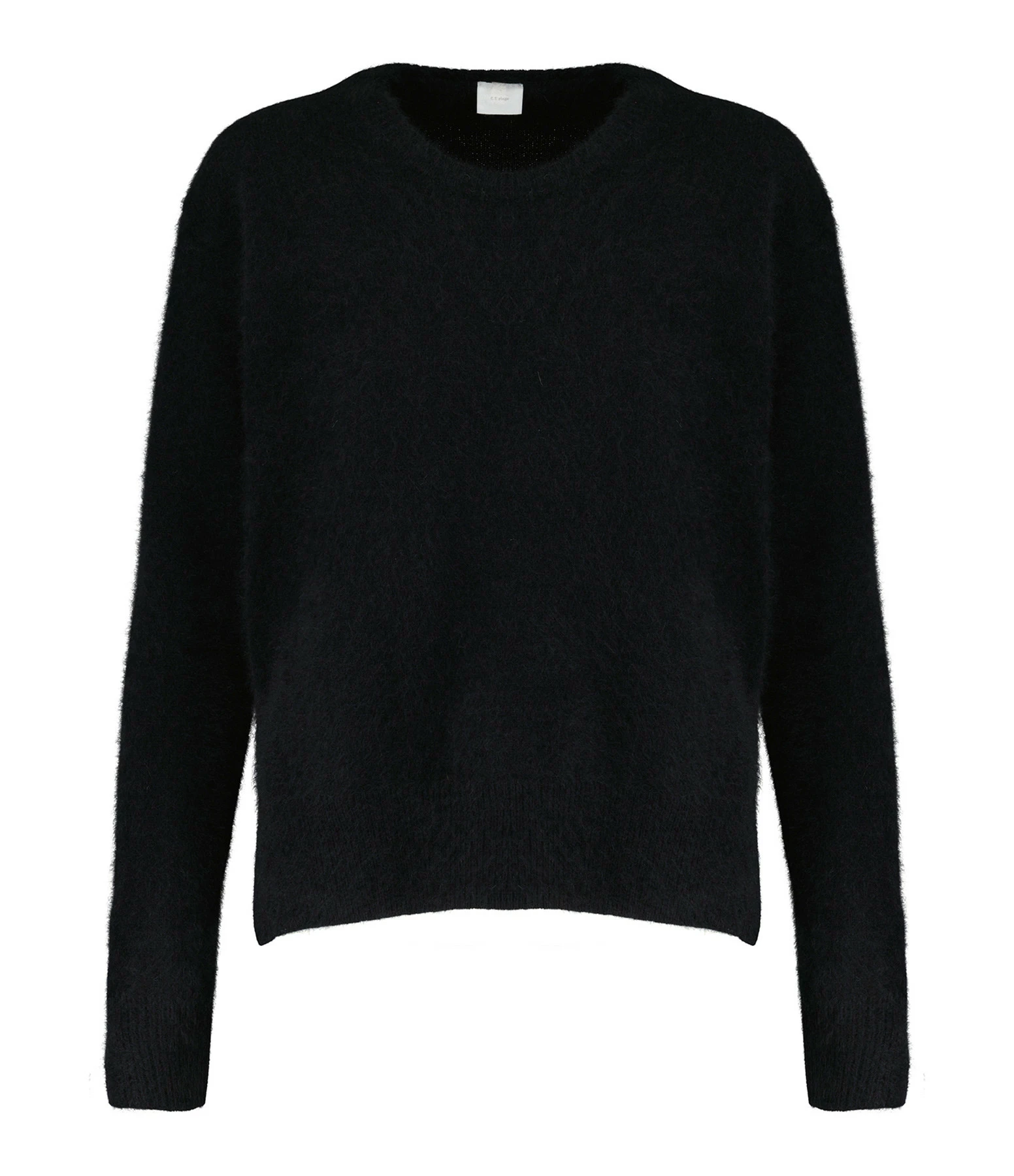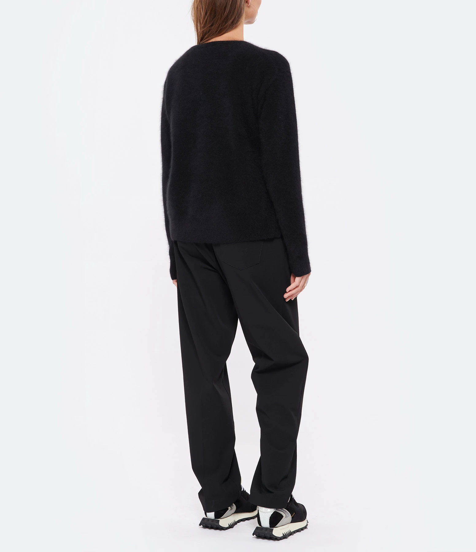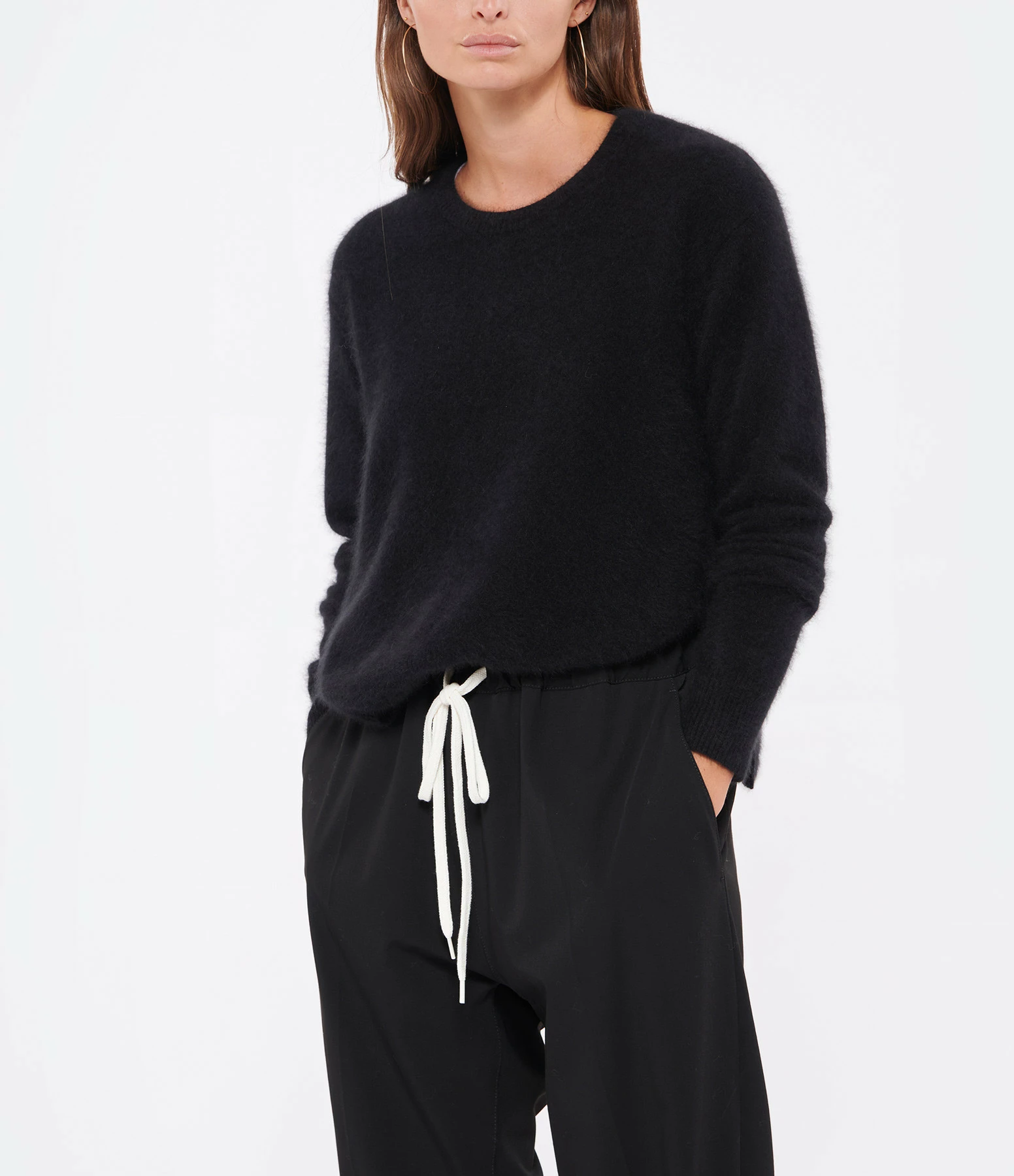 Pull en laine noir. Col rond côtelé. Manches longues avec poignets côtelés. Deux fentes latérales à boutons pressions. Coupe droite. Base droite côtelée.