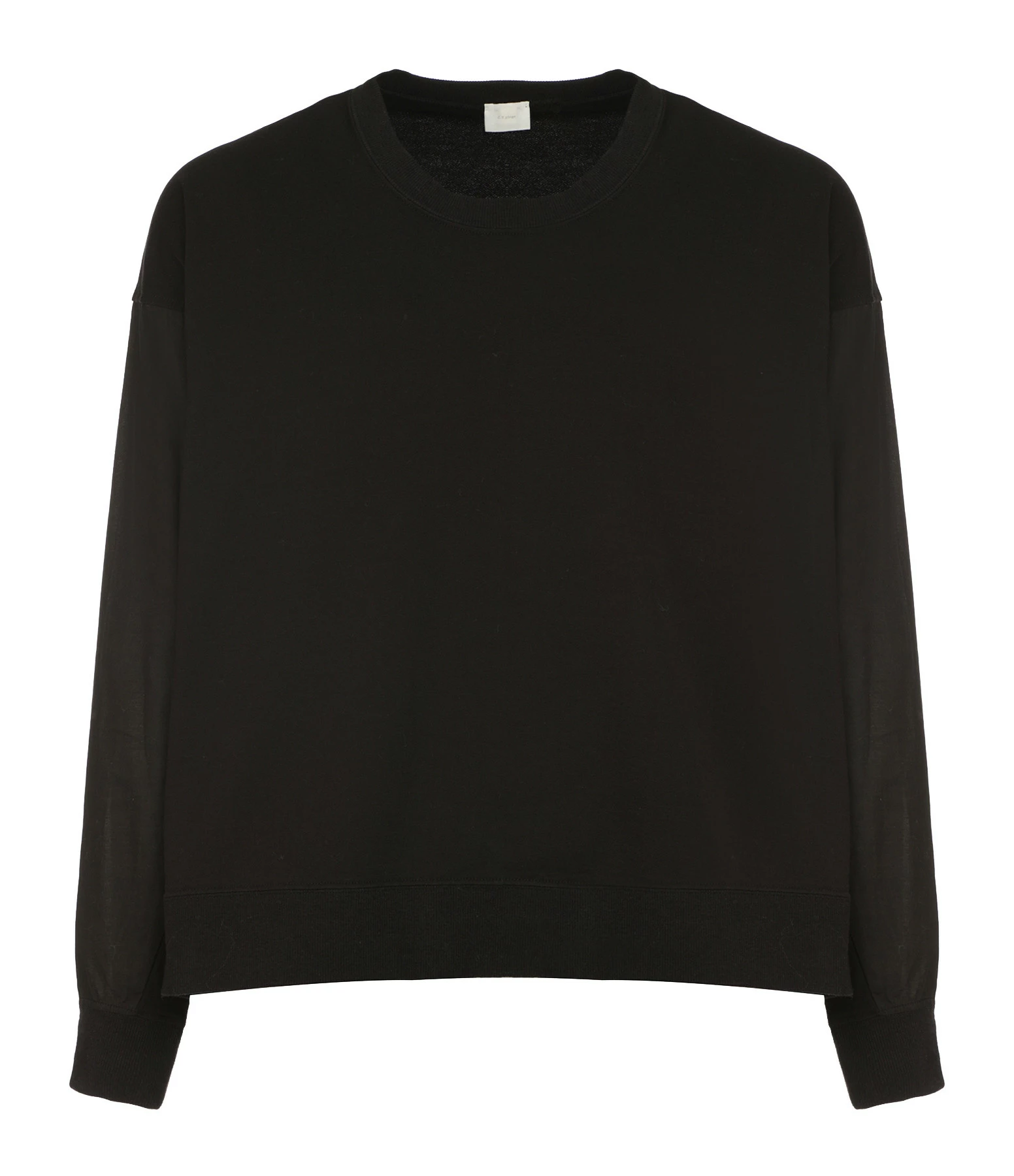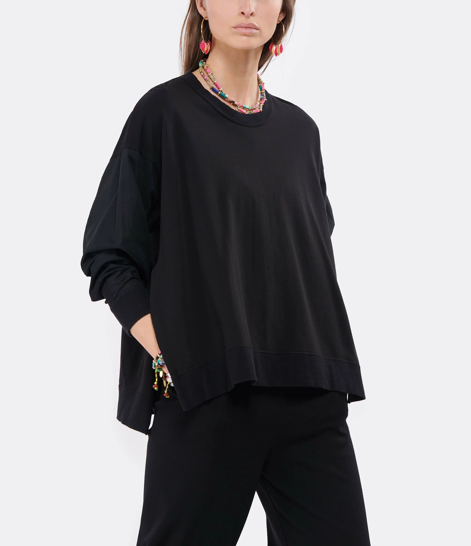 Sweatshirt en coton effet bi-matière. Col arrondie. Manches longues Ă©lastiquĂ©es effet chemise. Fentes latĂ©rales. Coupe droite. Plus long Ă l’arrière.