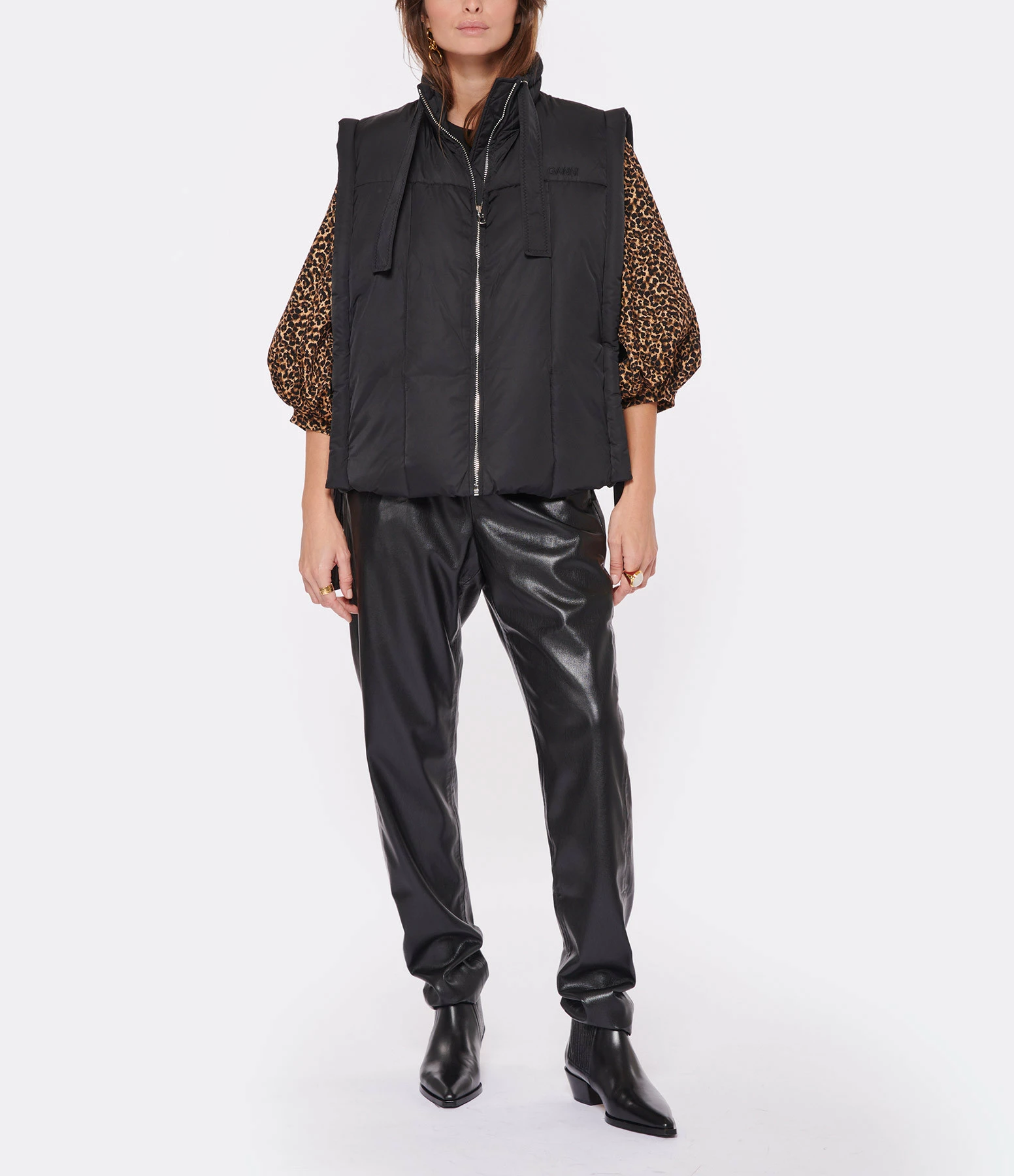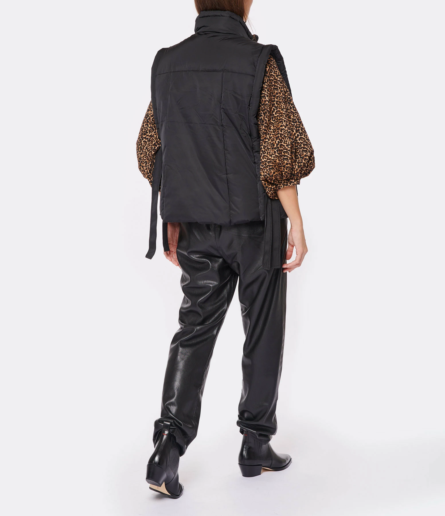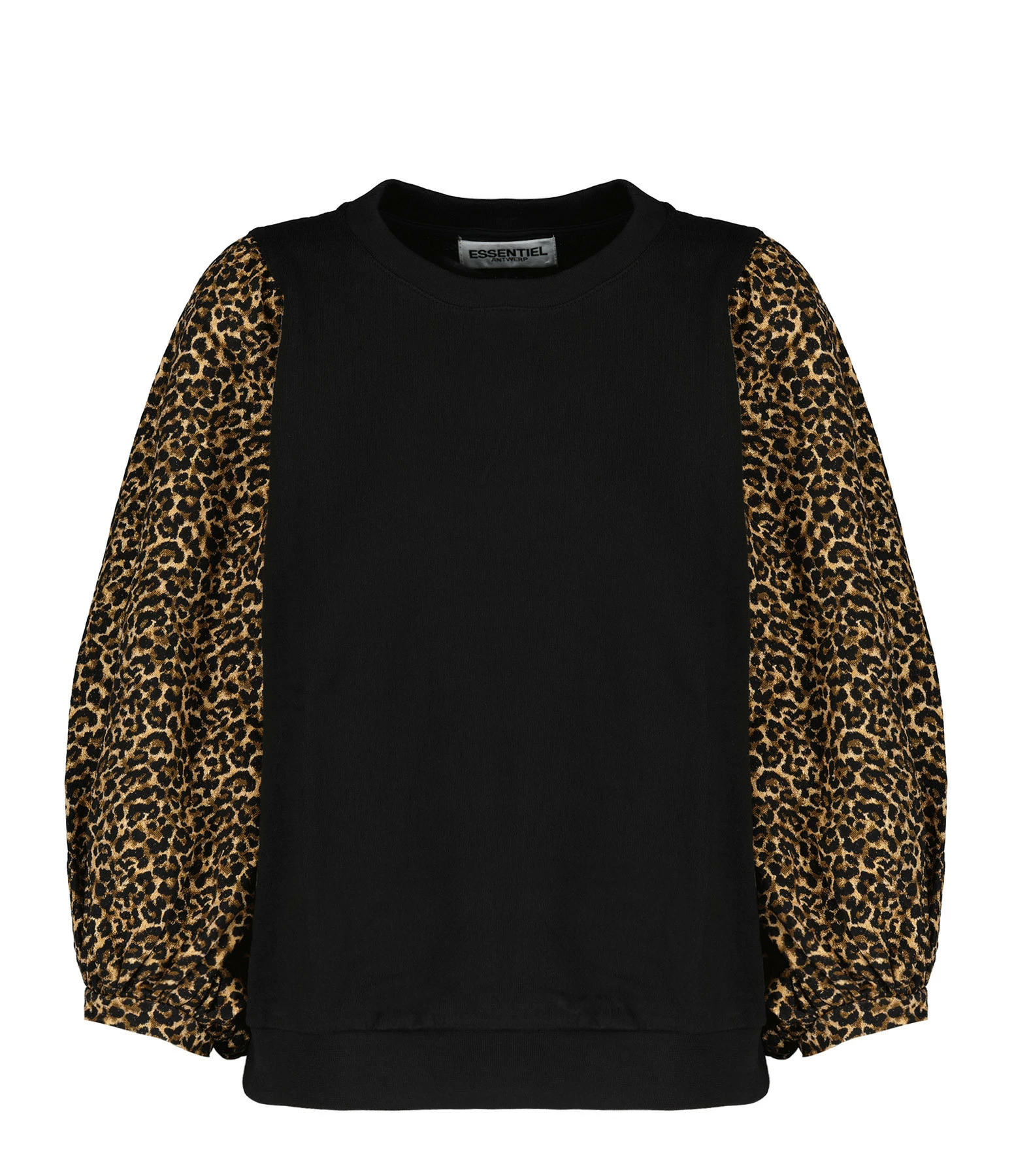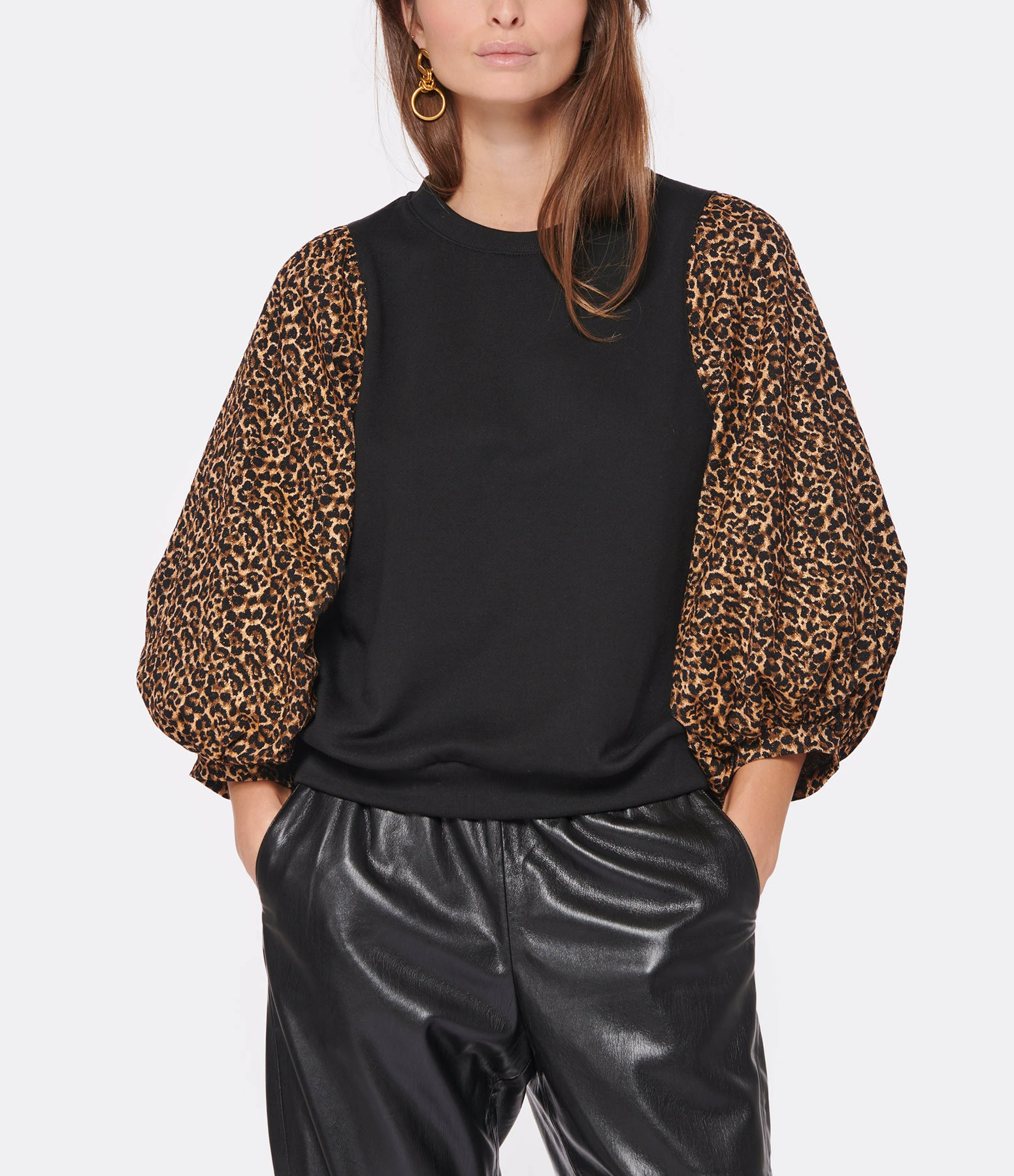 Sweat en coton noir. Bords côtelés. Manches 3/4 volumineuses en jacquard imprimé léopard. Col rond. Base droite.