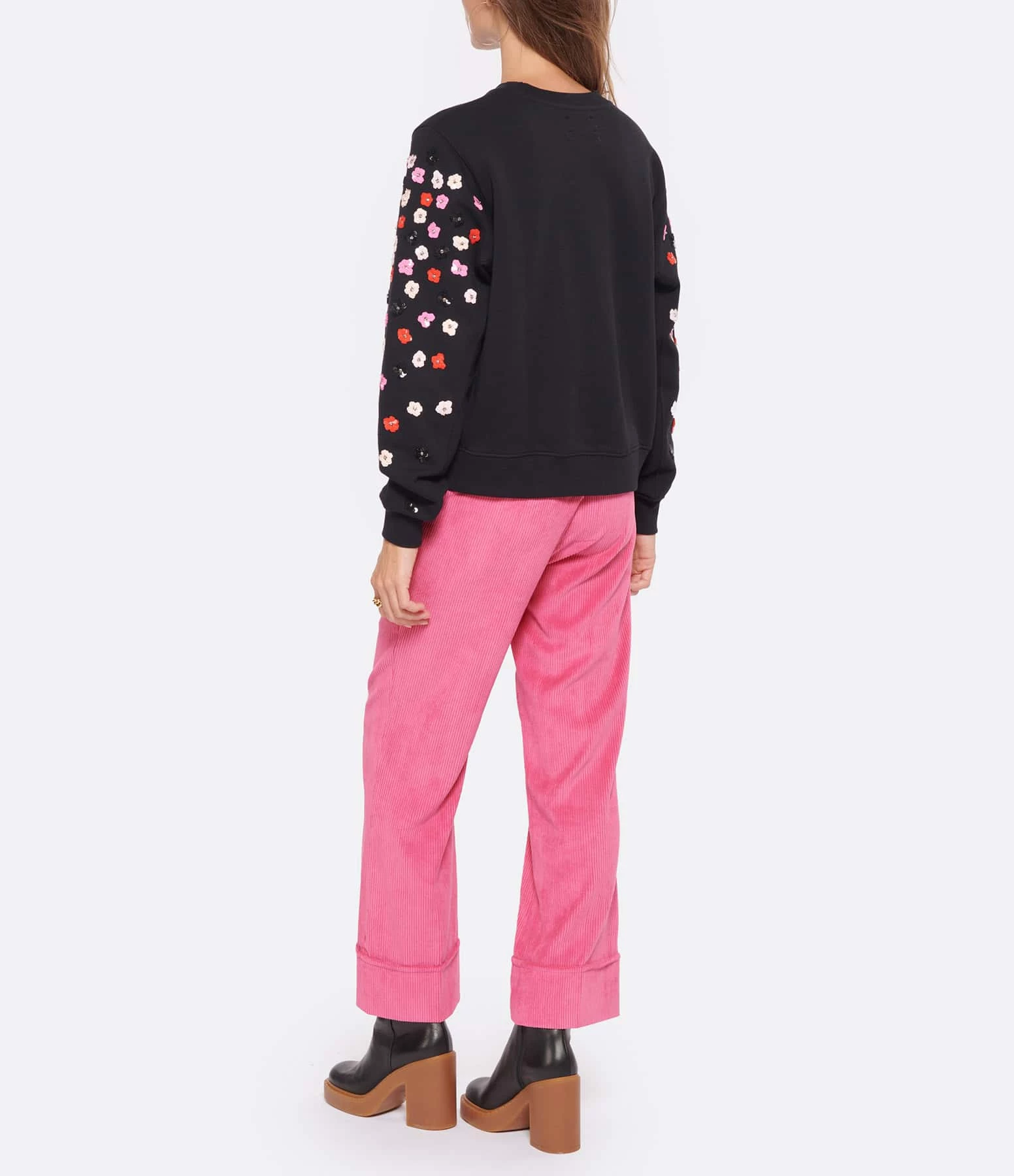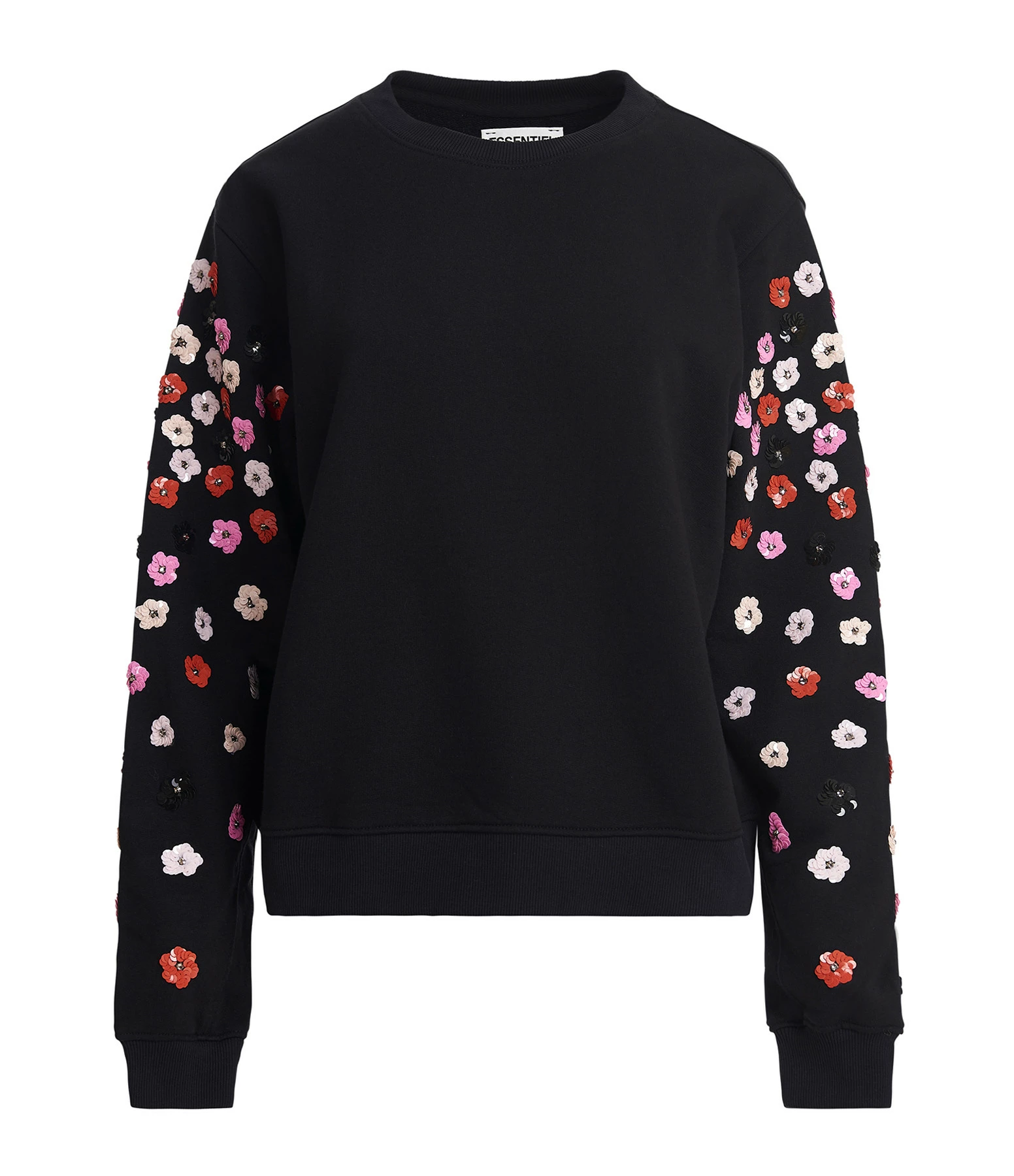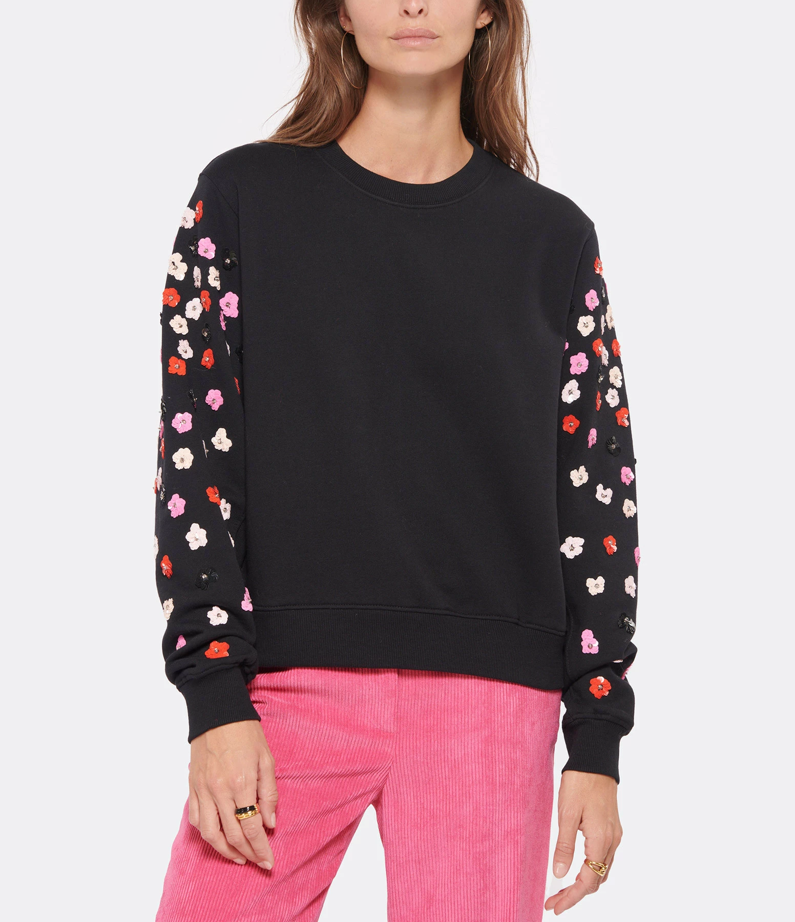 Sweatshirt en coton noir. Manches avec sequins fleurs multicolores. Col rond côtelé. Coupe droite. Base droite côtelée.