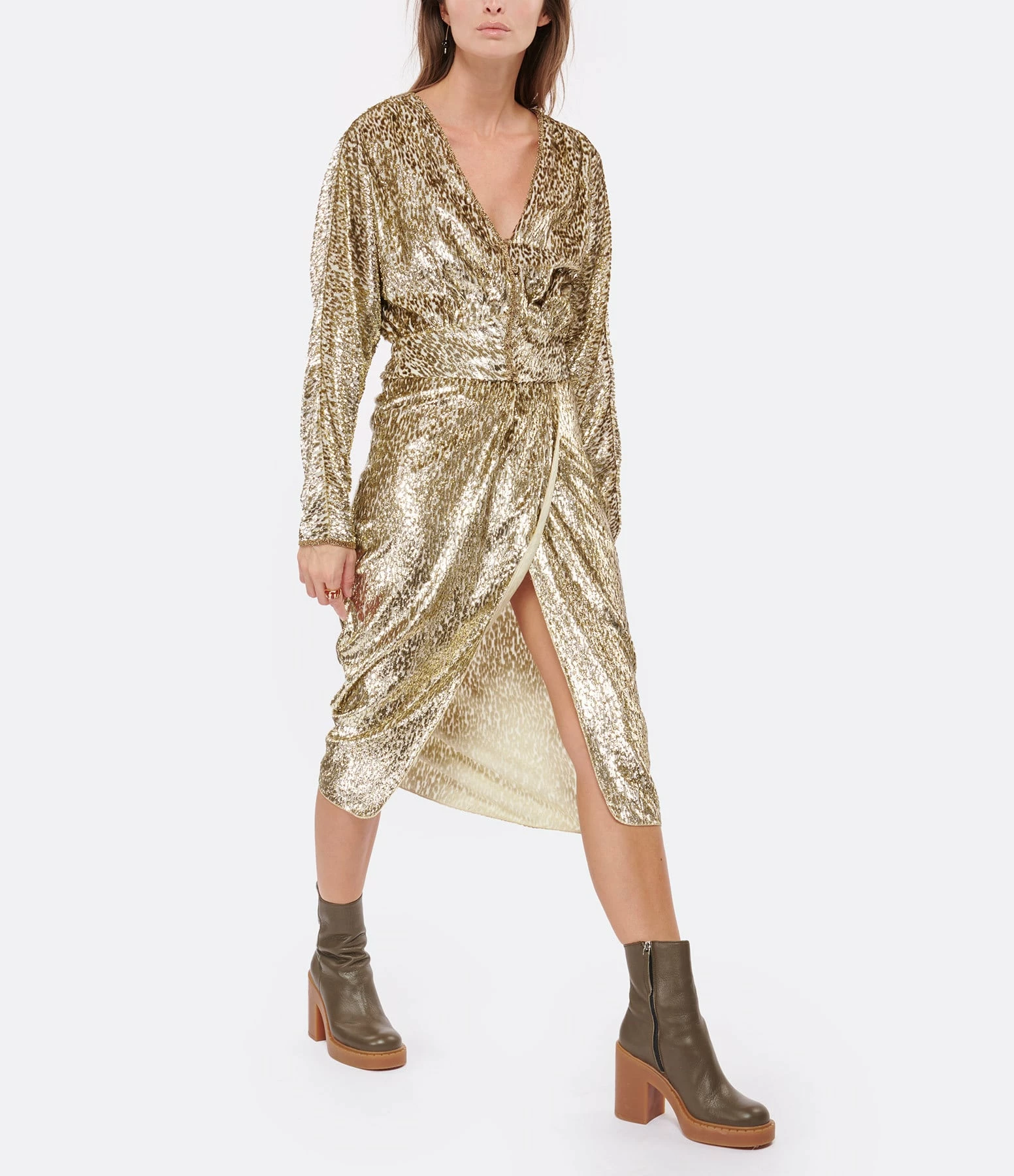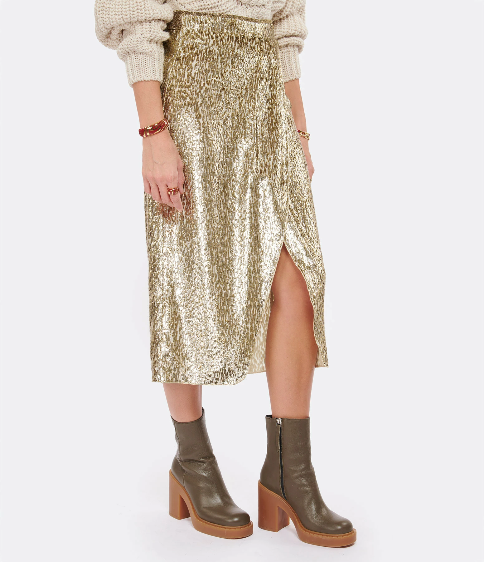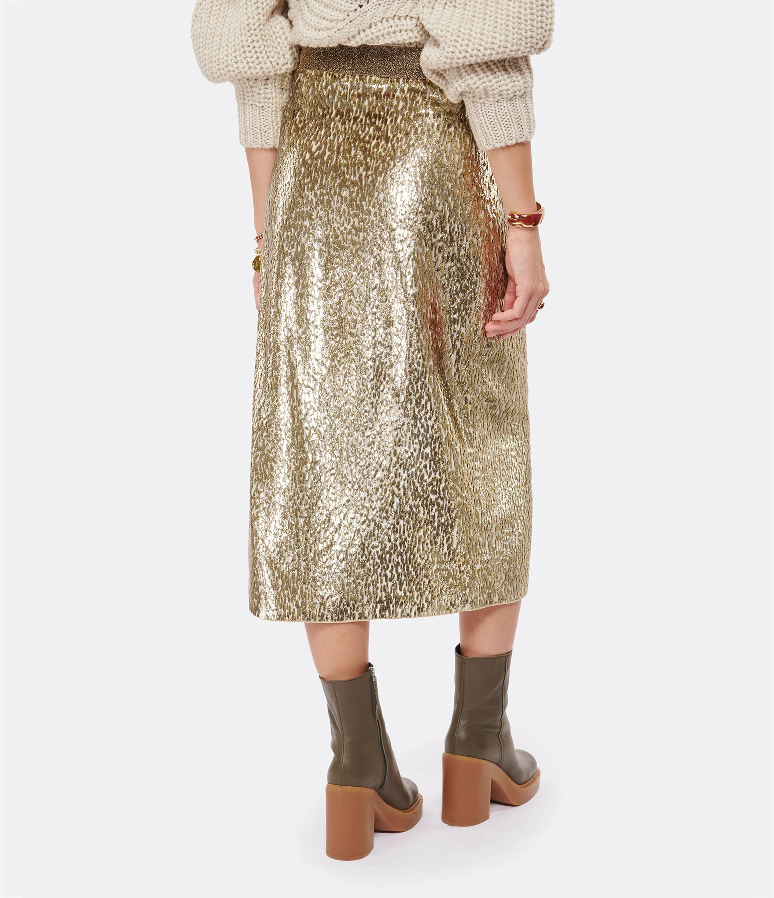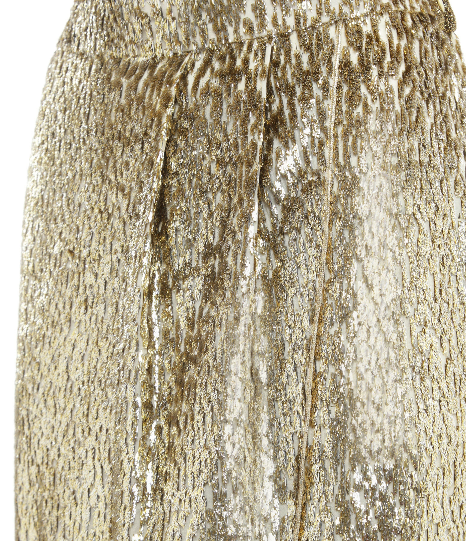 Jupe mi-longue en velours et fils métallisés dorés. Taille haute avec dos élastiqué et froncé. Fermeture zippée invisible latérale. Pan croisé sur le devant créant un effet de fente. Coupe près du corps. Base arrondie. Doublée.