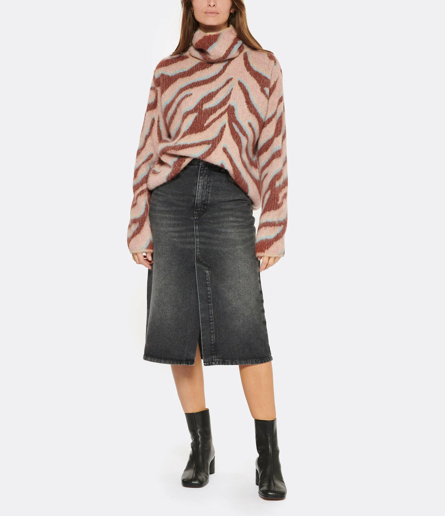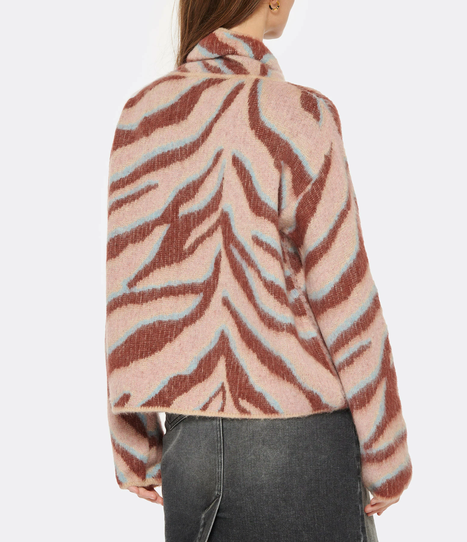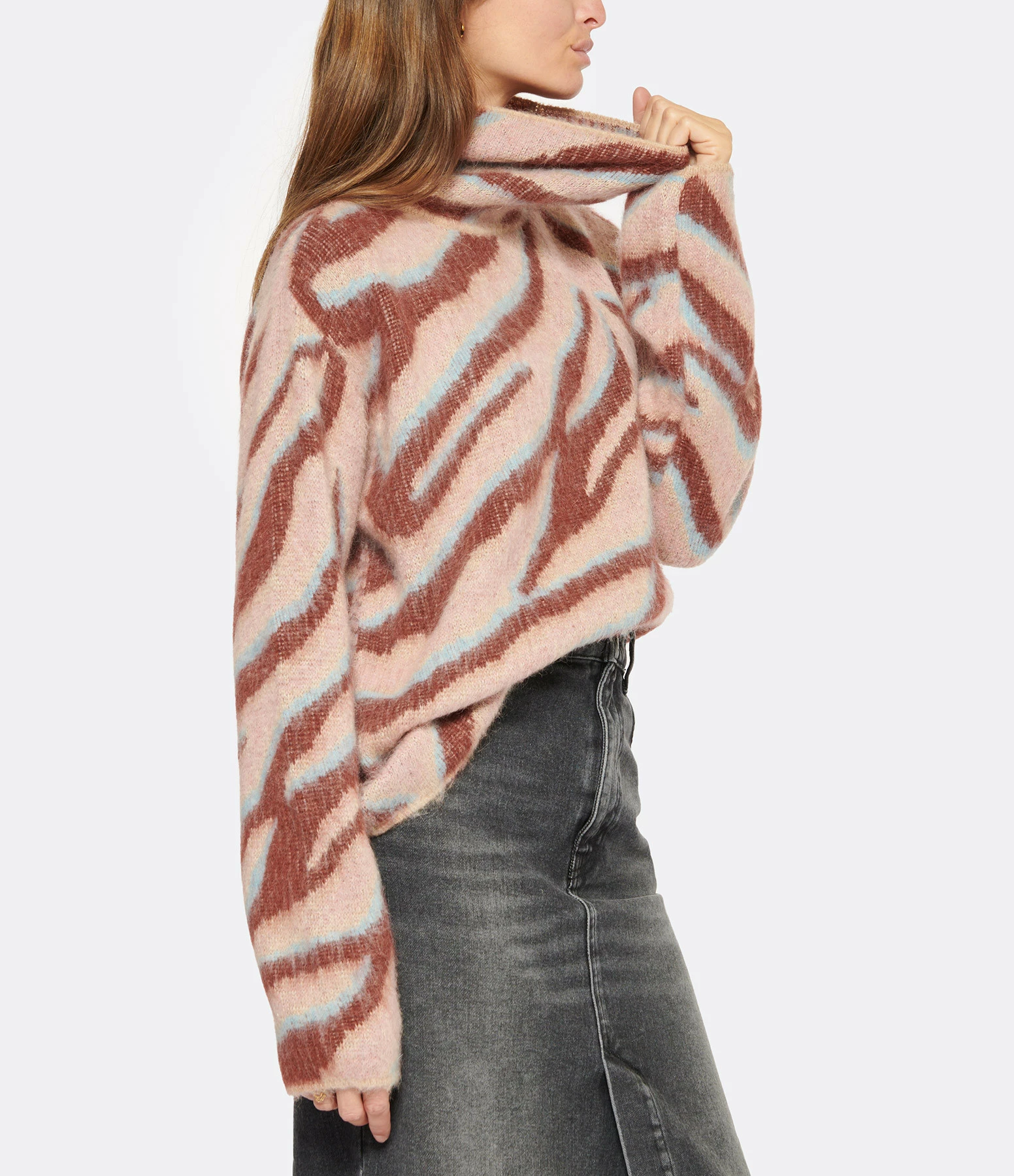 Pull en maille jacquard à motifs géométriques inspirés des peaux animales dans des tons roses soulignés de bleu. Col montant. Manches longues. Coupe ample. Base droite.