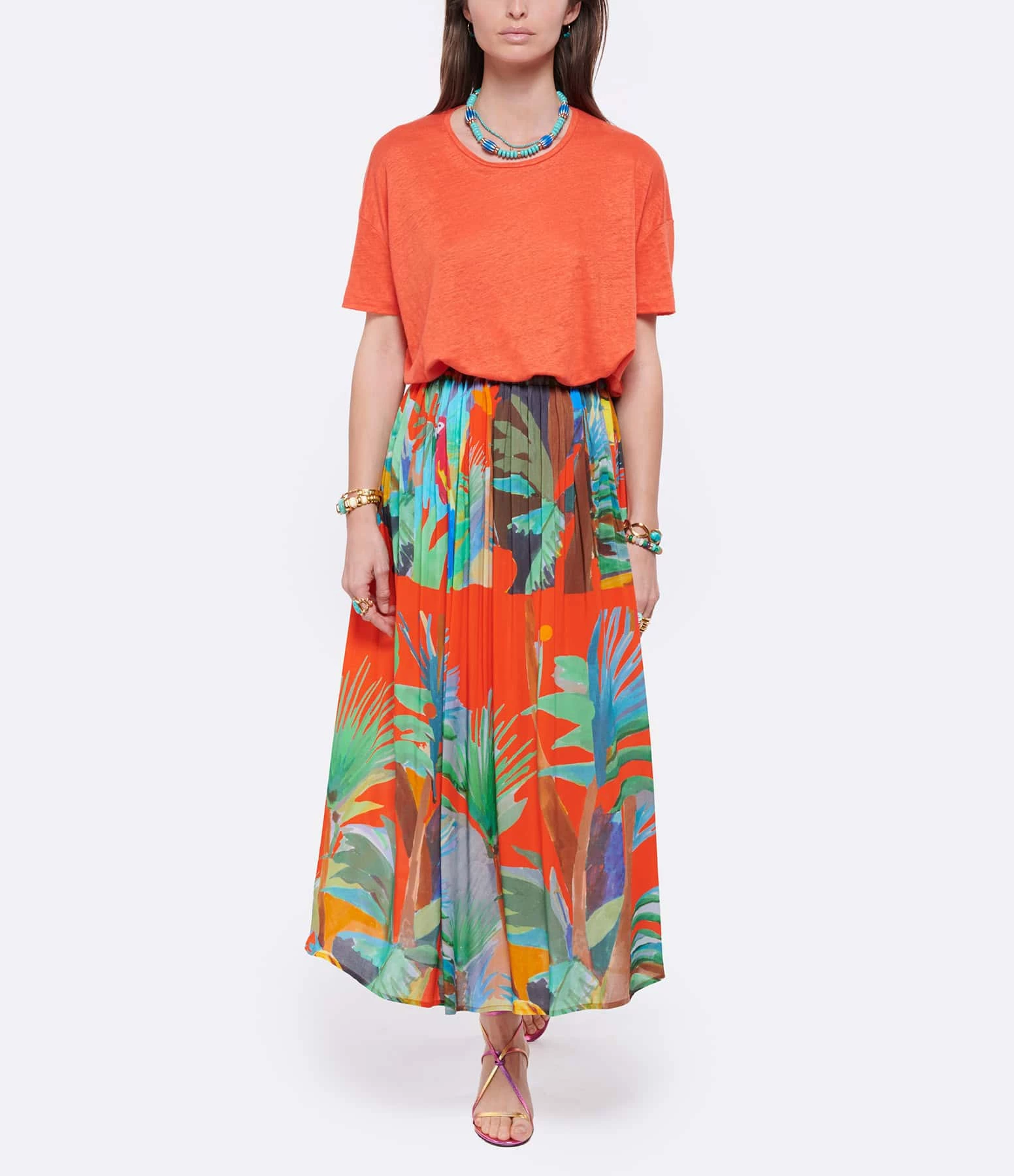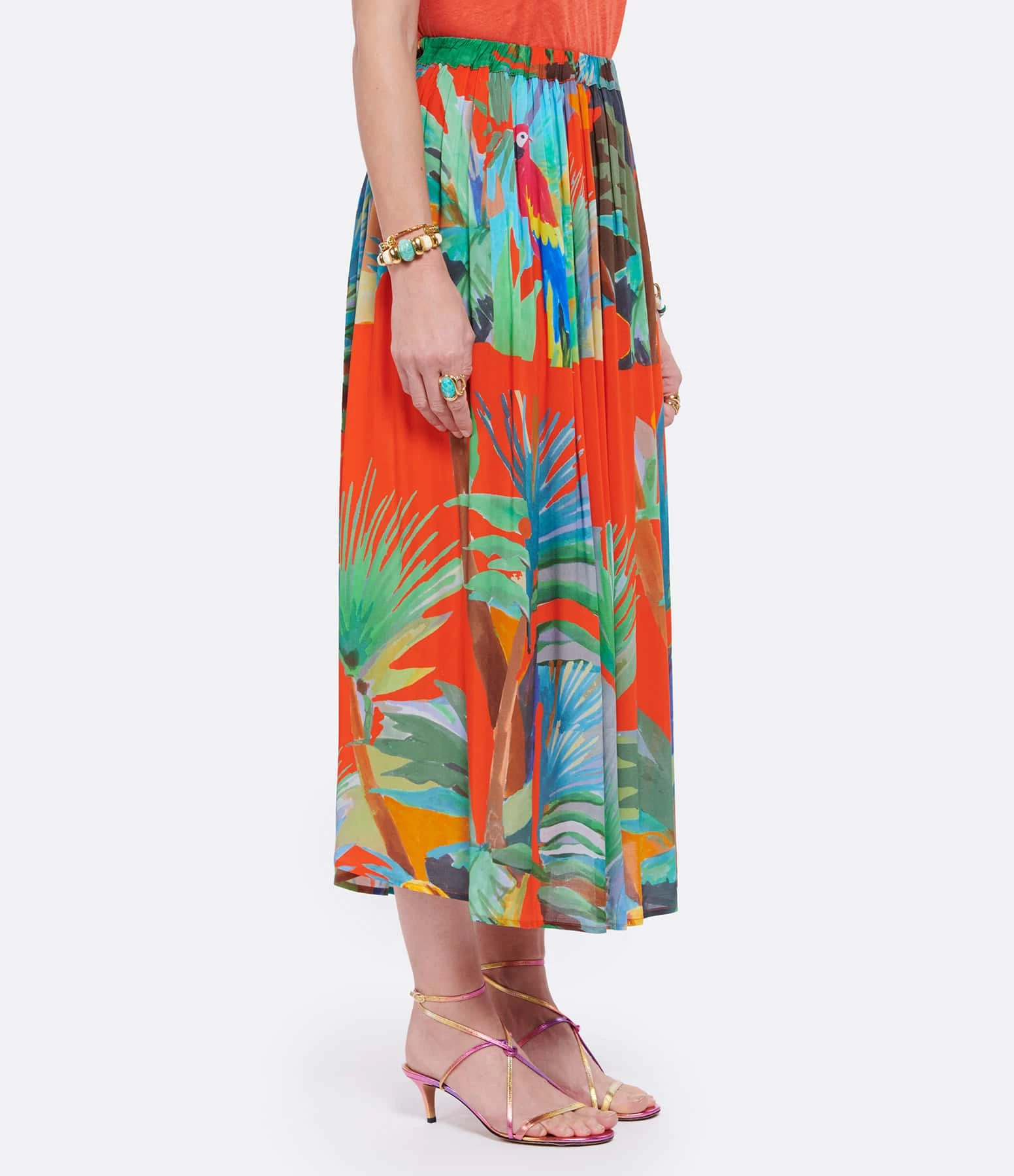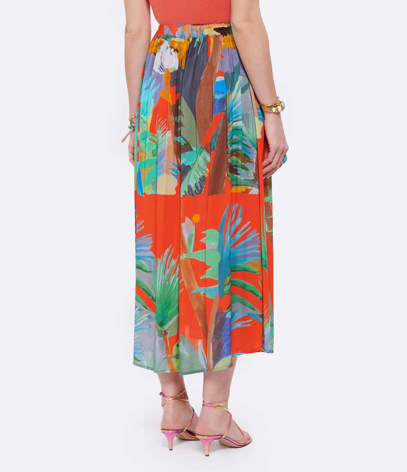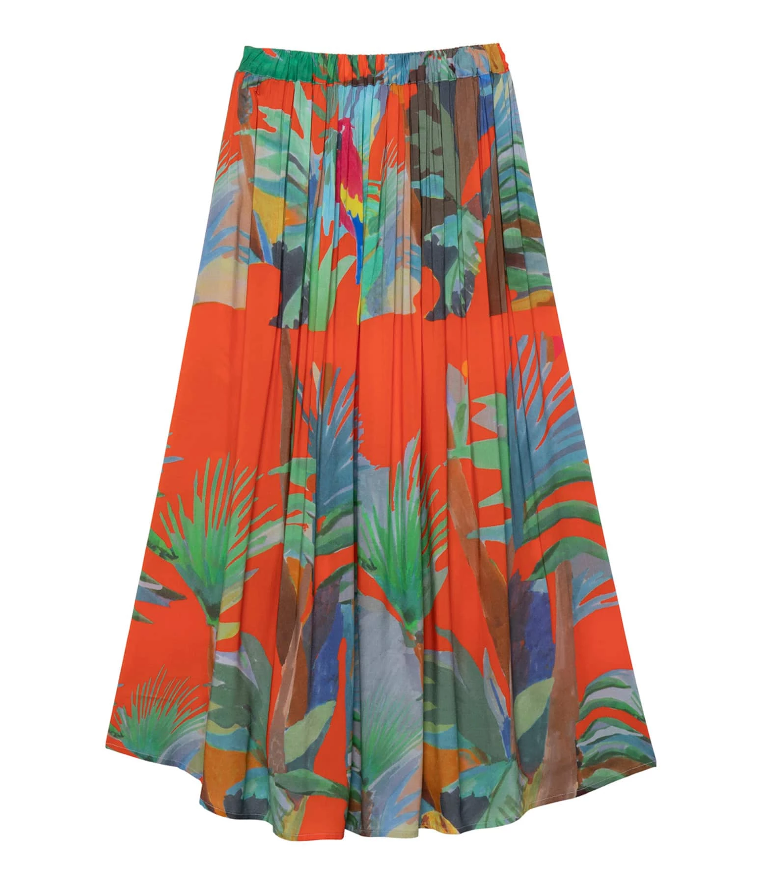 Jupe longue fluide imprimée tropical effet aquarelle. Taille élastiquée. Non doublée.