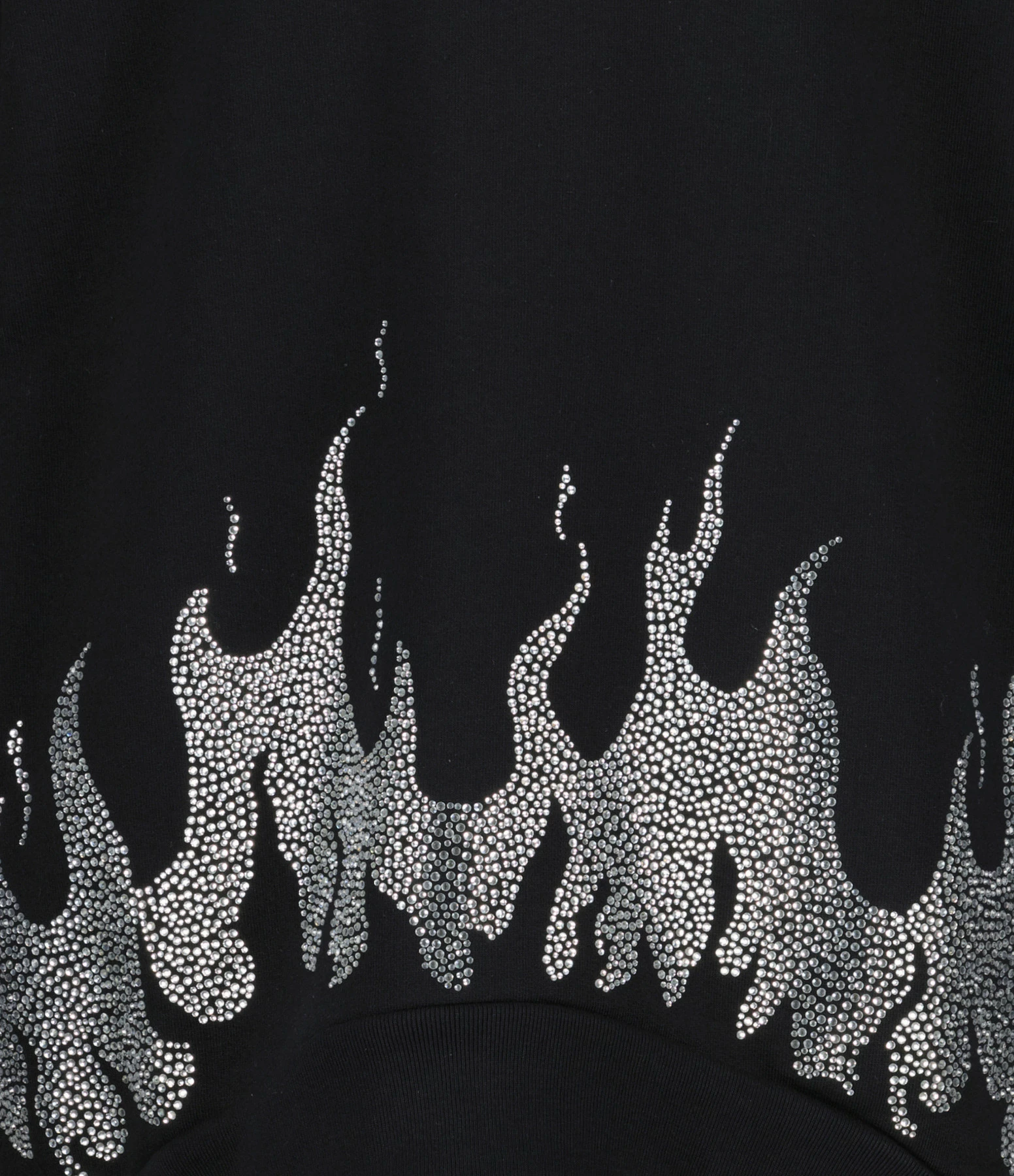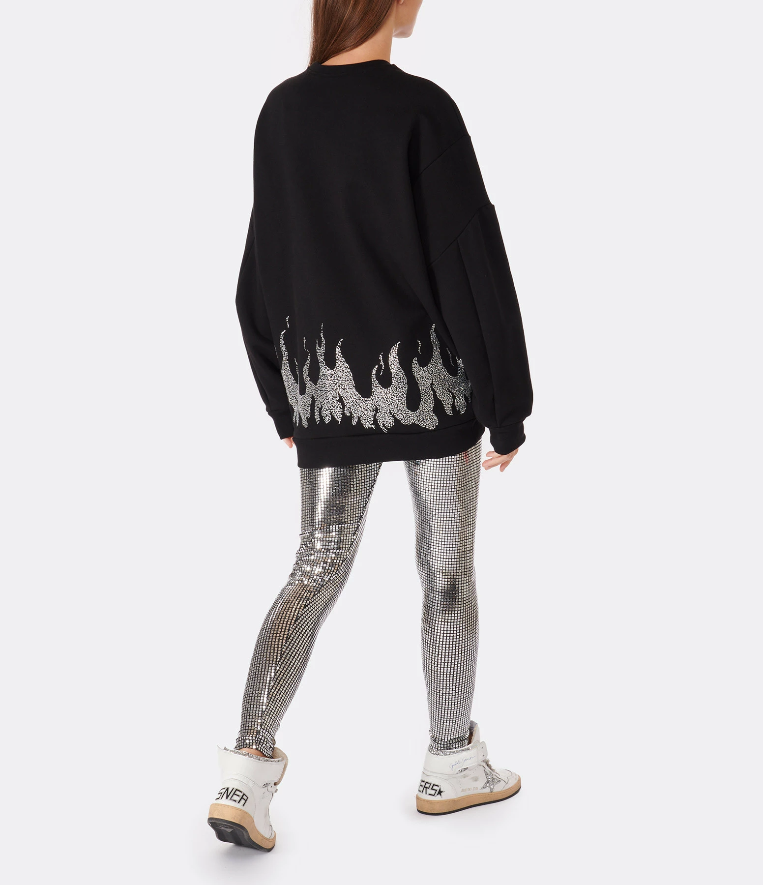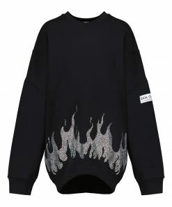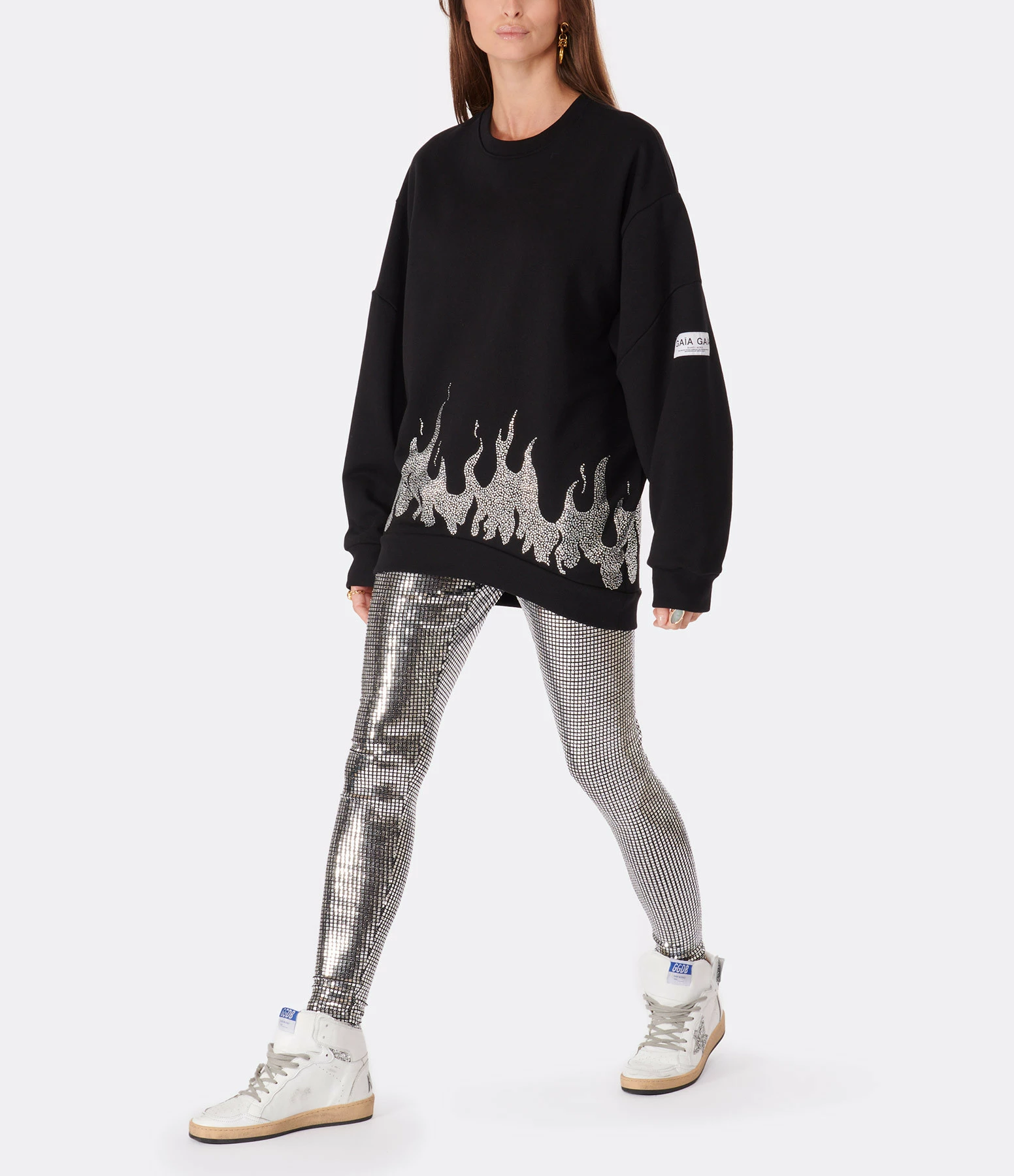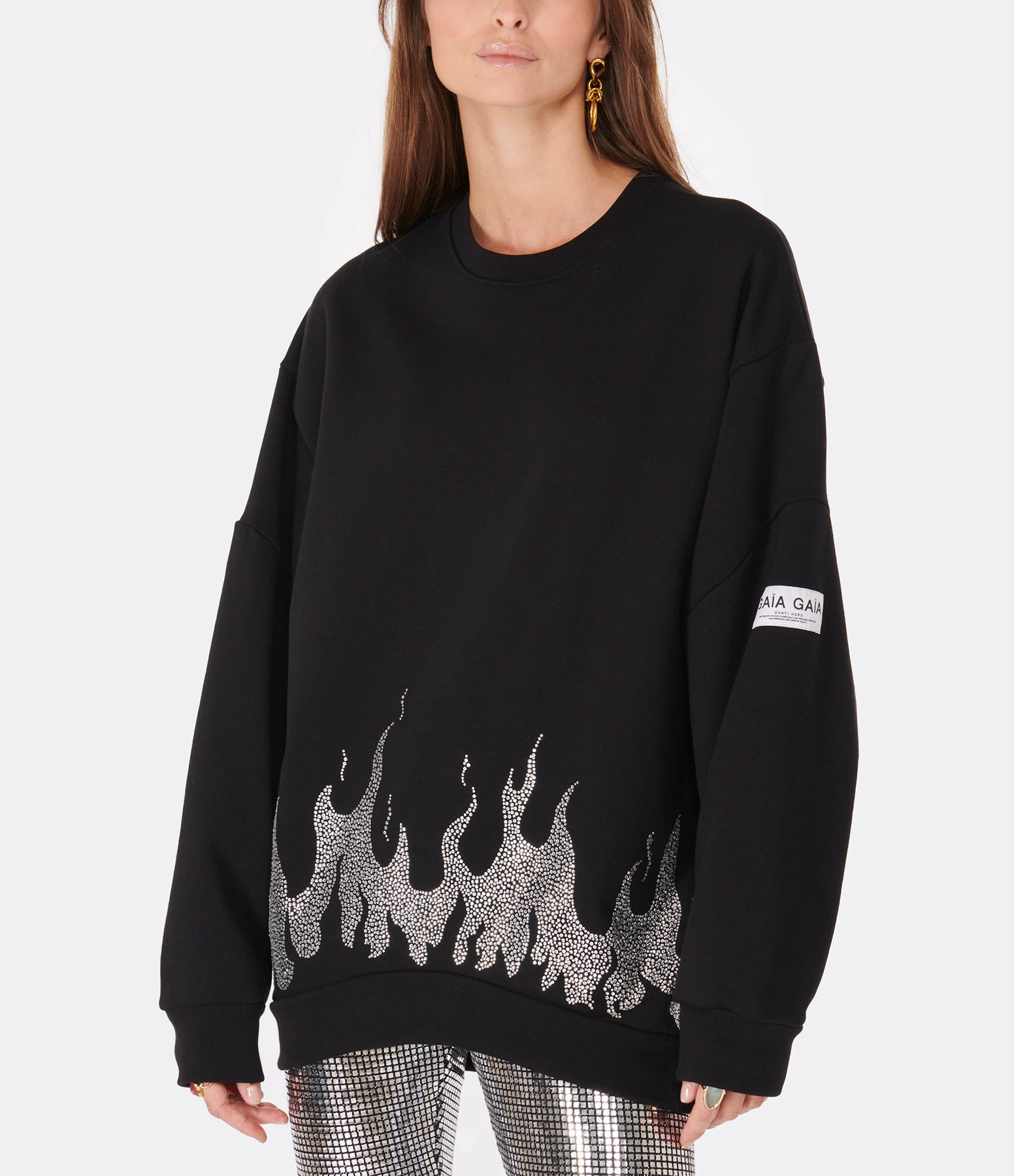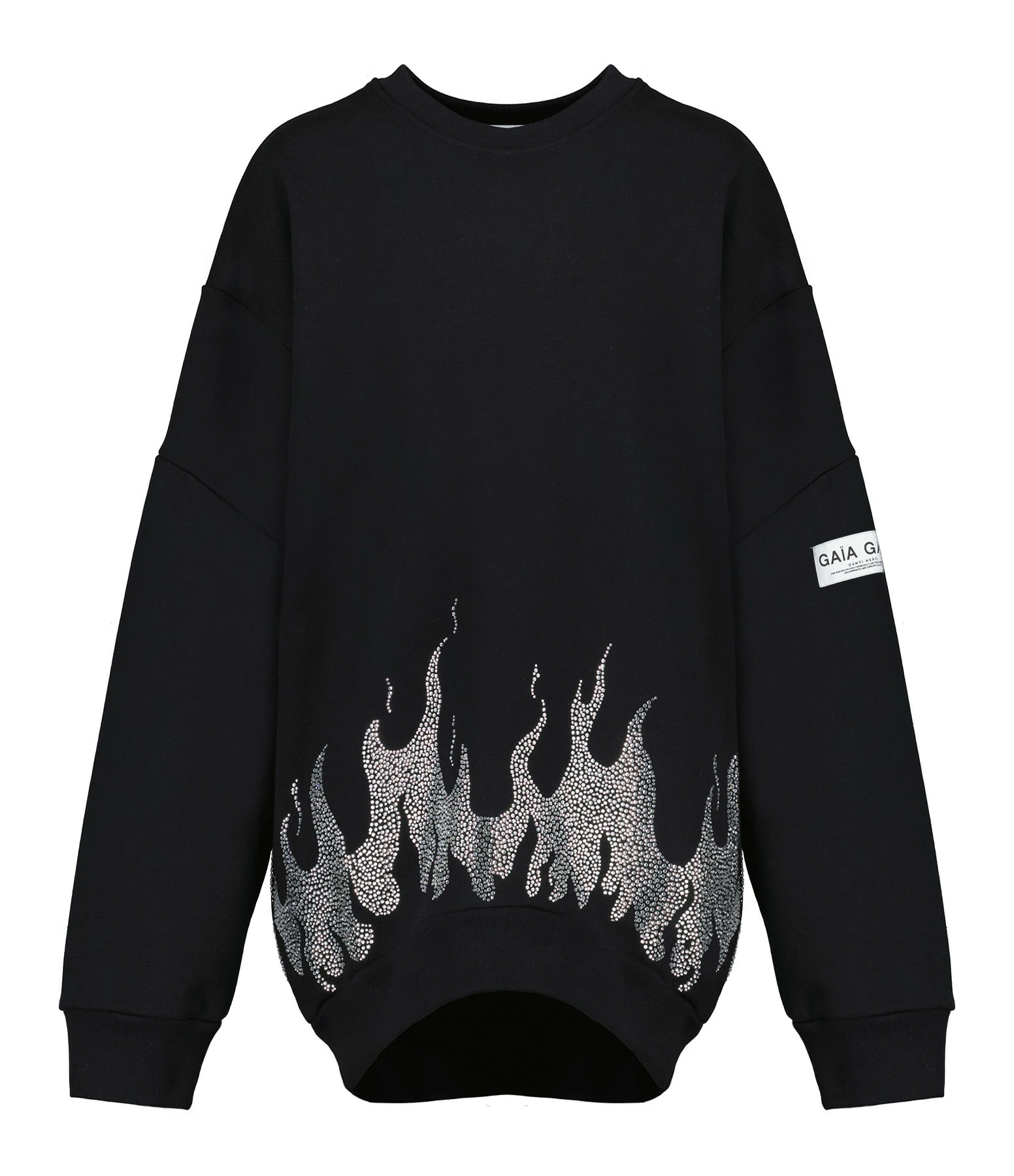 Sweatshirt oversize en coton noir avec strass en forme de flammes sur la base. Logo “GAÏA GAÏA” sur la manche gauche. Col rond. Manches longues. Coupe ample. Base droite.