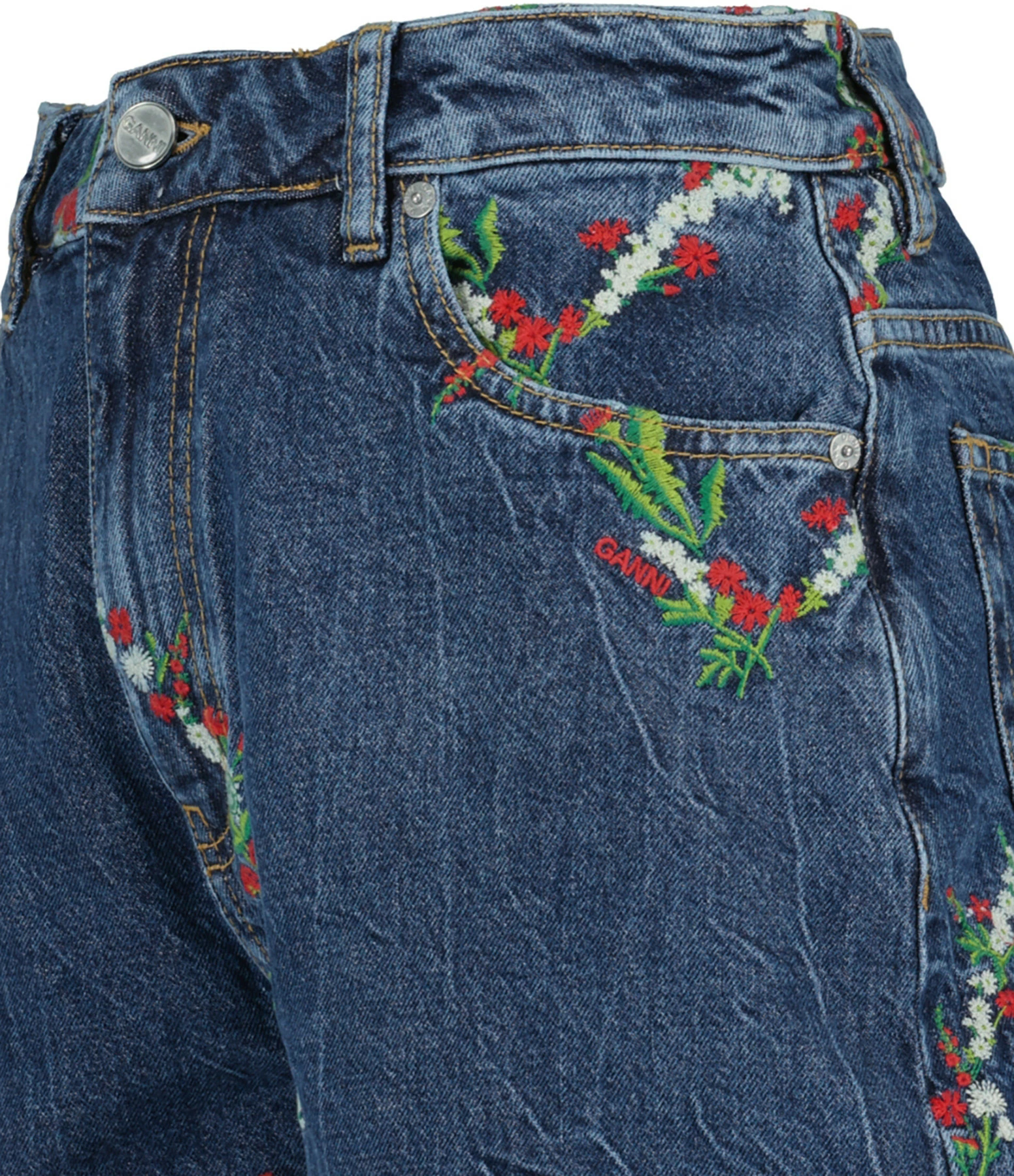 Short en denim bleu marine, avec broderies florales rouges. Cinq poches. Fermeture par zip.