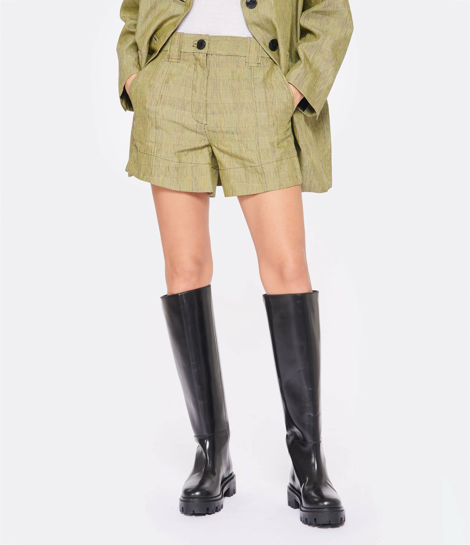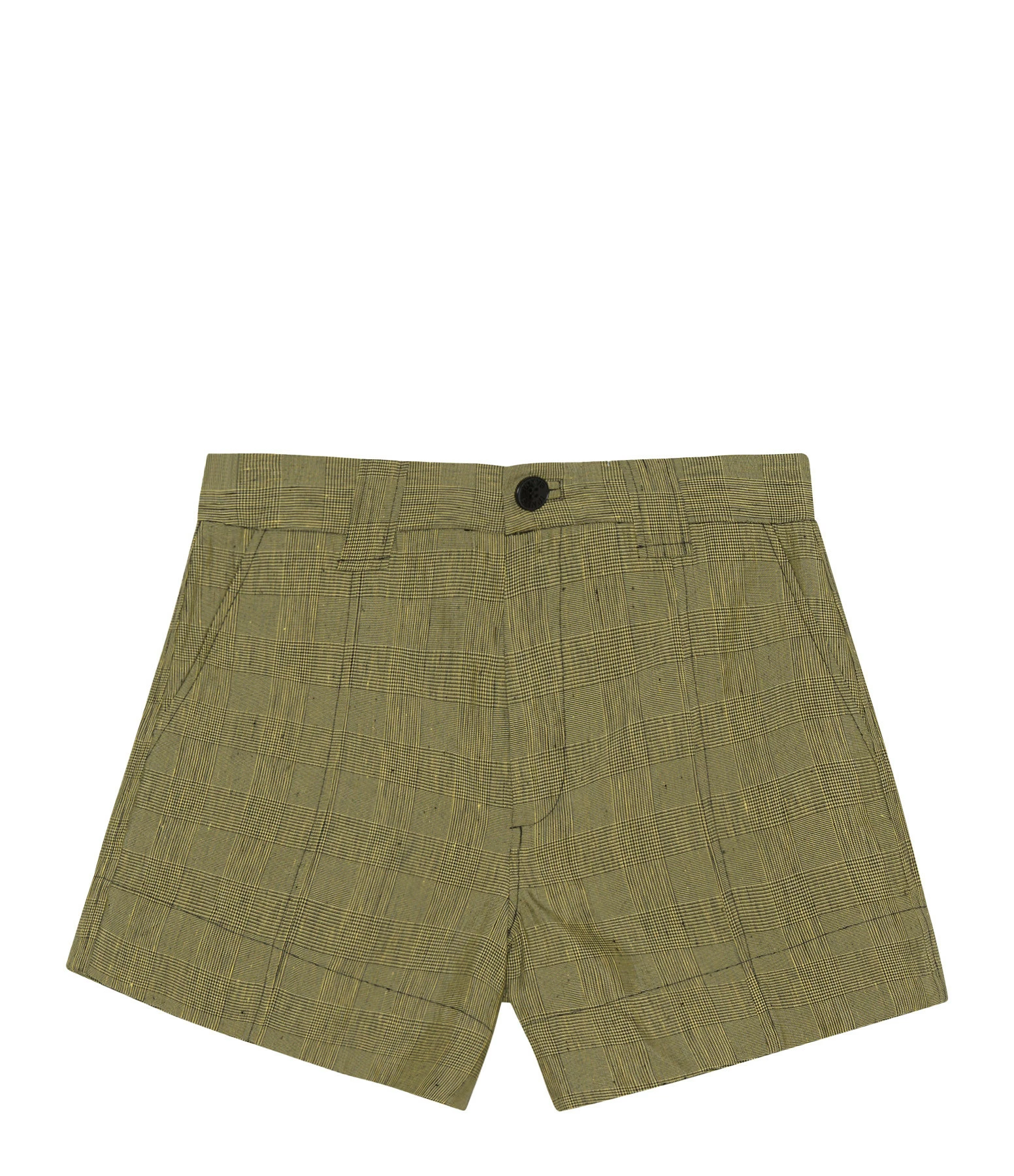 Short en lin mélangé à imprimé carreaux kaki. Taille haute. Fermeture par zip et bouton. Passants pour ceinture. Deux poches italiennes. Coupe droite. Base droite. Non doublé.