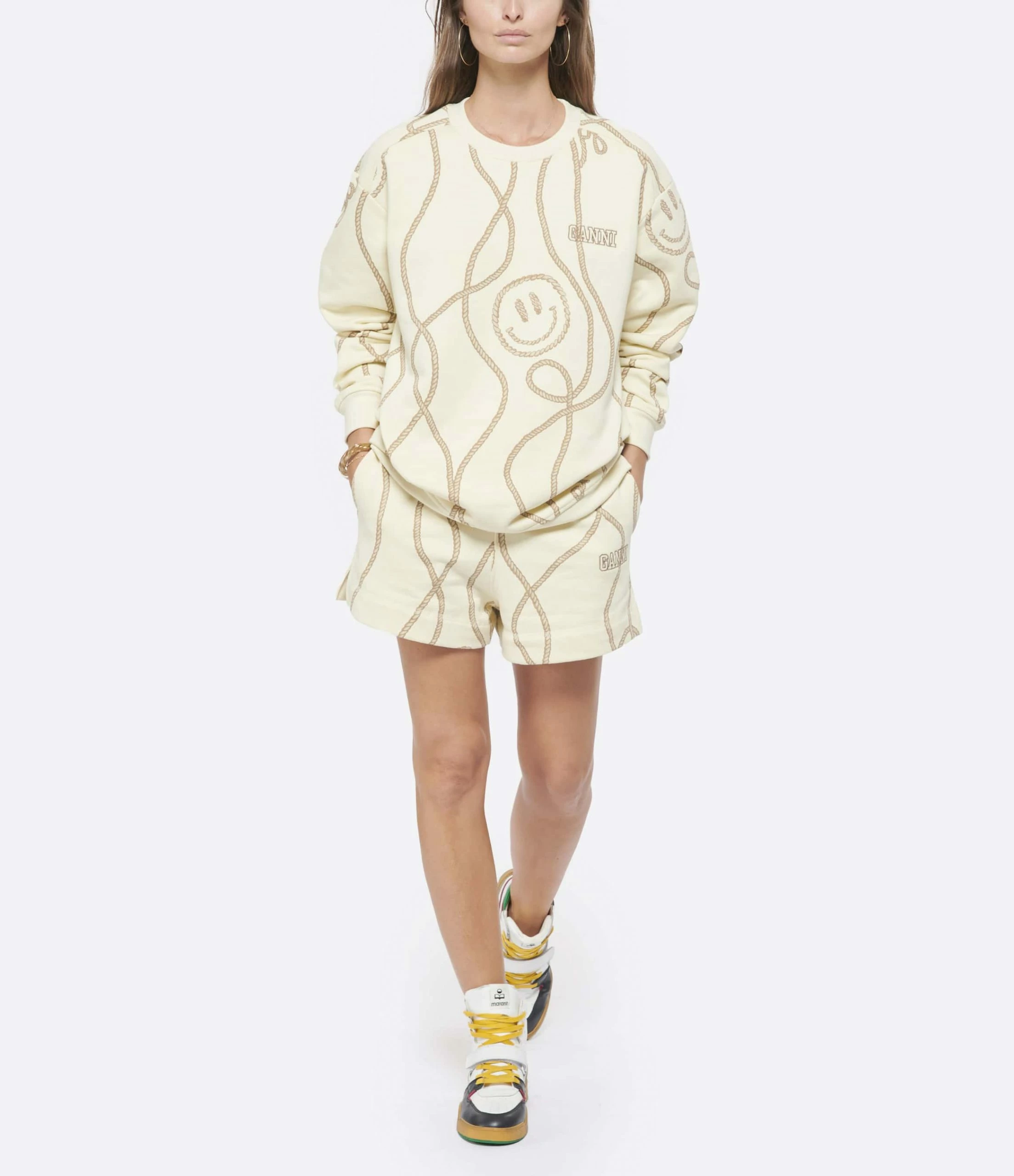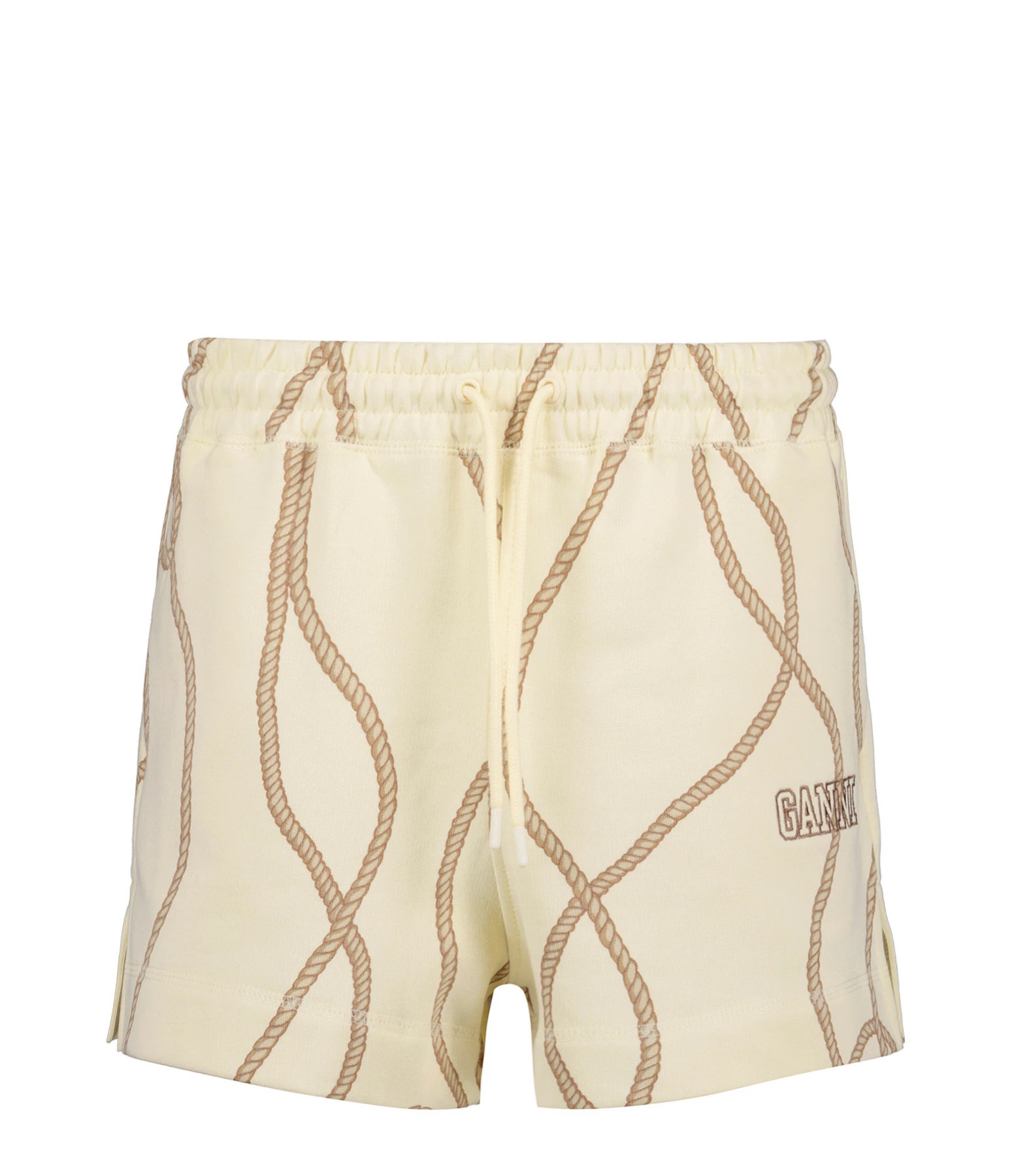 Short en coton molletonné beige imprimé. Logo “GANNI” brodé en marron. Deux poches italiennes. Taille élastiquée avec liens de serrage. Taille mi-haute. Coupe décontractée. Fentes latérales.