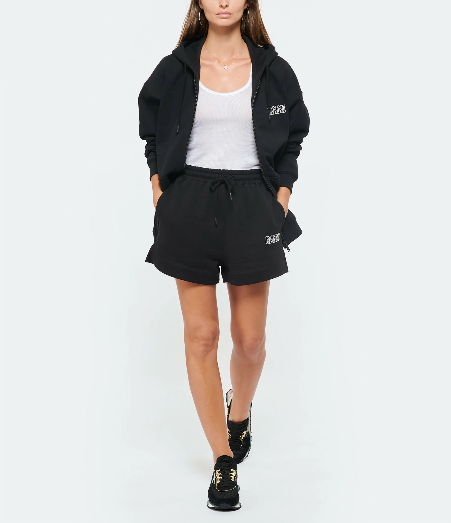 Short en coton molletonné noir. Logo “GANNI” brodé en blanc. Deux poches italiennes. Taille élastiquée avec liens de serrage. Fentes latérales.