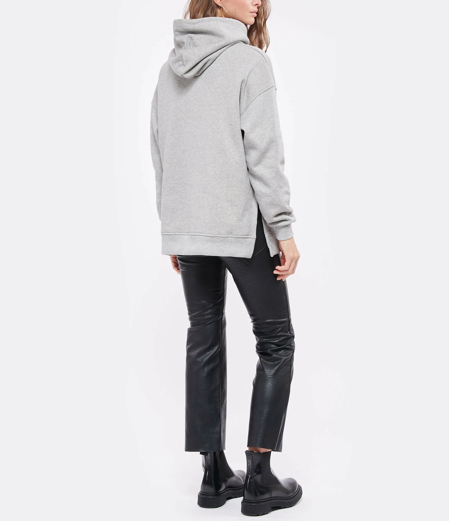 Hoodie en coton molletonné gris chiné. Inscription “GANNI” brodée en gris foncé sur le devant. Capuche avec liens de serrage. Manches longues. Bords côtes au niveau des poignets et du bas des vêtement. Coupe droite ample. Fentes latérales. Base droite. Non doublé.