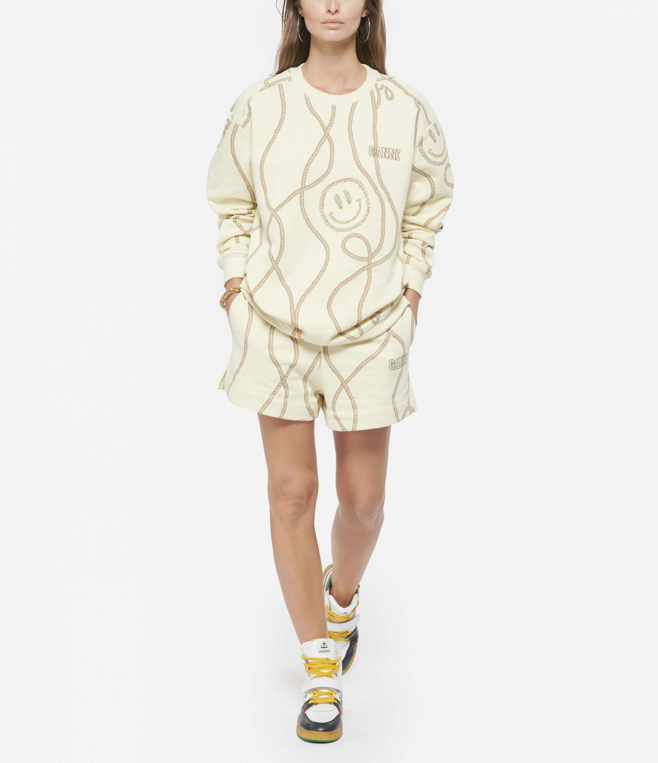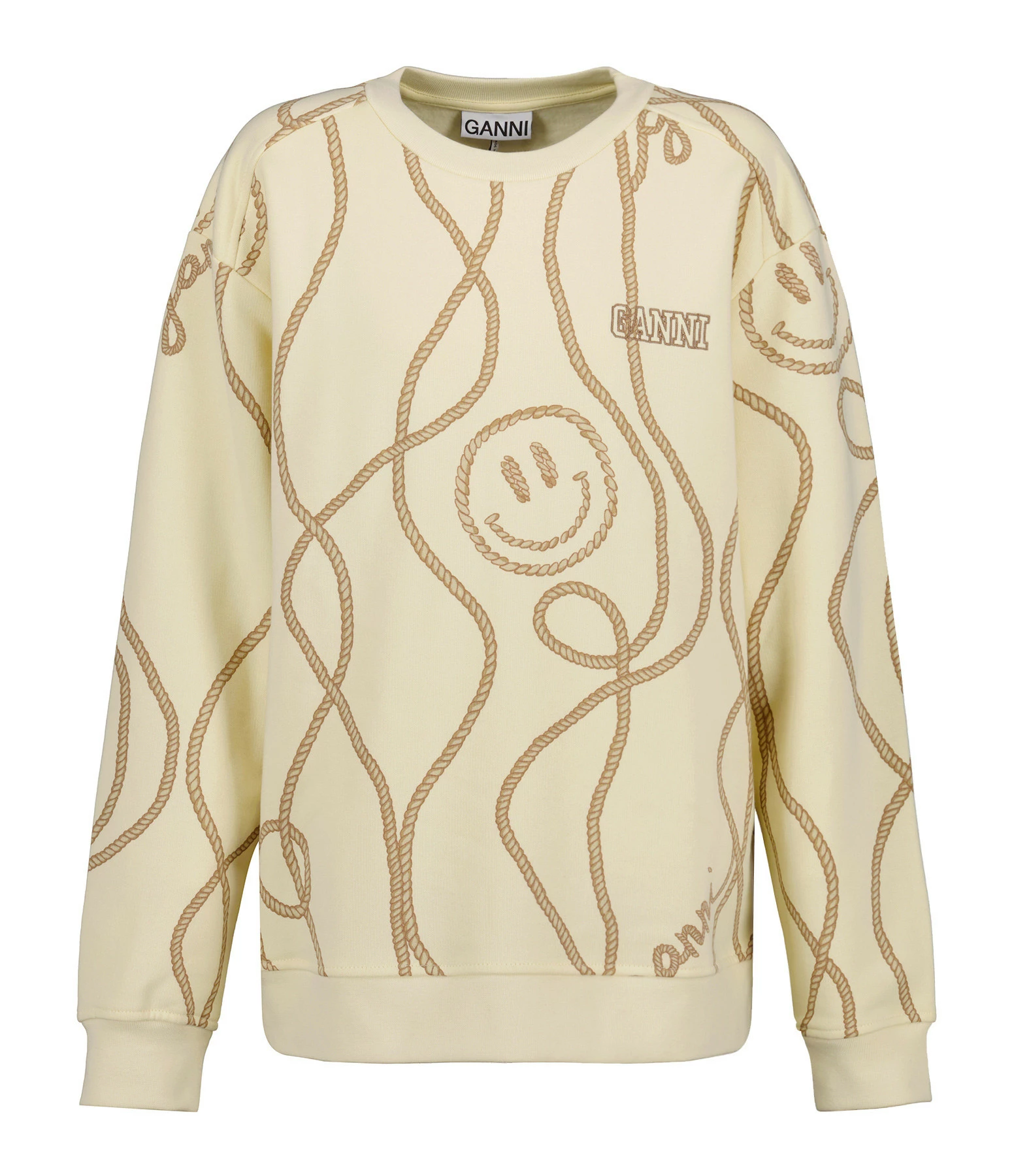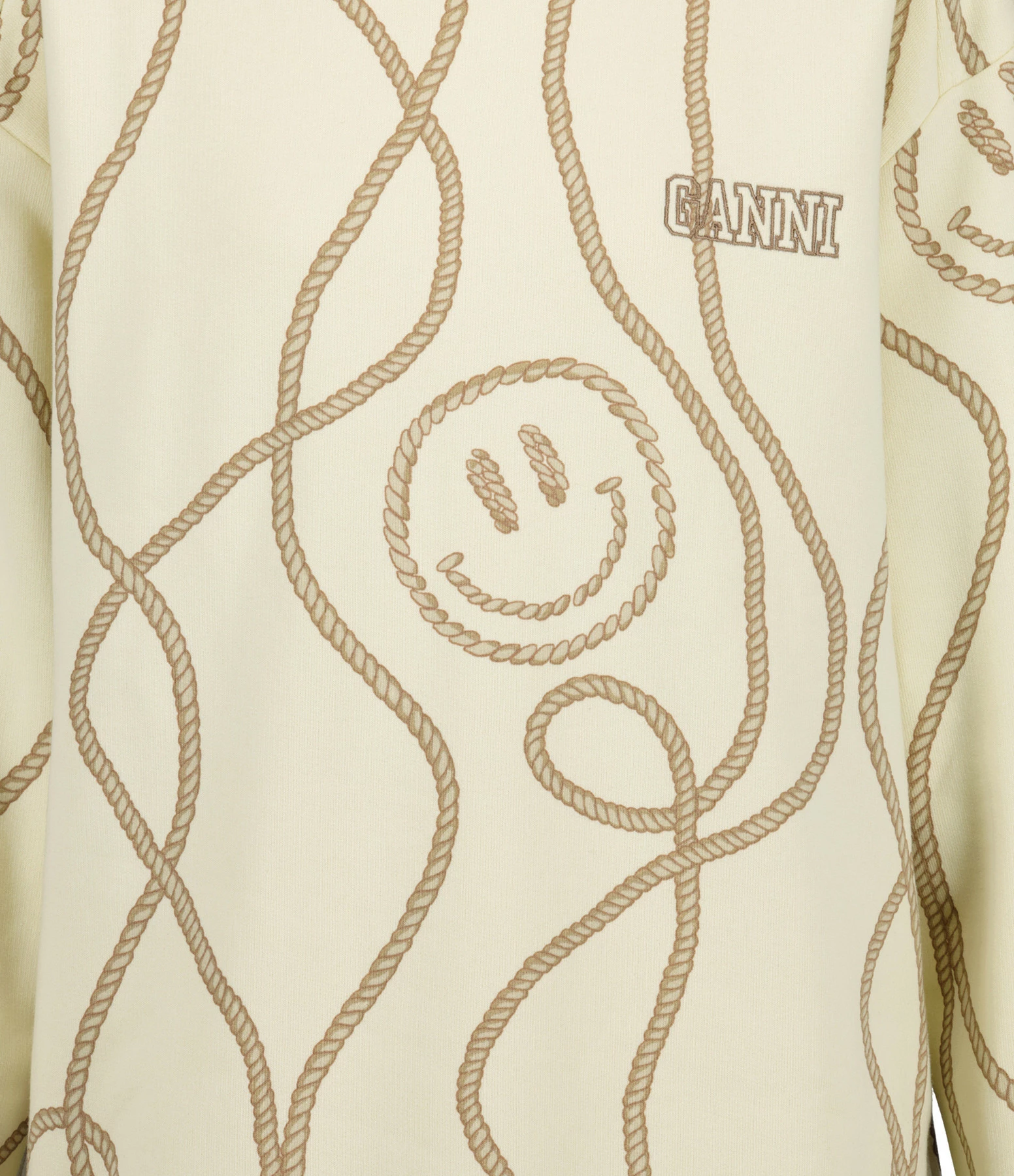 Sweatshirt en coton biologique imprimé beige. Col rond. Manches longues et resserrées aux poignets. Broderie noire “GANNI” sur la poitrine. Coupe ample. Base droite.