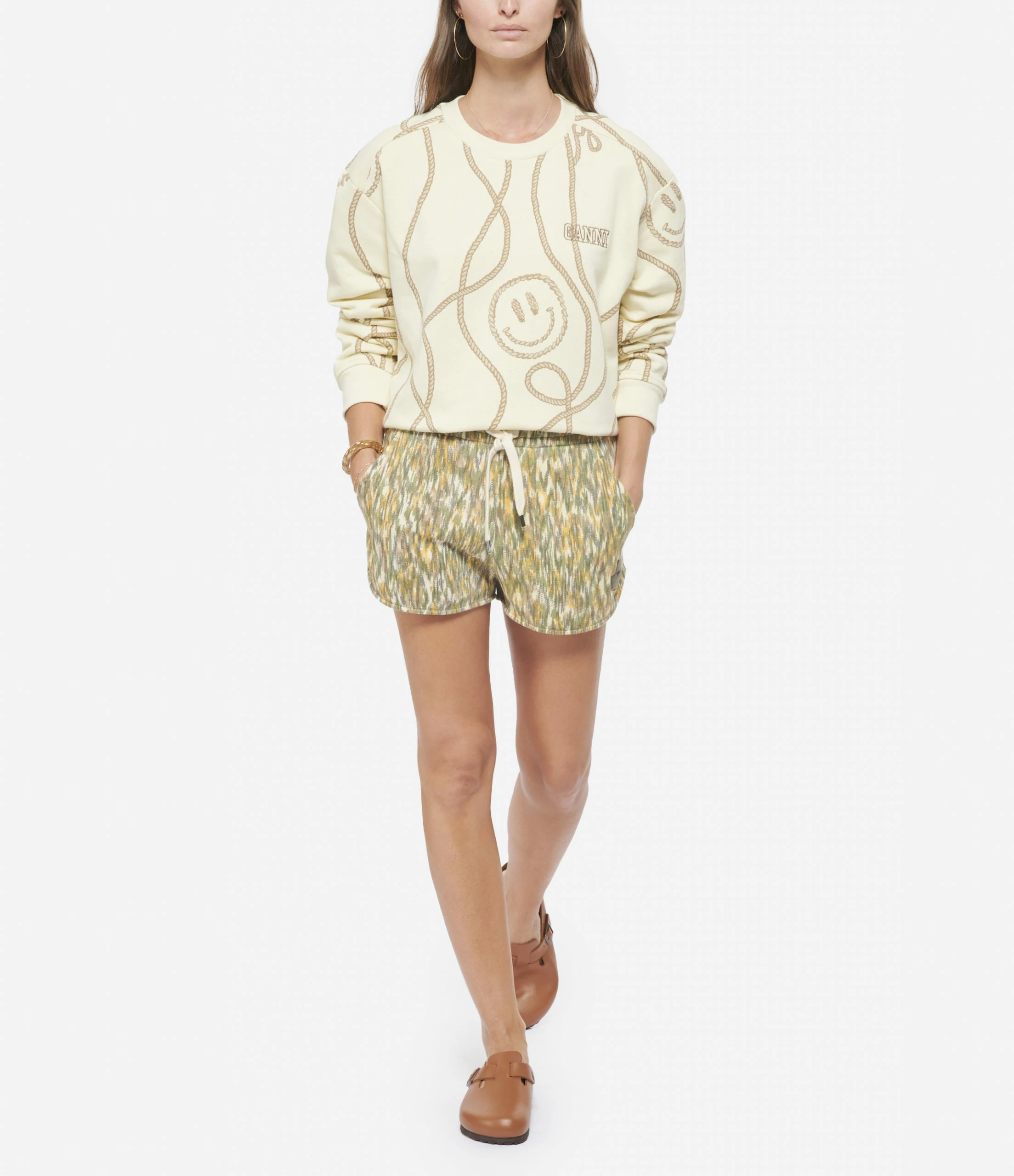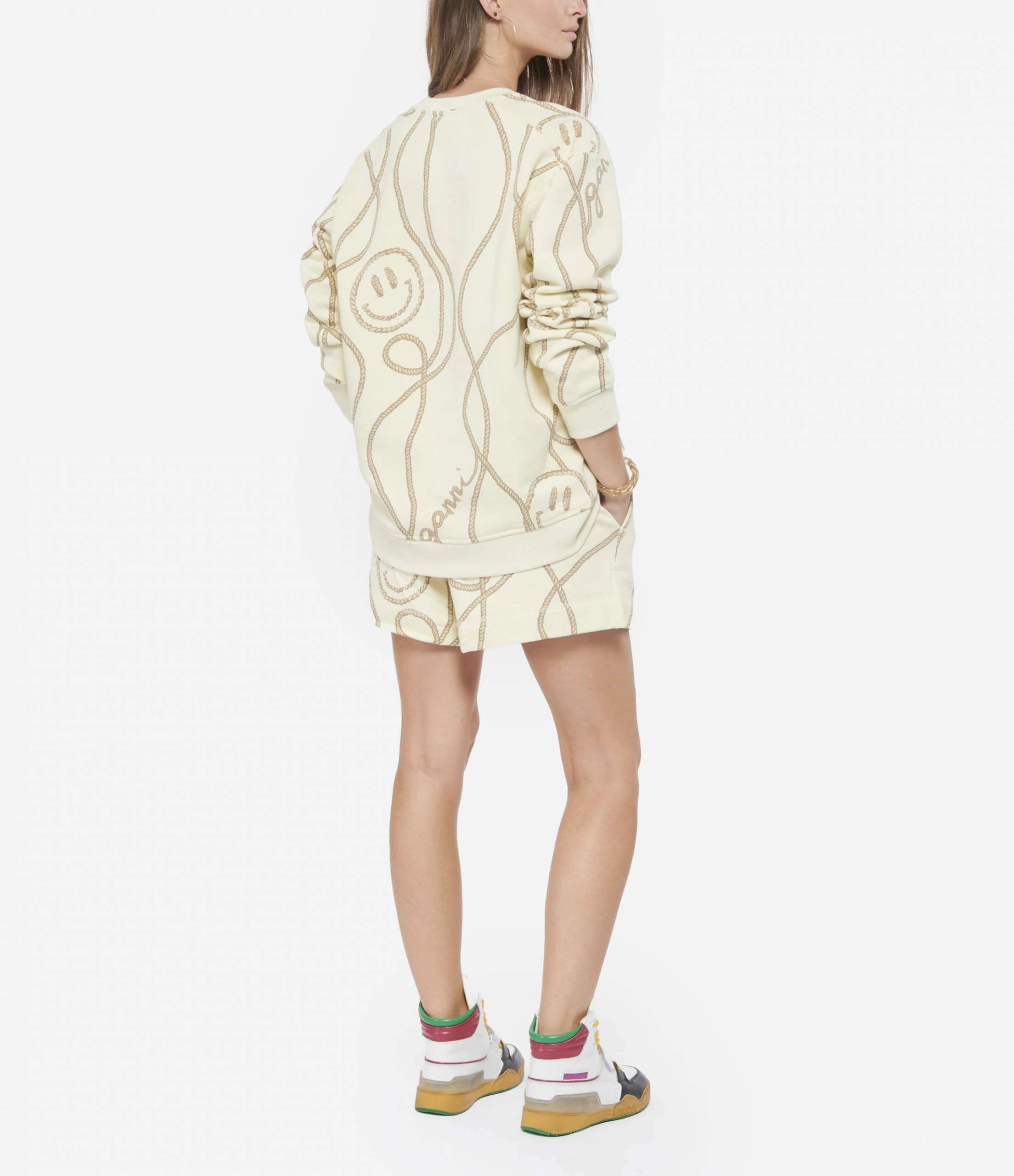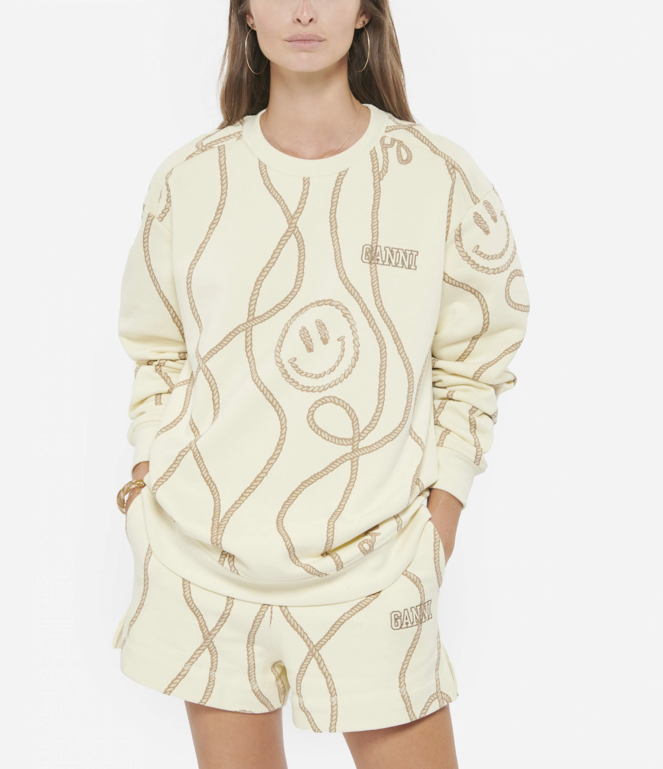 Sweatshirt en coton biologique imprimé beige. Col rond. Manches longues et resserrées aux poignets. Broderie noire “GANNI” sur la poitrine. Coupe ample. Base droite.