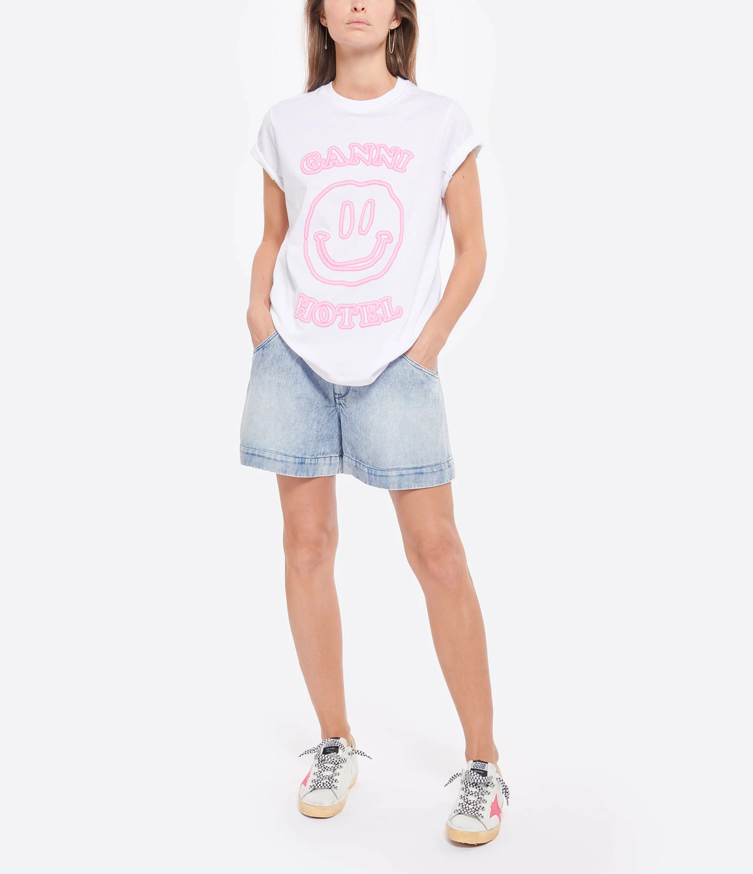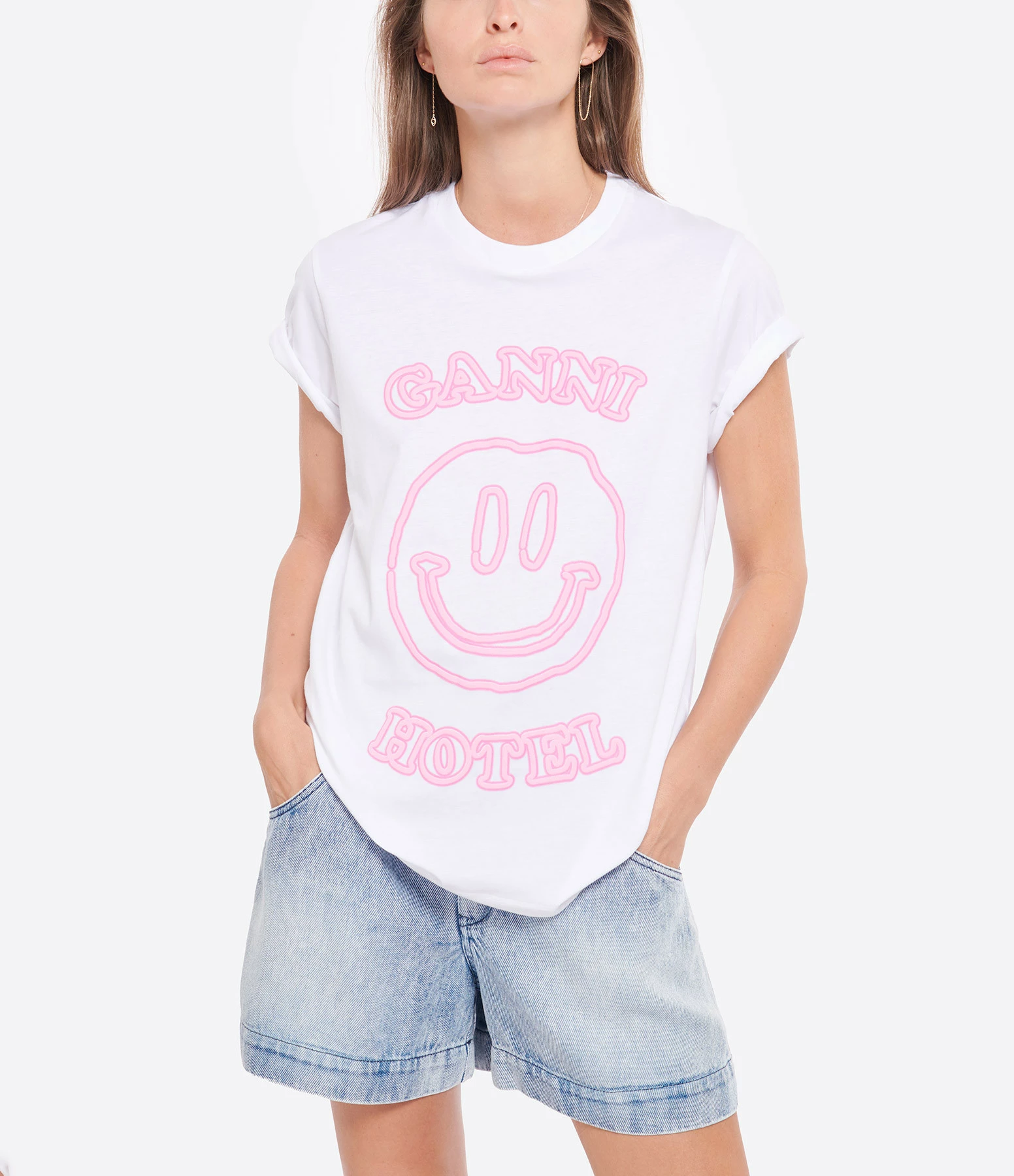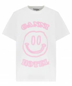 Tee-shirt en coton blanc. Flockage logo et inscription “GANNI HOTEL” en rose sur le devant. Col rond. Manches courtes. Coupe droite. Base droite. Non doublé.