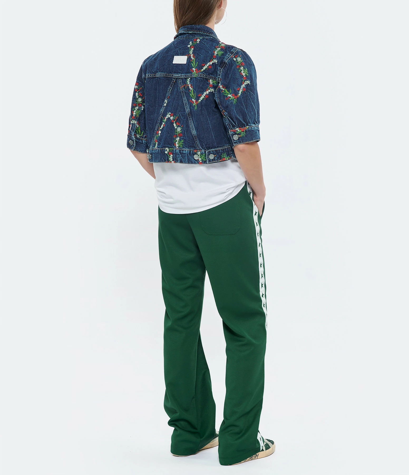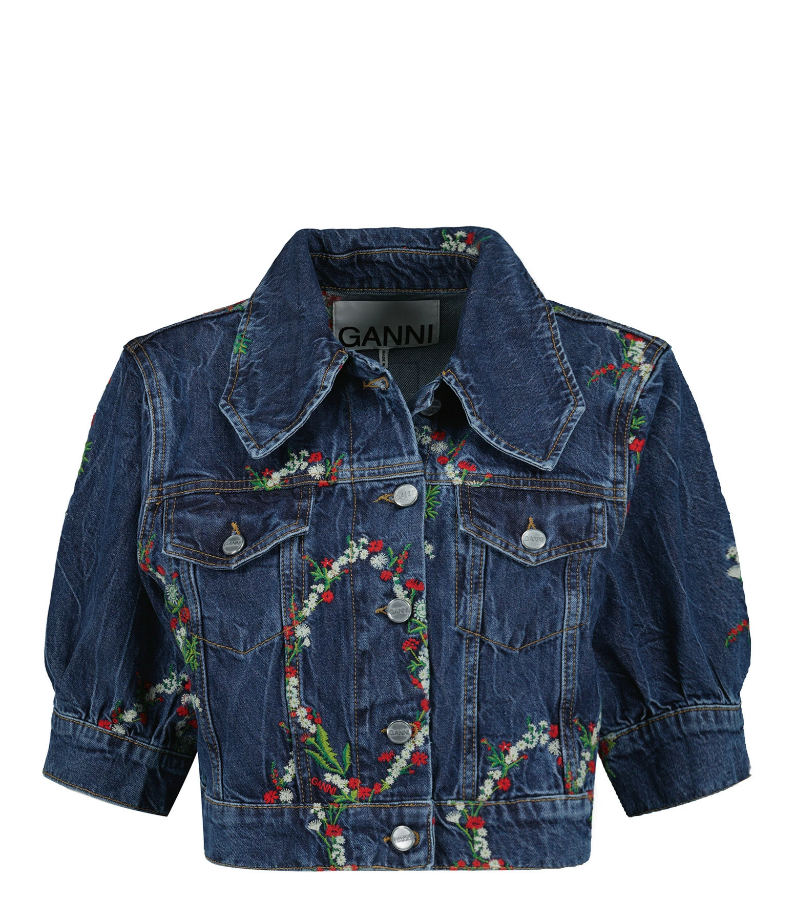 Veste cropped en jean ornée de broderie floral. Col plat avec pointes triangulaires. Manches 3/4 ballon avec fente boutonnée. Fermeture boutonnée sur le devant. Boutons métalliques gravés de l’inscription “GANNI”. Deux poches poitrine plaquées à rabat. Patch écru avec inscription “GANNI” brodée en blanc dans le dos. Patte de serrage sur le bas du vêtement. Coupe ajustée. Base droite. Non doublée.