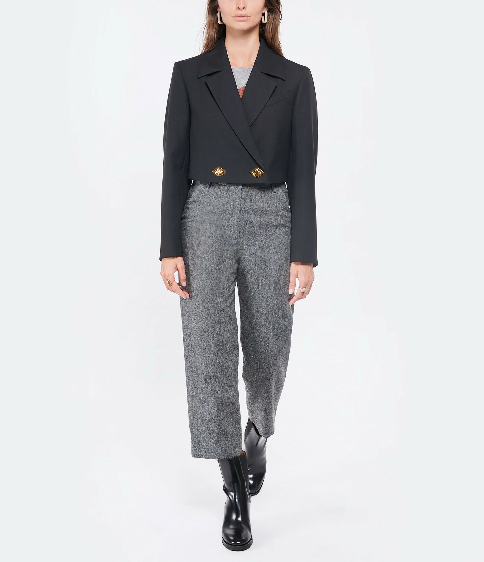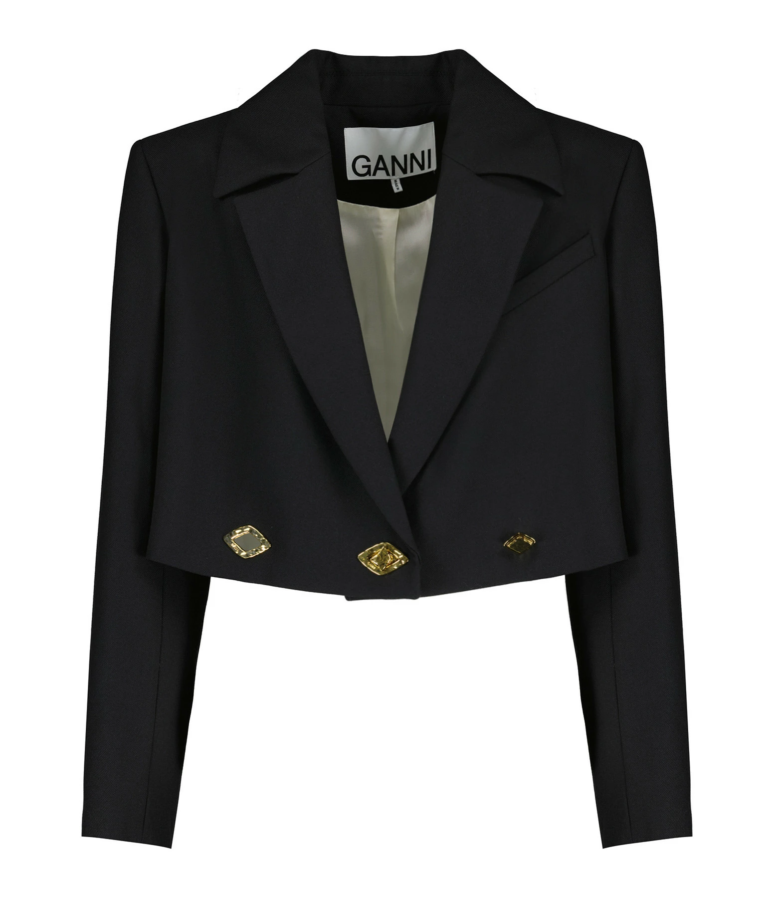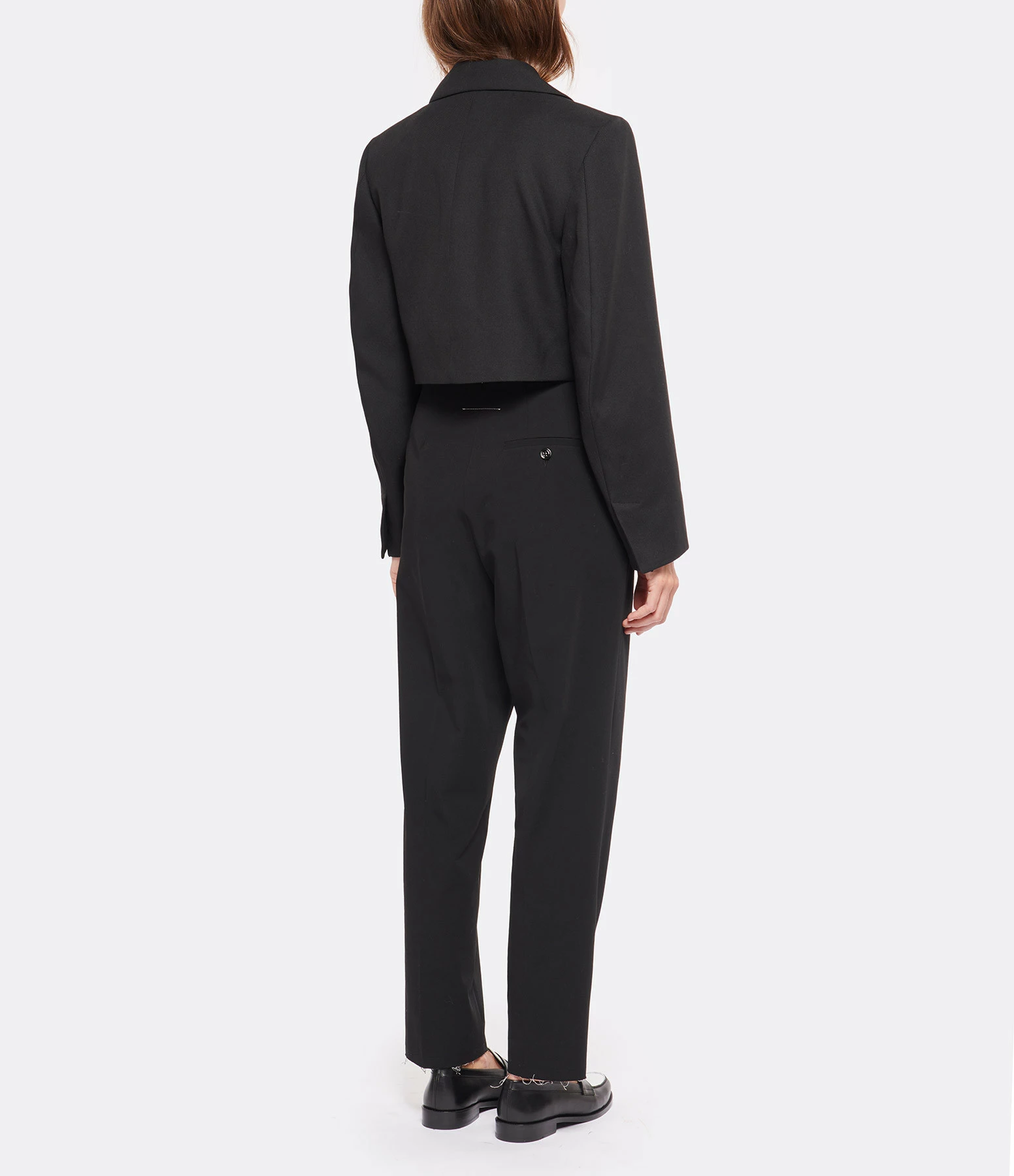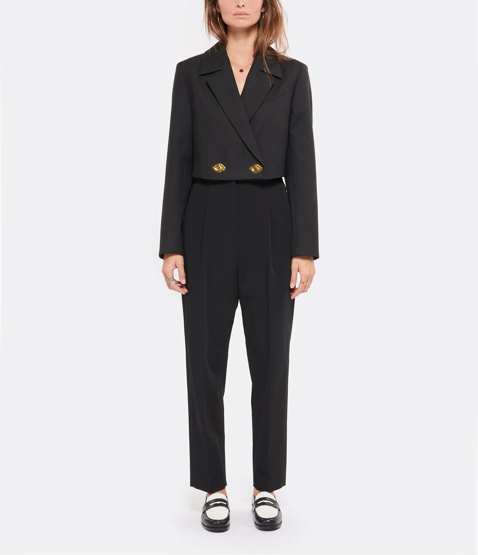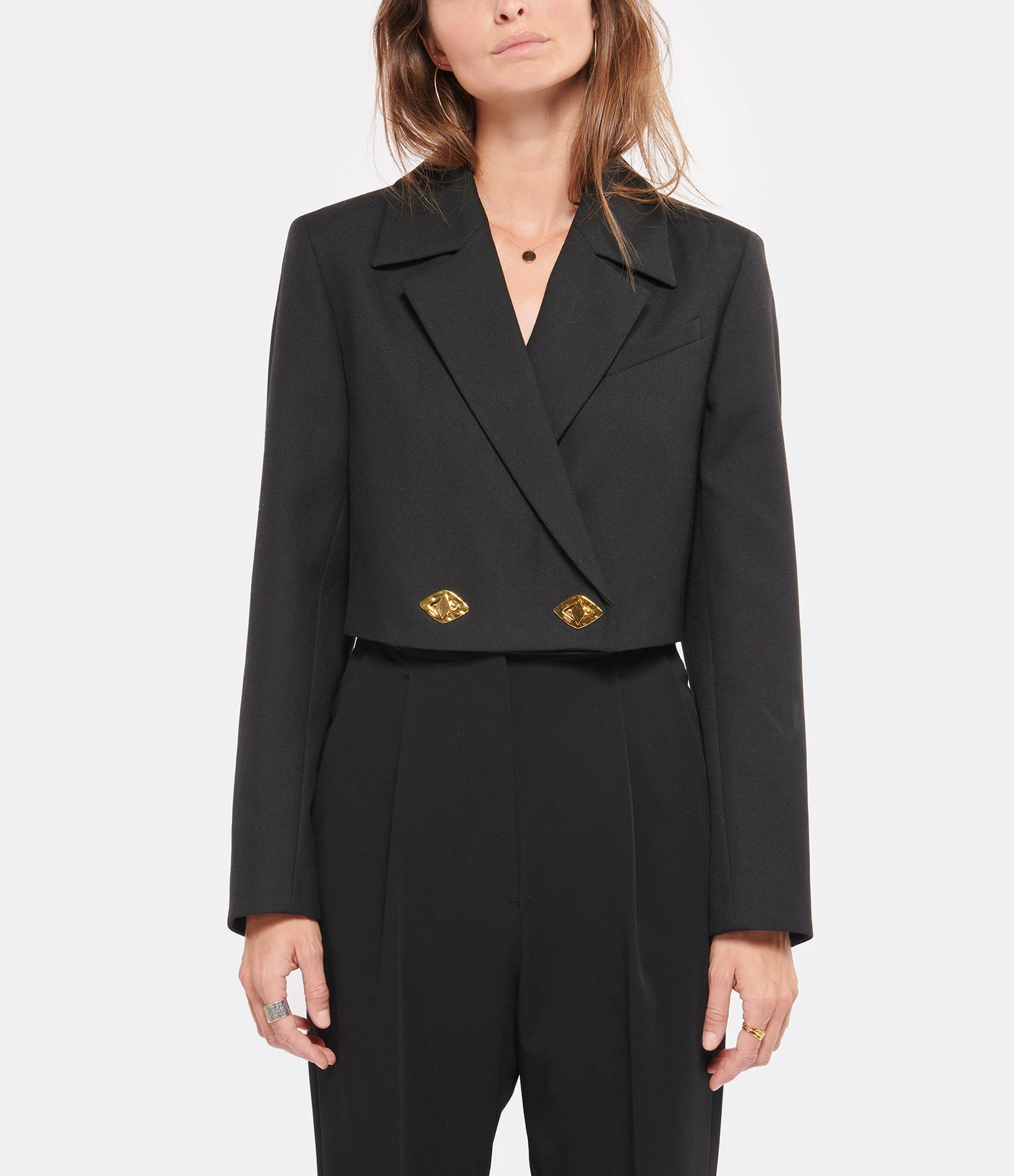 Veste courte de costume noir. Col tailleur. Deux boutons dorés. Manches longues. Coupe droite. Base droite. Doublée.