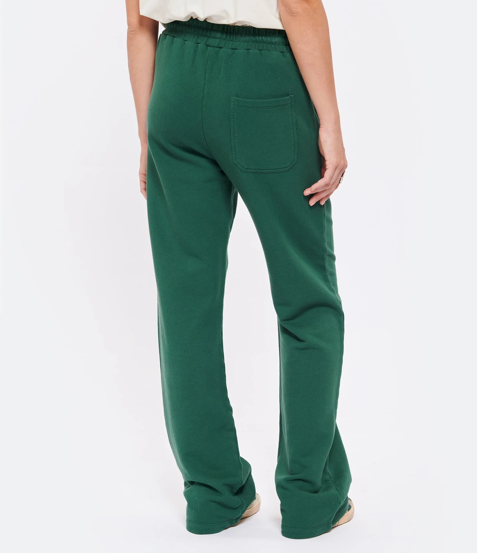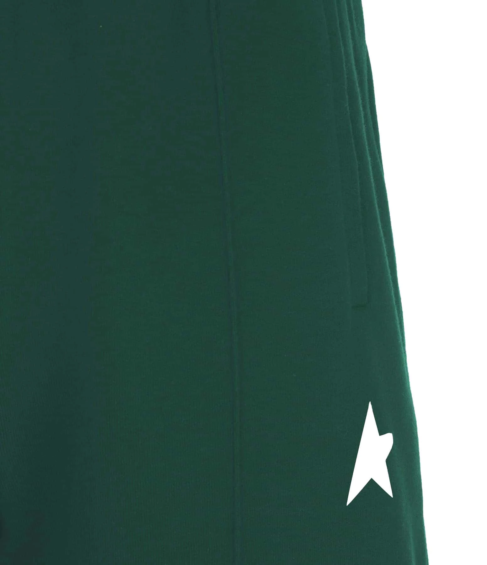 Pantalon de jogging en coton molletonné vert. Logo “étoile” sérigraphié en blanc sur le devant. Taille élastiquée avec liens de serrage à l’intérieur. Deux poches passepoilées sur le devant. Une poche plaquée dans le dos. Deux plis surpiqués sur le devant. Coupe droite ample. Base droite.