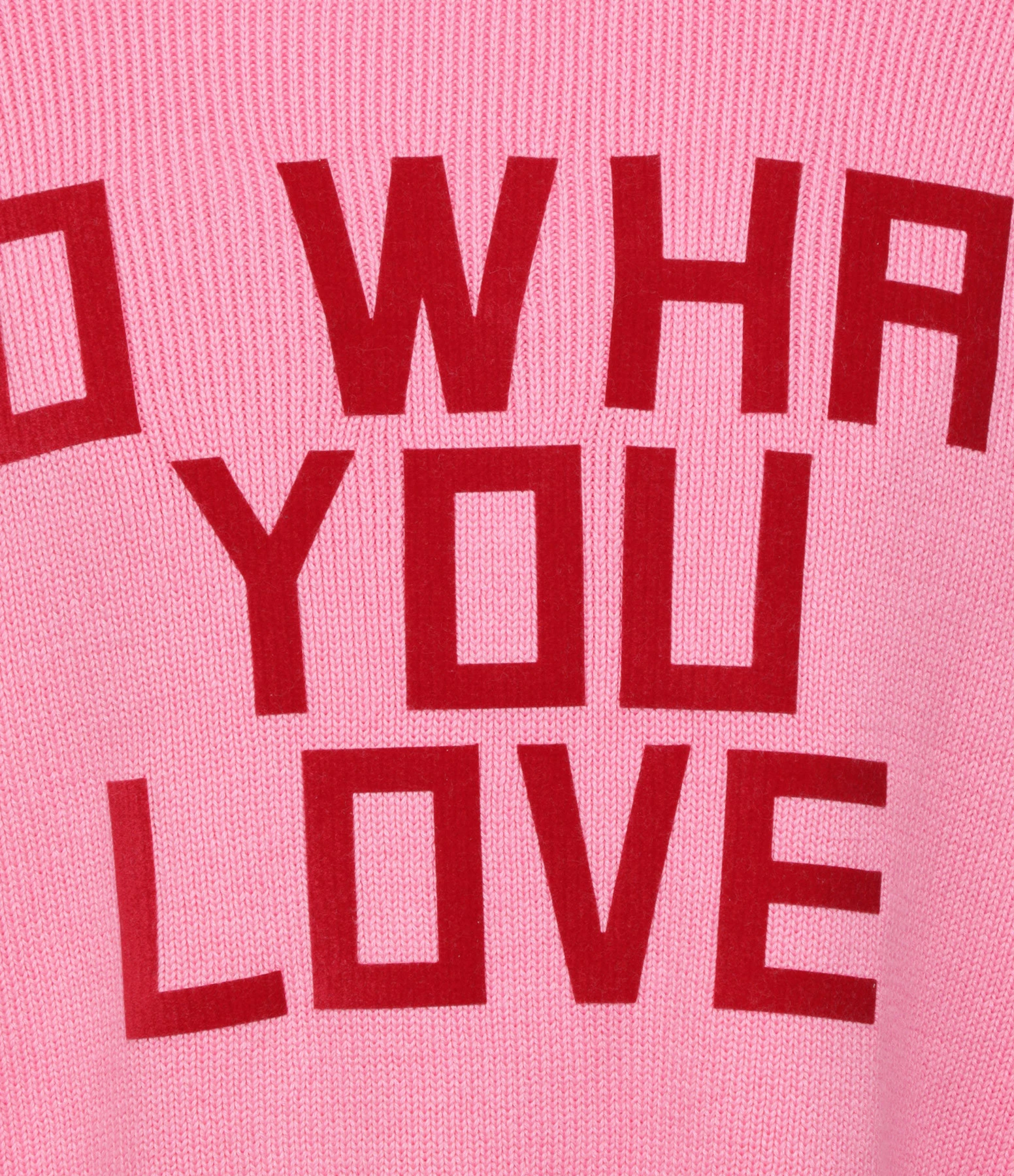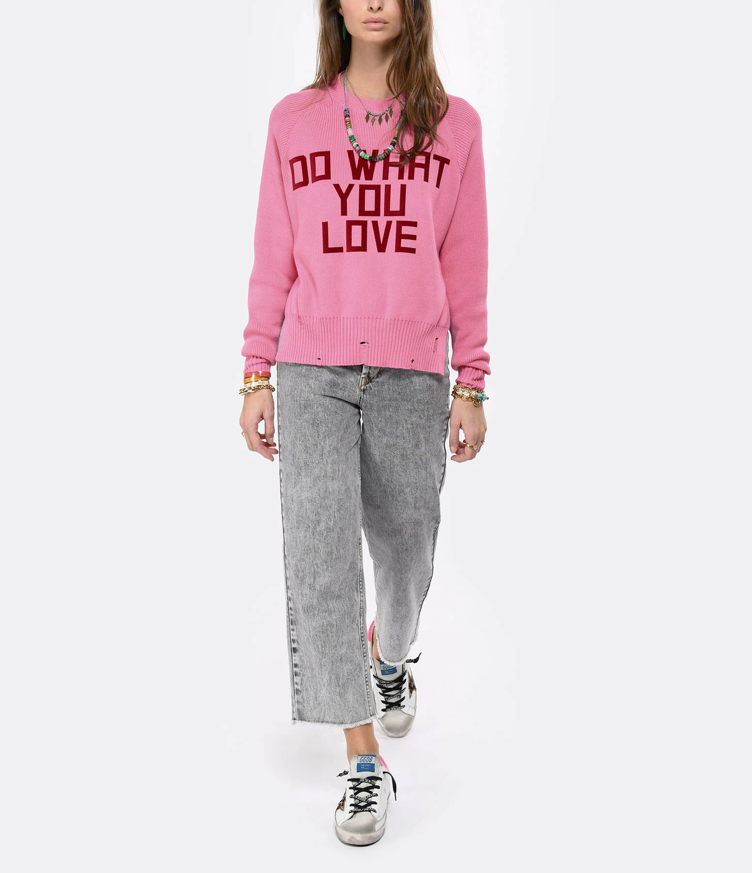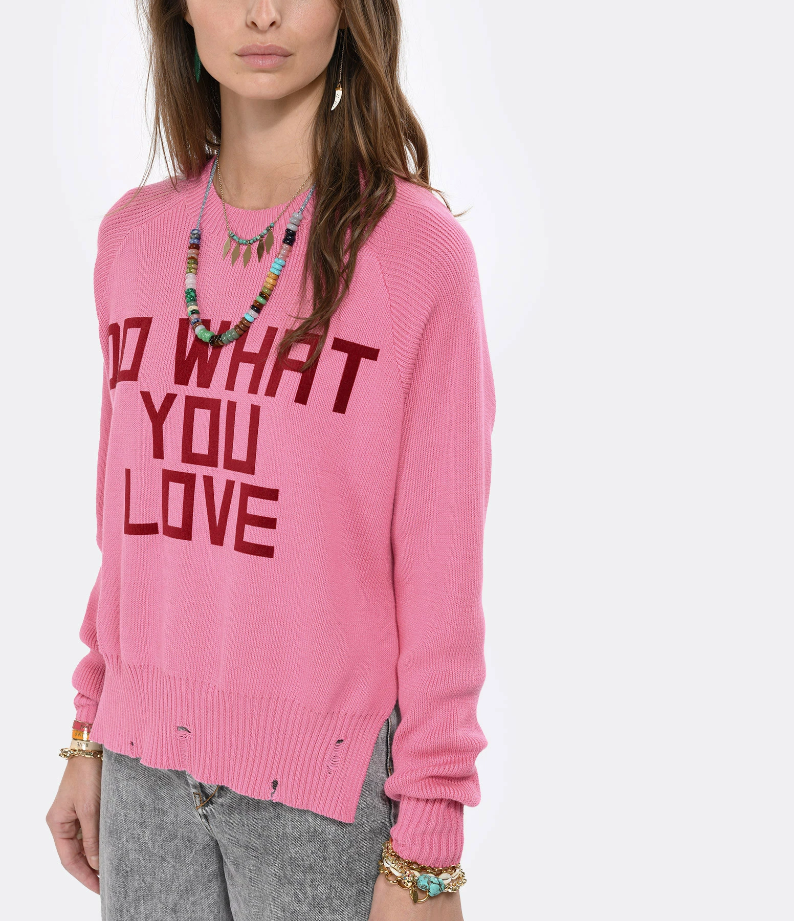 Pull côtelé en coton rose. Sérigraphie “Do what you love” à l’avant. Col rond. Manches longues. Coupe droite. Base droite, fendue sur les côtés. Effet usé par endroits volontaire.