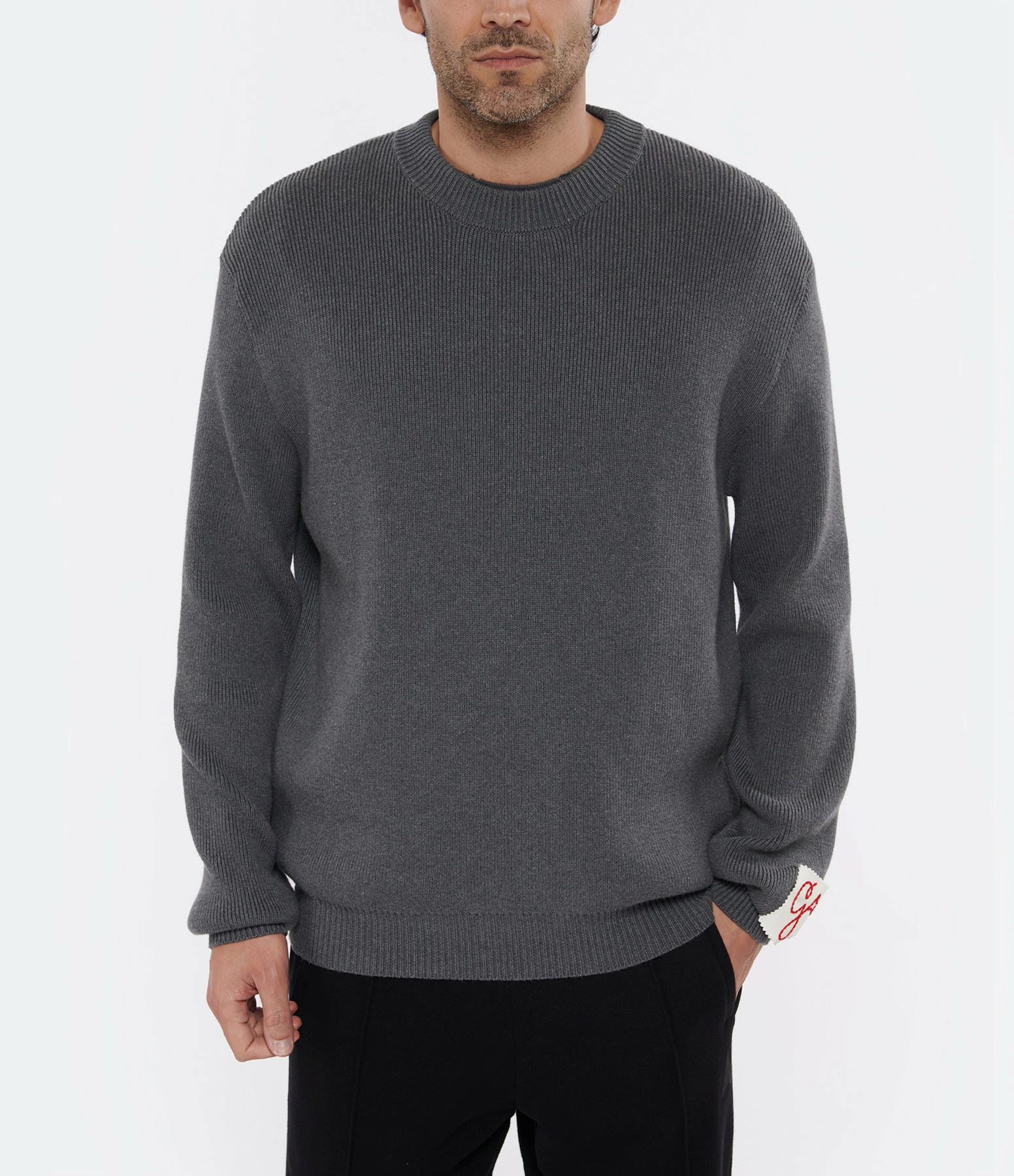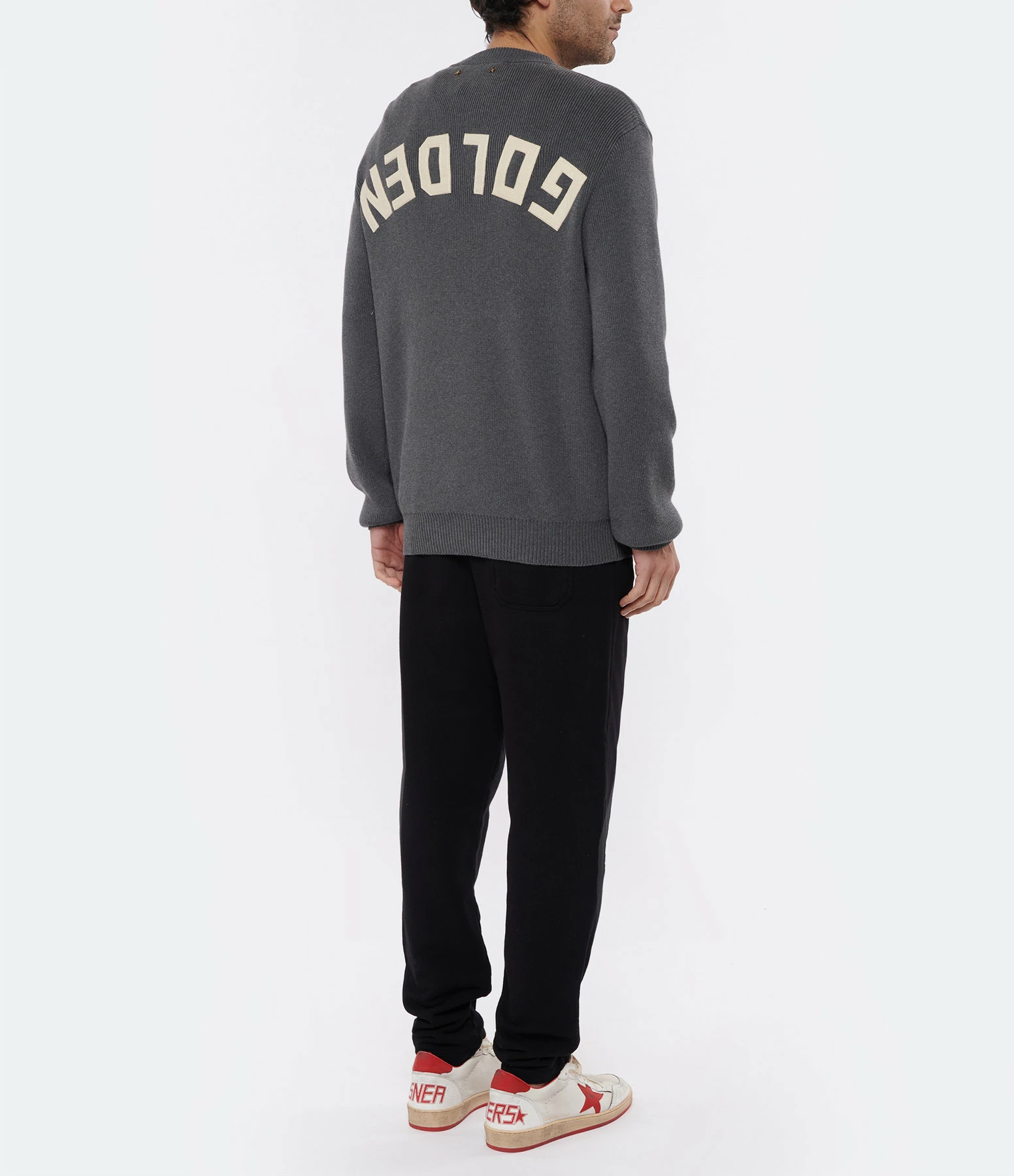 Pull en coton gris foncé pour homme. Col rond. Manches longues. Inscription “GOLDEN” en feutrine blanche, à l’envers dans le dos. Coupe droite. Base droite.