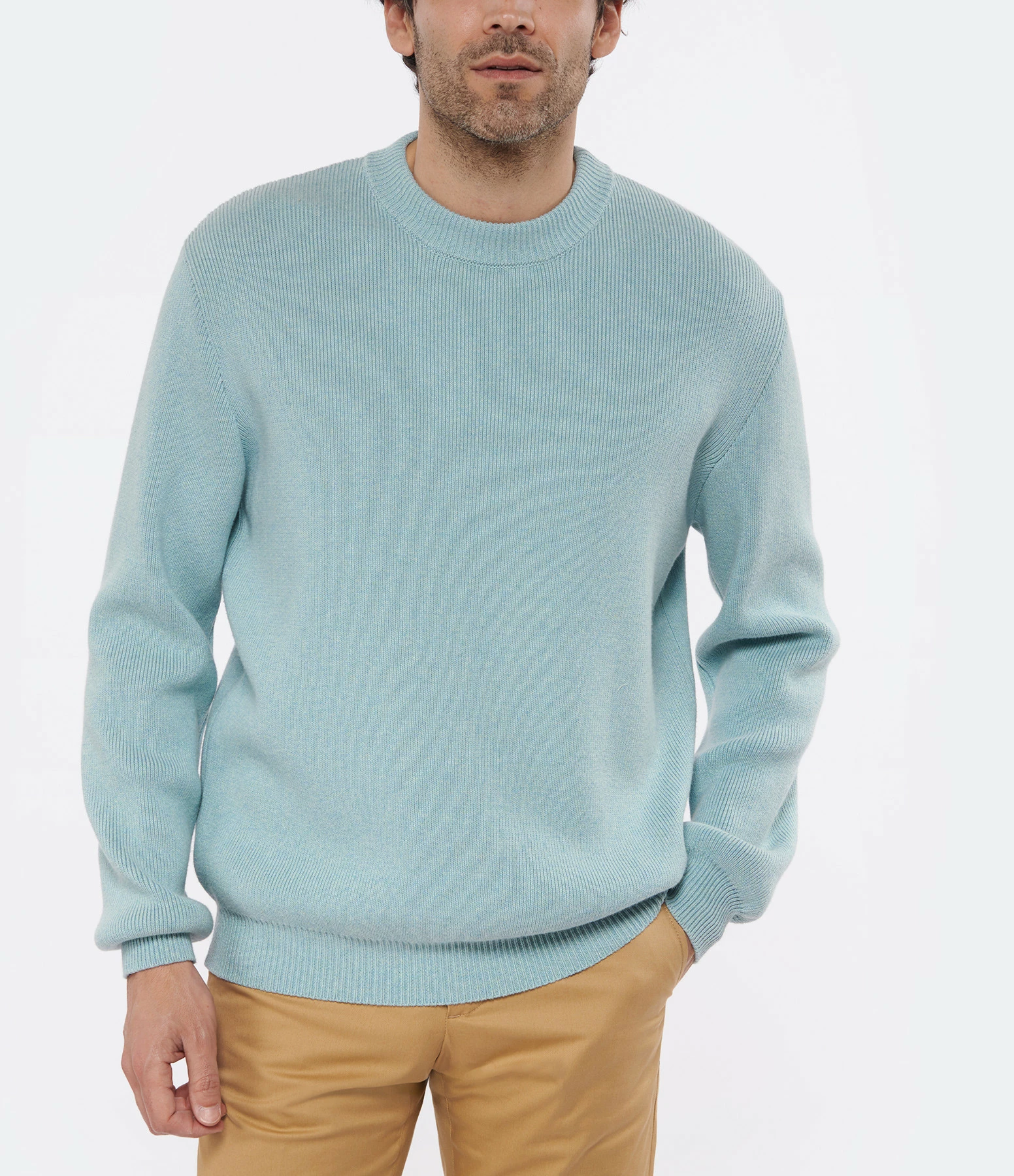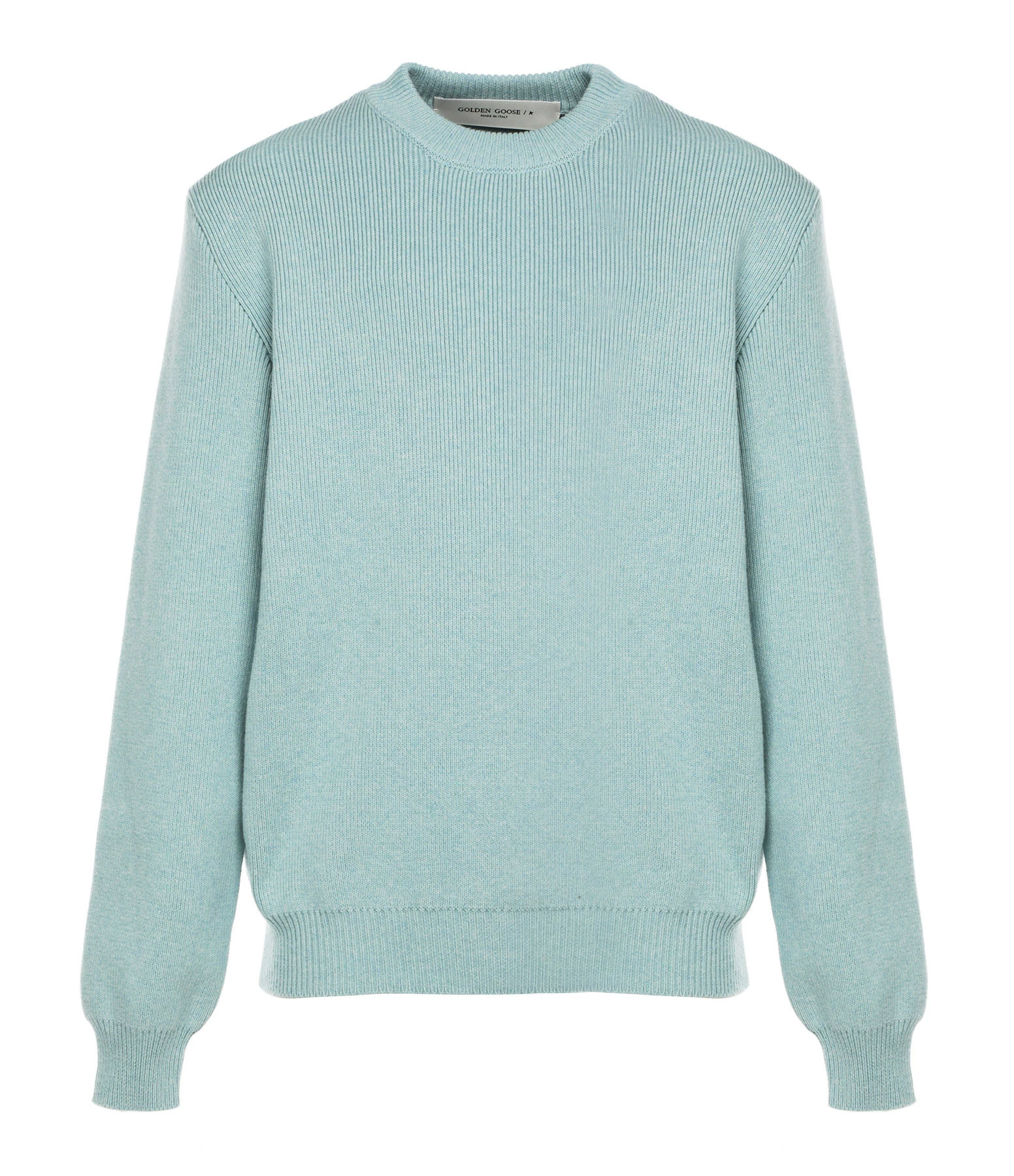 Pull en coton bleu pour homme. Col rond. Manches longues. Inscription “GOLDEN” en feutrine blanche, à l’envers dans le dos. Coupe droite. Base droite.