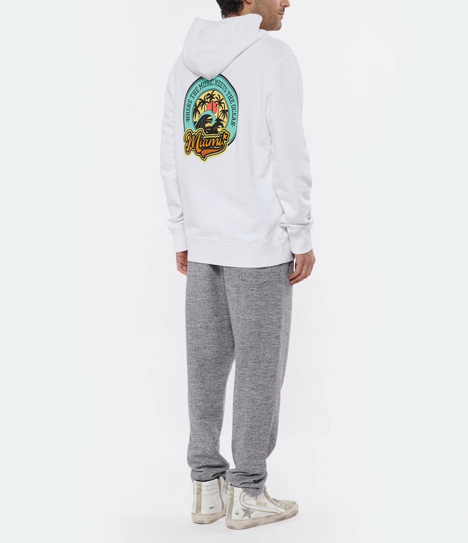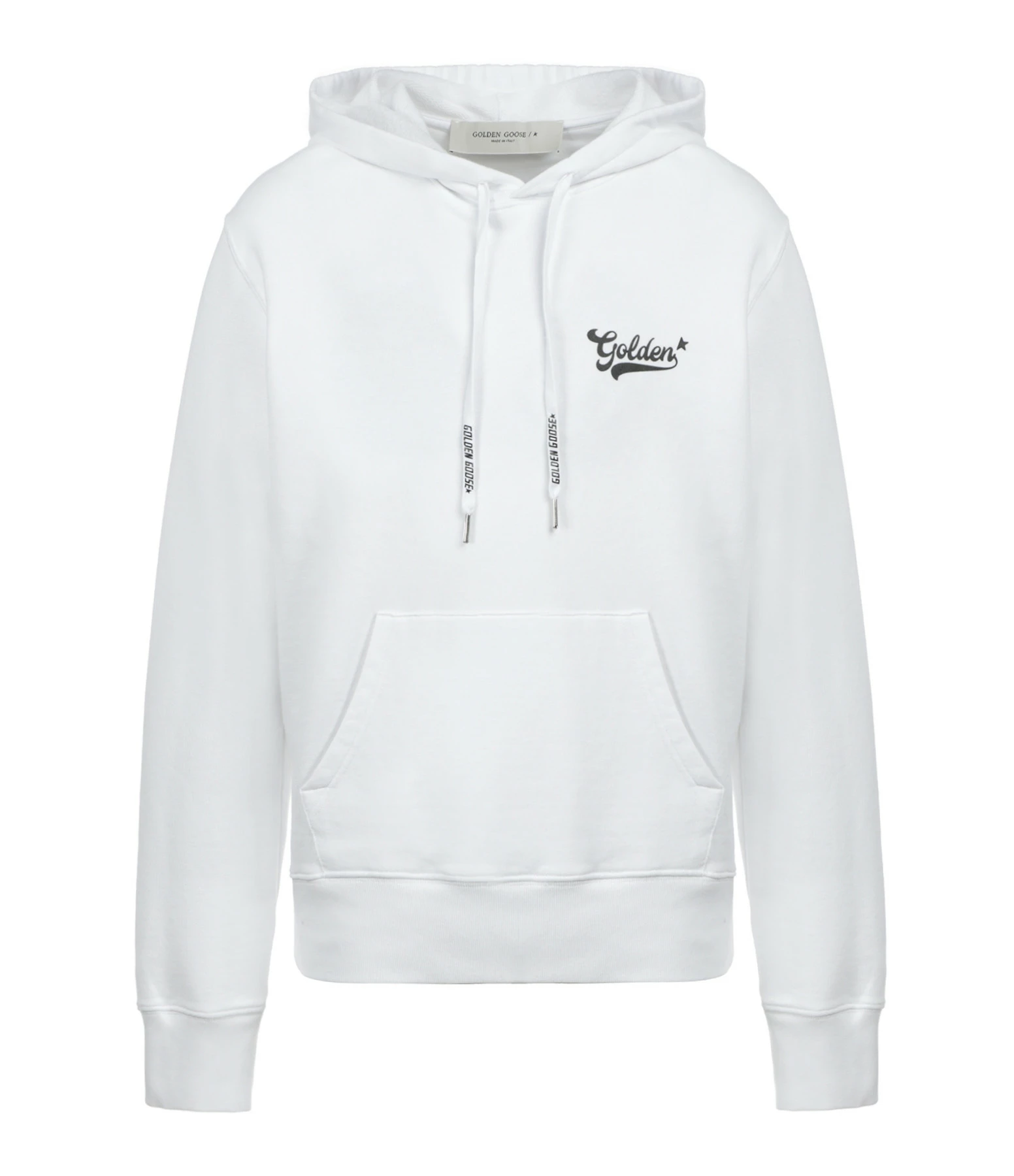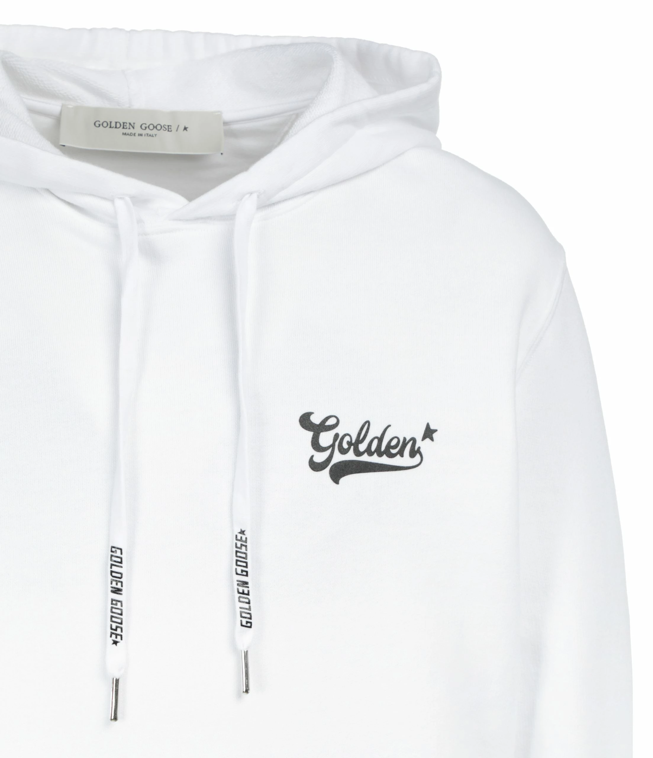 Sweatshirt à capuche en coton blanc, sérigraphie “Golden” sur la poitrine. Sérigraphie et broderie colorée au dos. Manches longues. Coupe droite. Base droite.