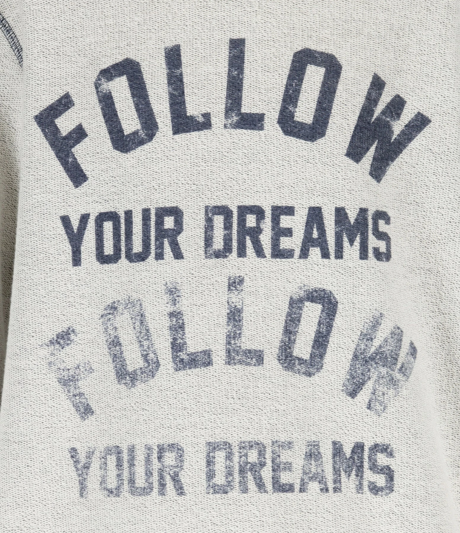 Sweatshirt en coton blanc cassé avec l’inscription “Follow Your Dreams” imprimée en gris sur le devant. Col rond côtelé gris contrastant. Manches longues avec poignets côtelés réhaussés de rayures grises. Double logo étoile en métal bronze dans la nuque. Coupe ample. Base droite côtelée réhaussée de rayures grises.