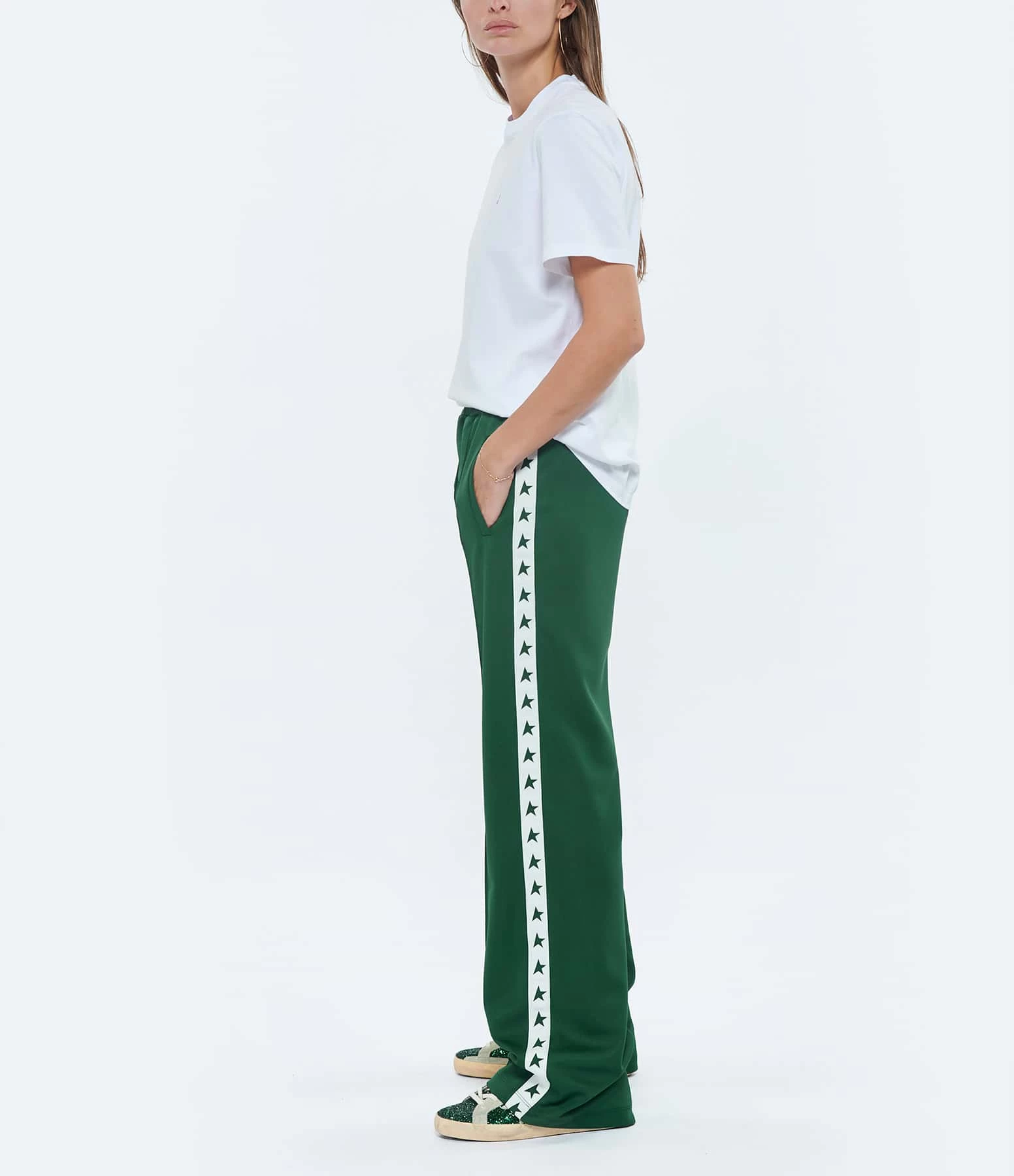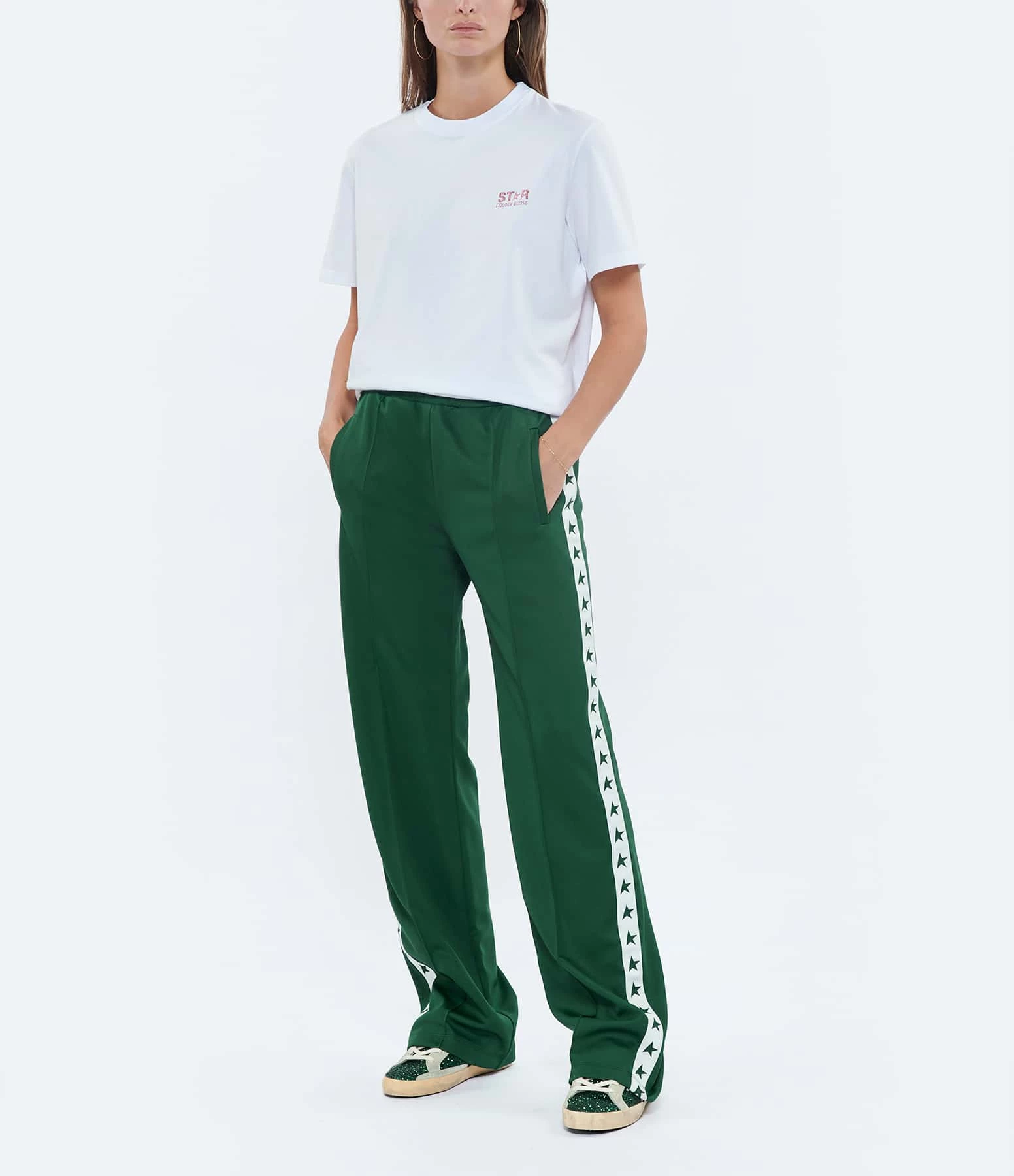 Tee-shirt en coton blanc avec inscription “STAR GOLDEN GOOSE” flockée paillette en rose. Flockage paillette étoile rose dans le dos. Col rond. Manches courtes. Coupe droite. Base droite. Non doublé.
