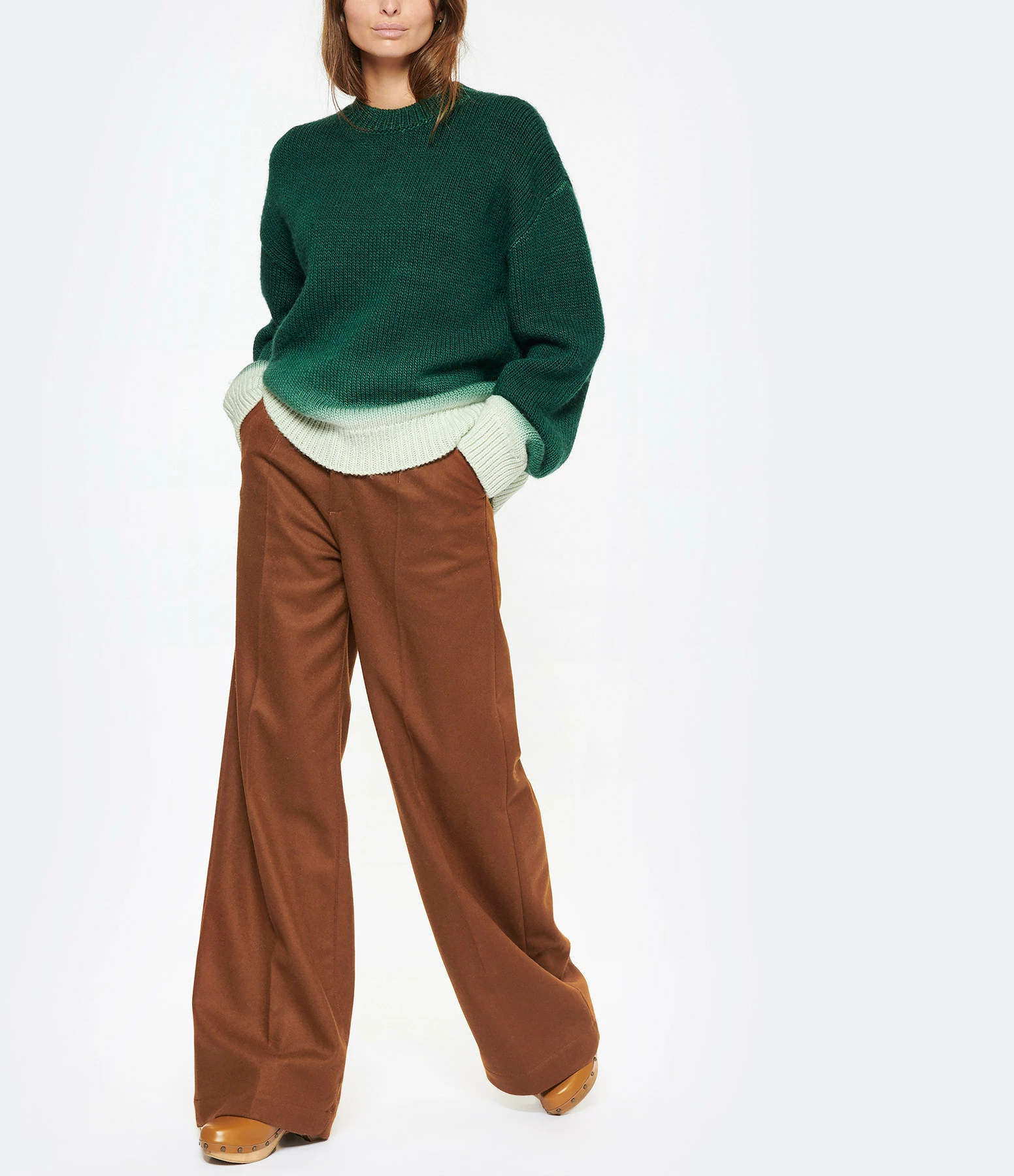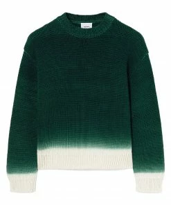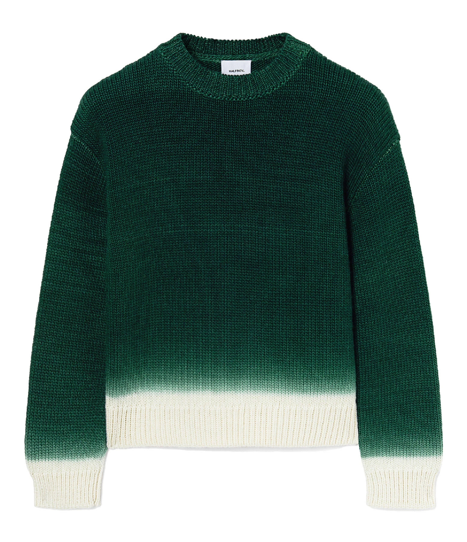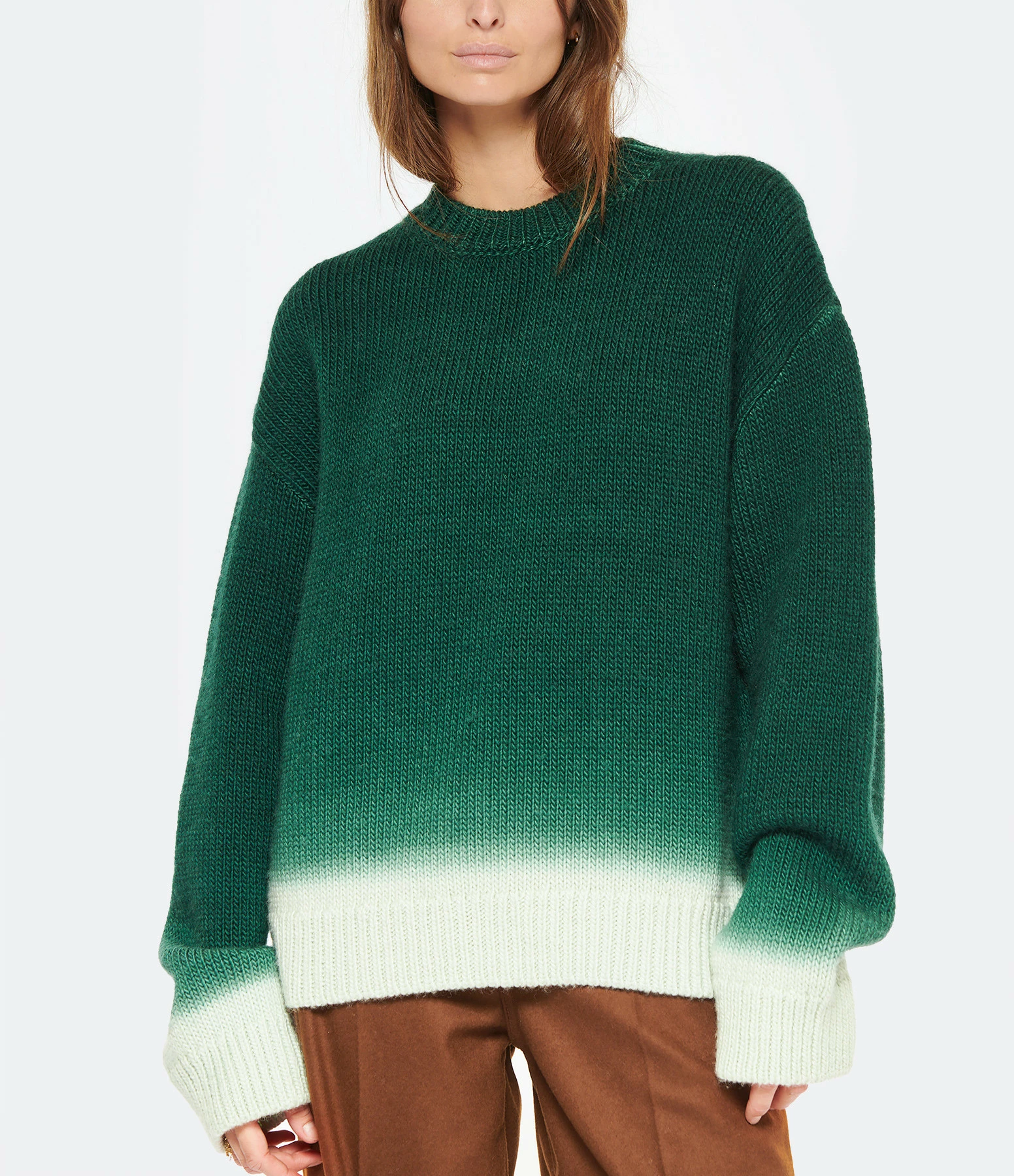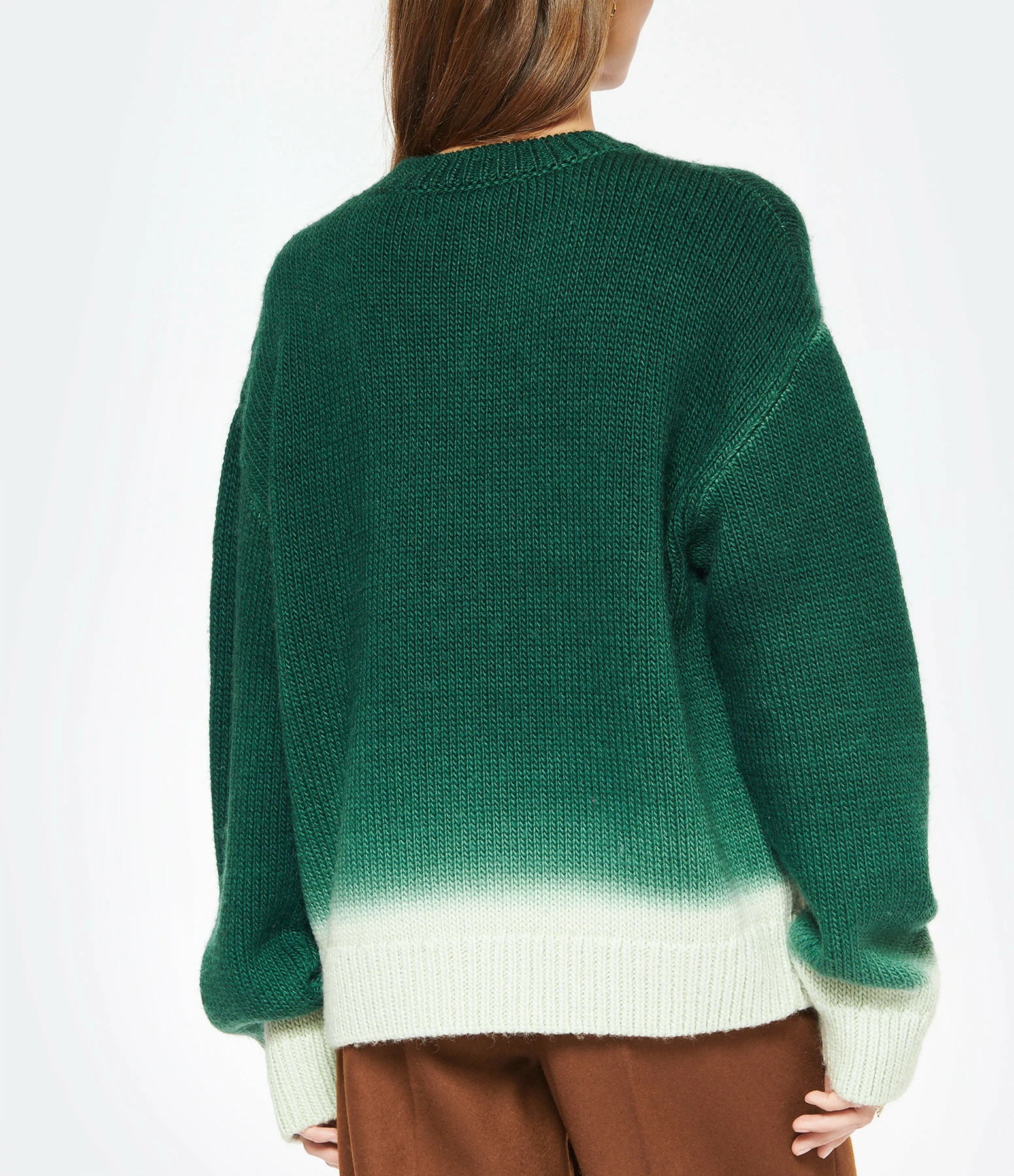 Pull en maille de laine vert tye & dye. Col rond côtelé. Manches longues côtelées. Coupe ample. Base droite côtelée.