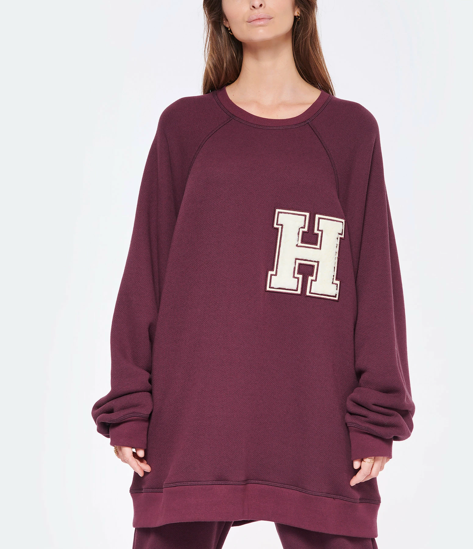 Sweatshirt molletonné en coton mélangé violet avec logo brodé en blanc en tissu éponge sur la poitrine. Col rond côtelé. Manches longues raglan avec poignets côtelés. Coupe oversized. Base droite côtelée.