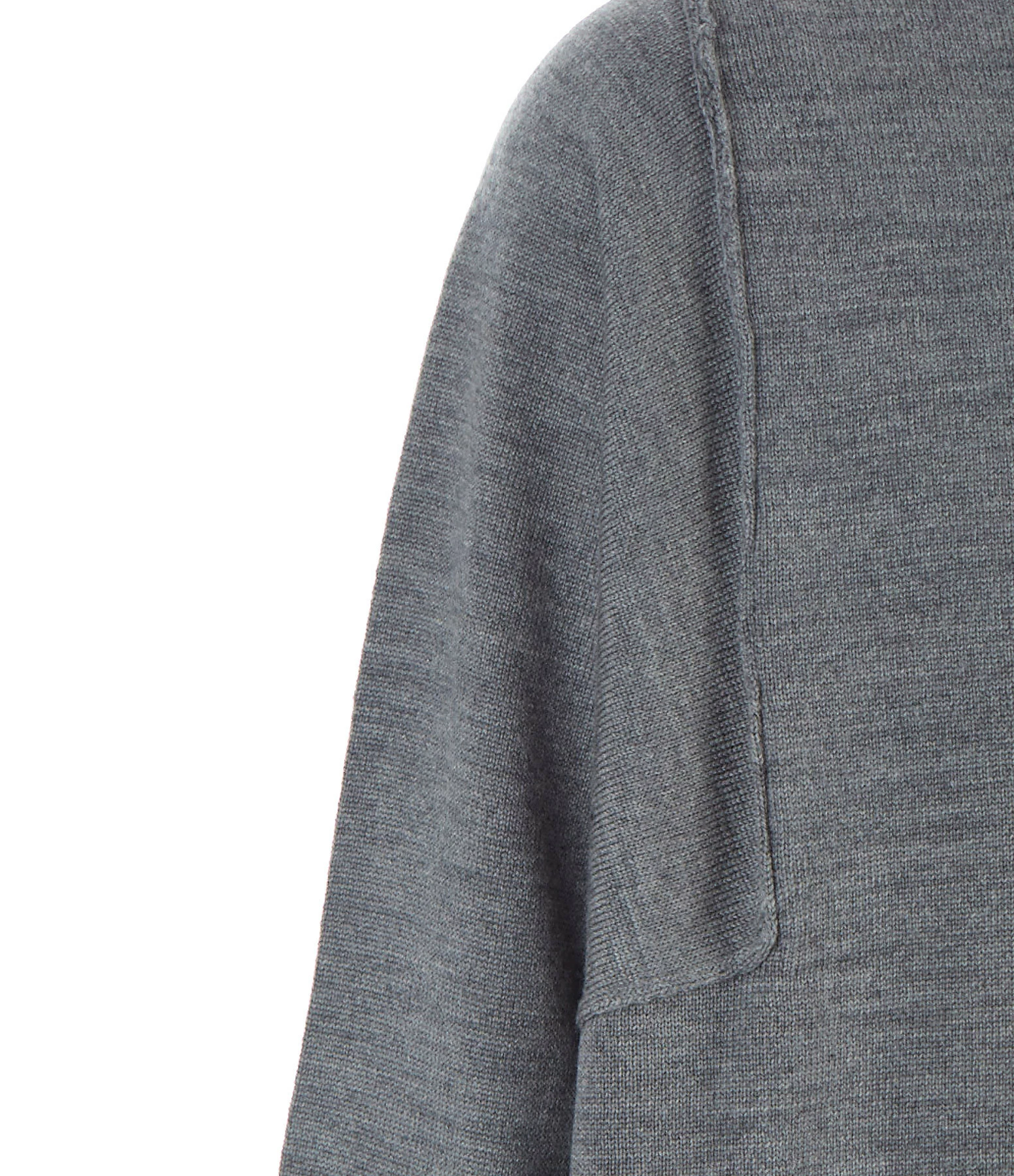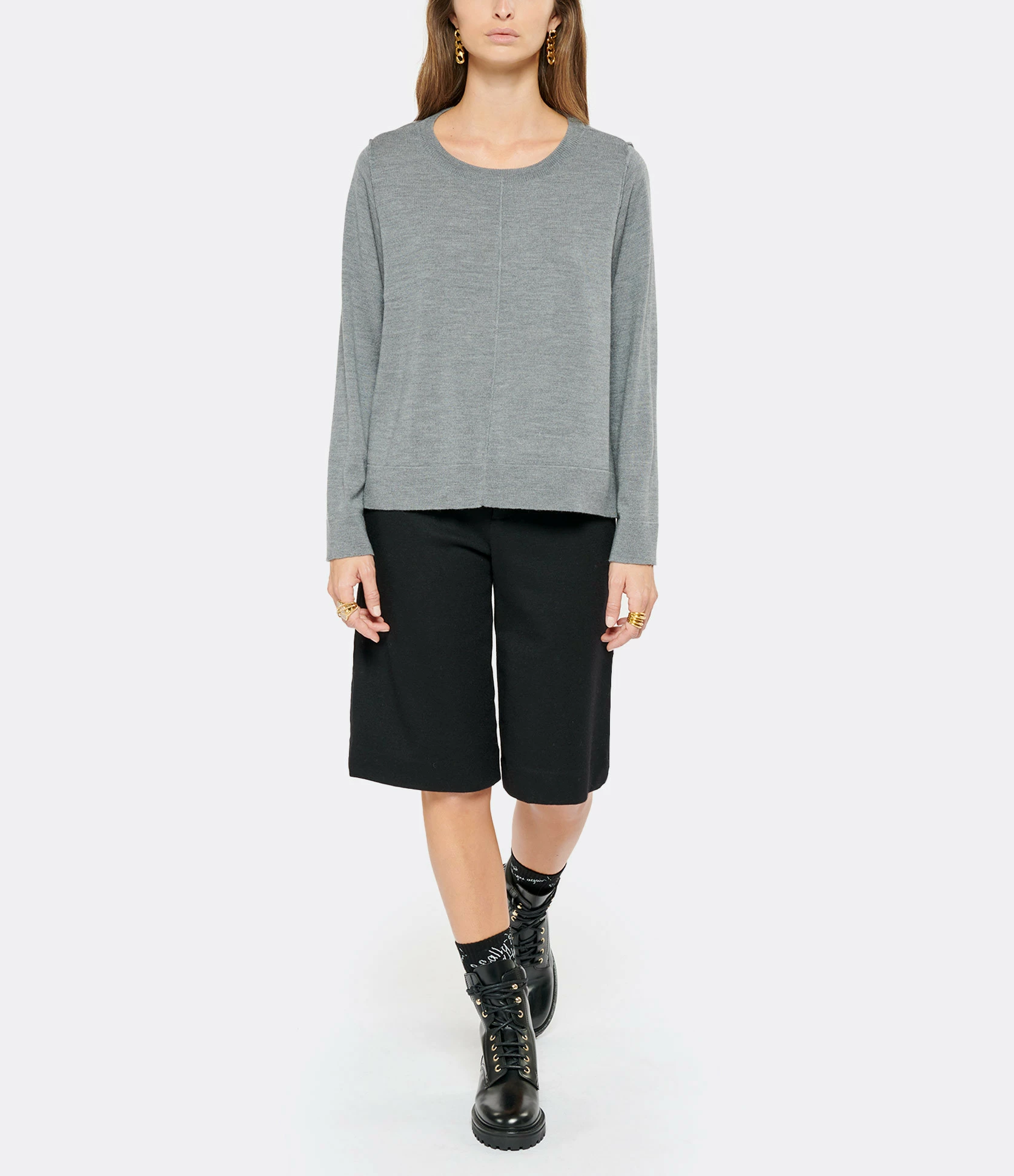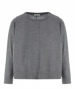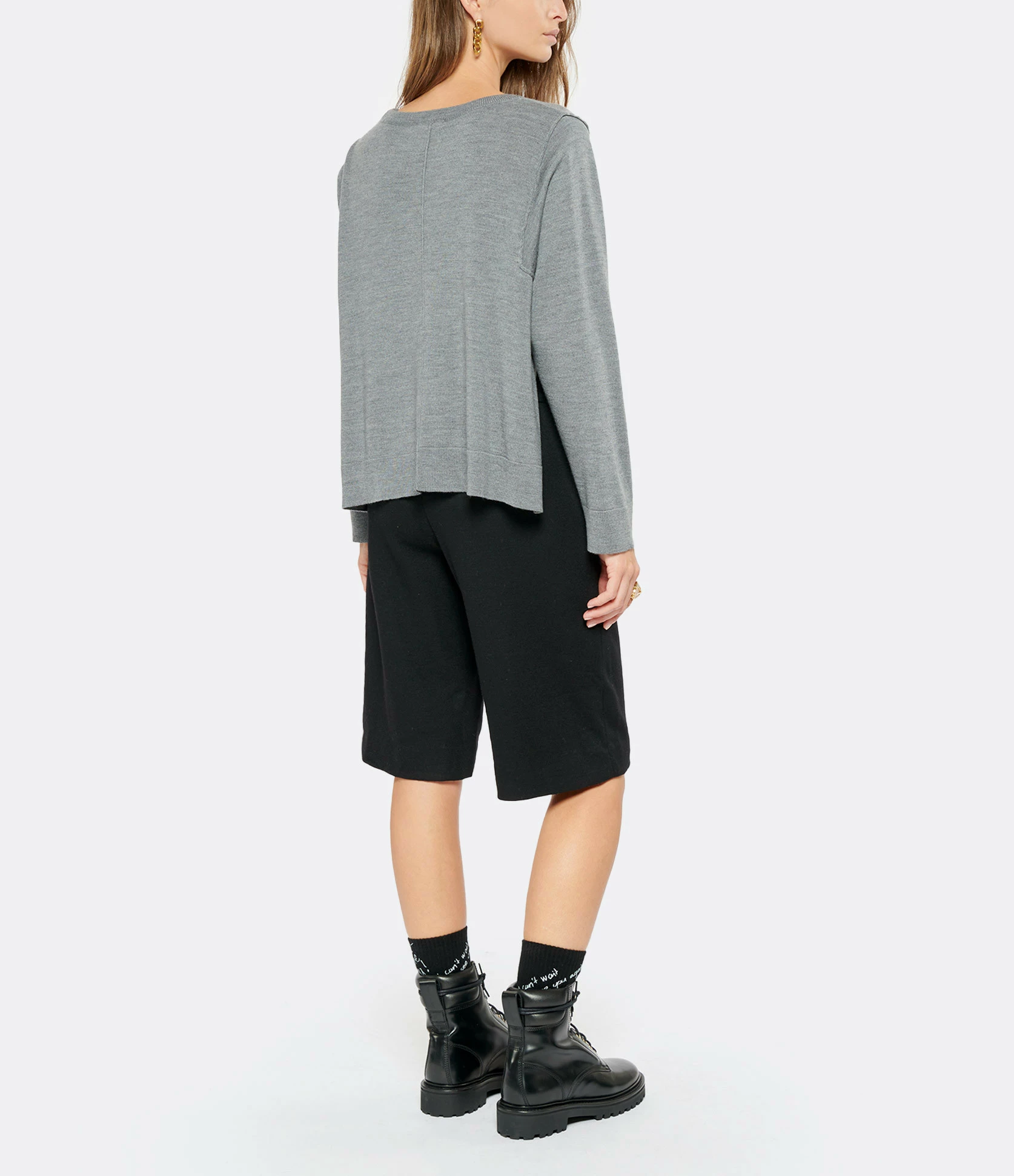 Pull en laine gris. Col rond. Manches longues avec coutures apparentes à l’emmanchure. Fentes de 21 cm sur les côtés. Coupe ample. Base droite.