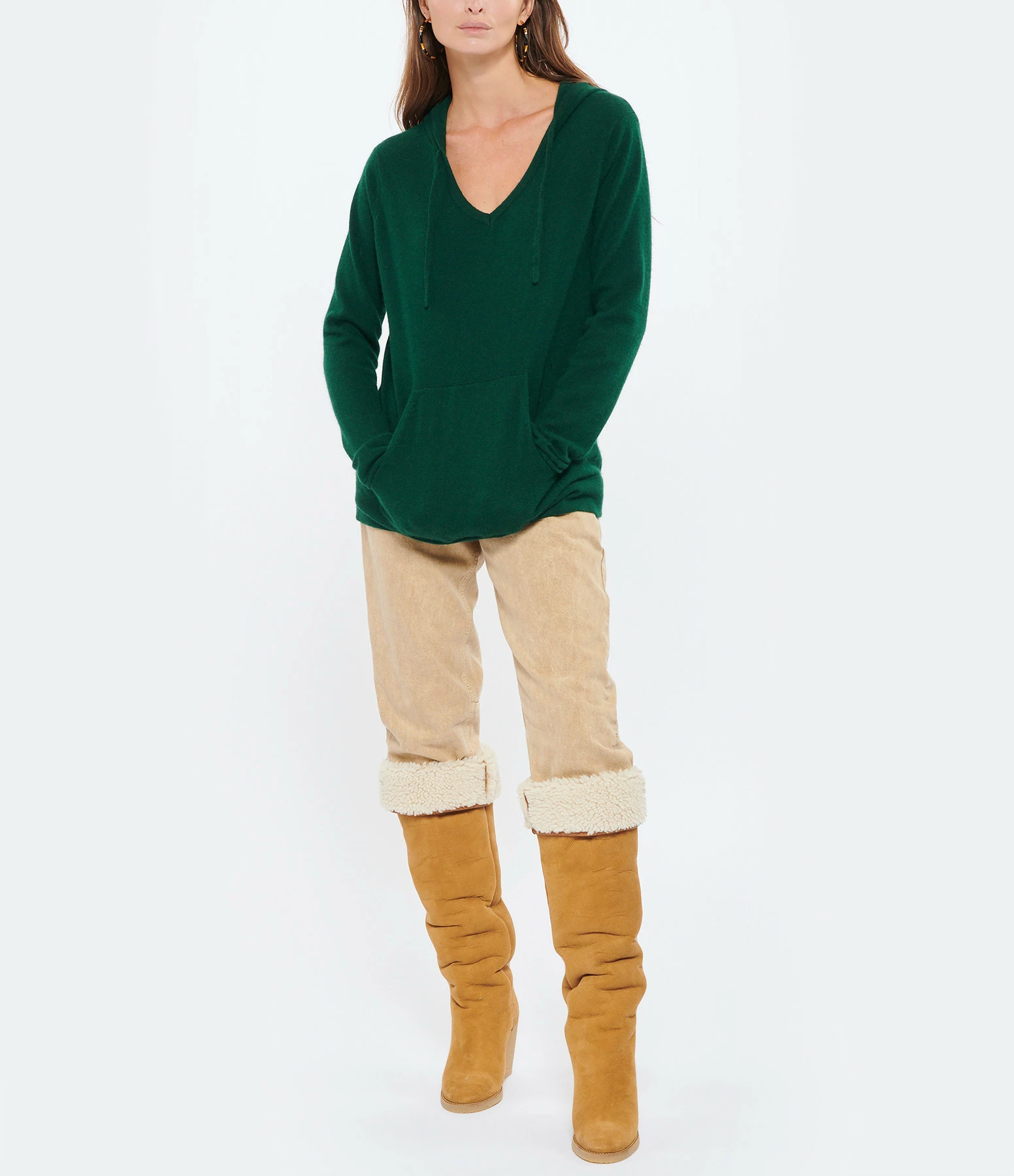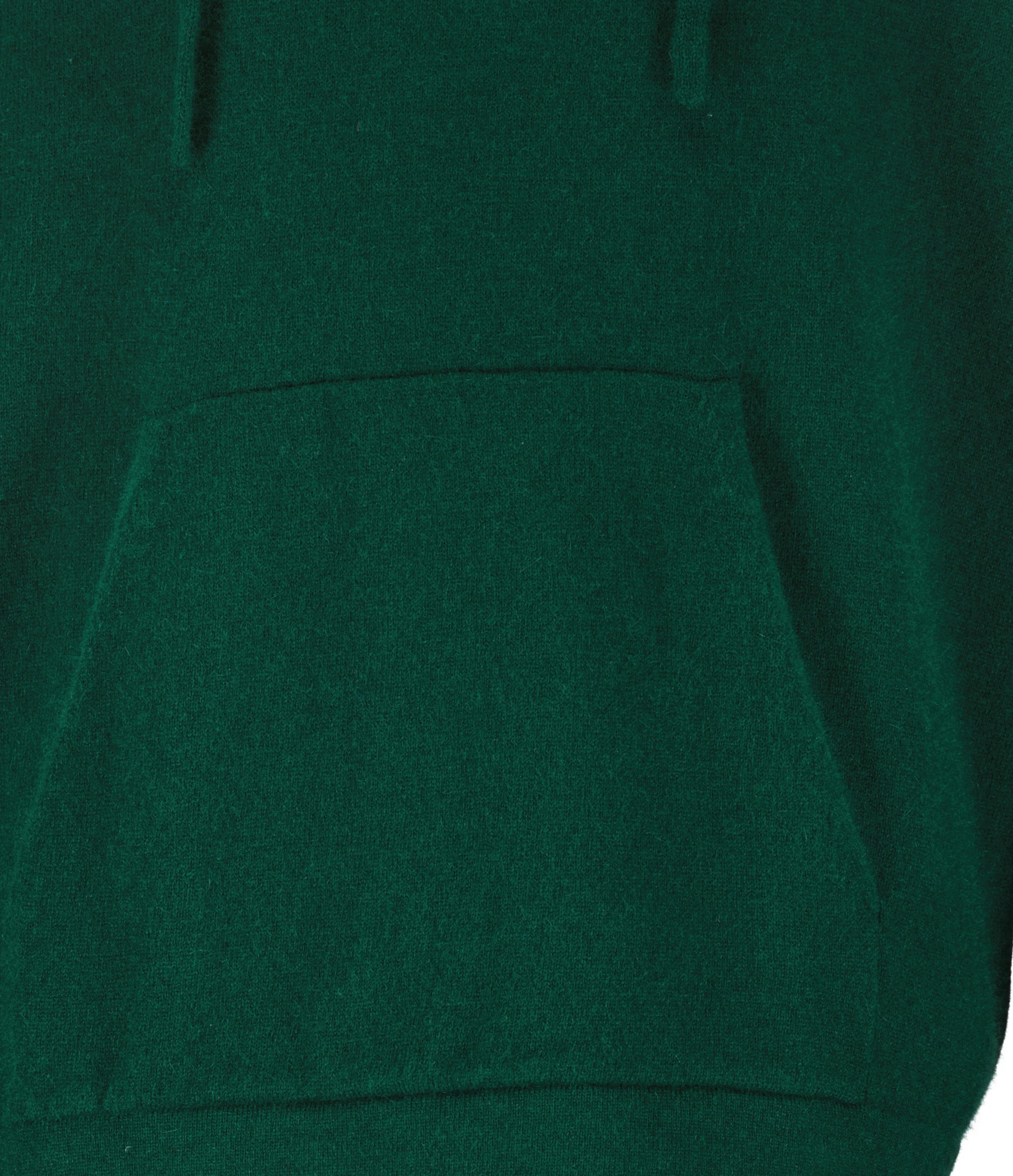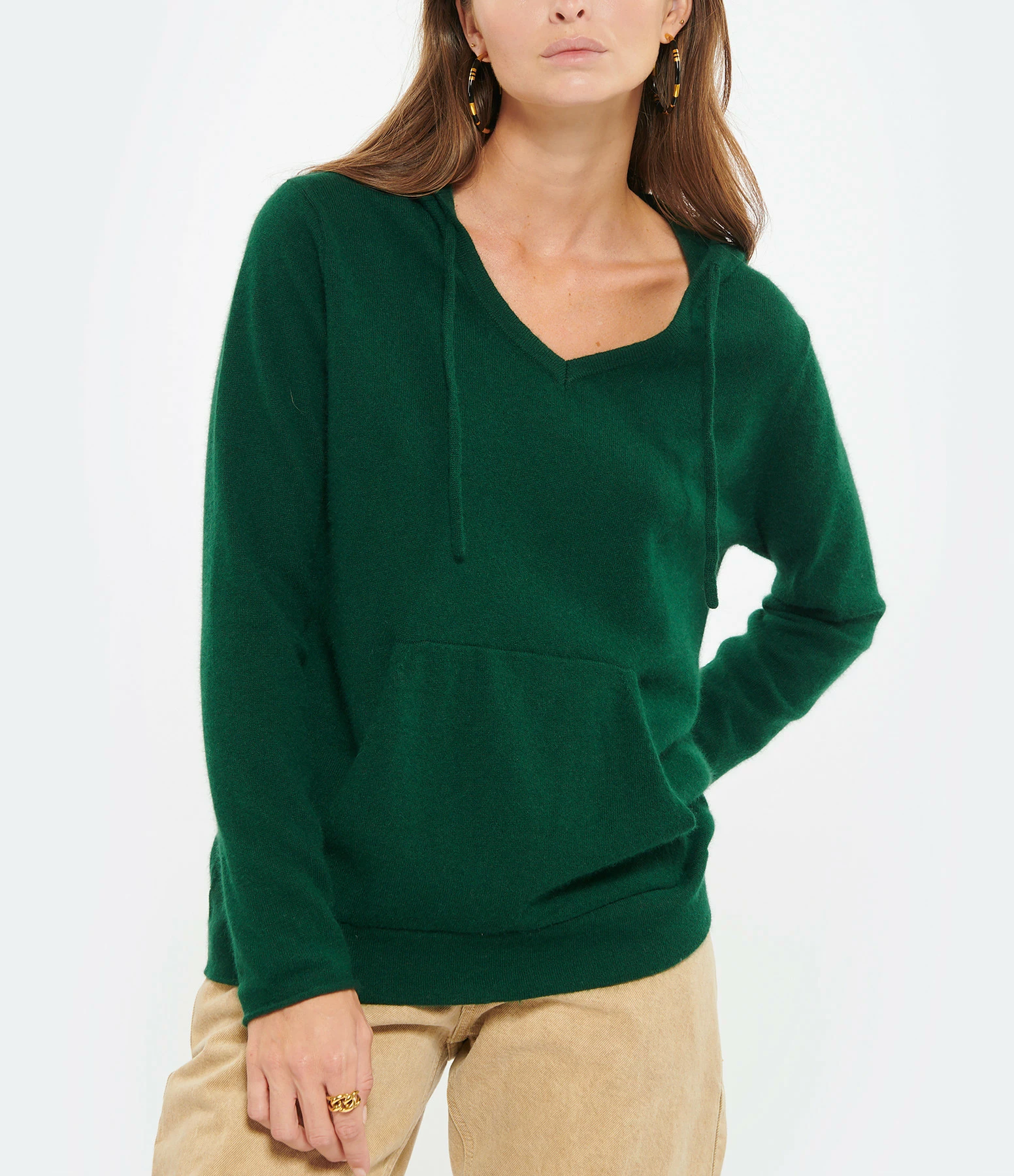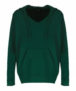 Pull à capuche en maille de cachemire mélangée vert. Col en V à capuche avec cordon de serrage. Manches longues. Poche kangourou sur le devant. Coupe droite. Base droite côtelée.