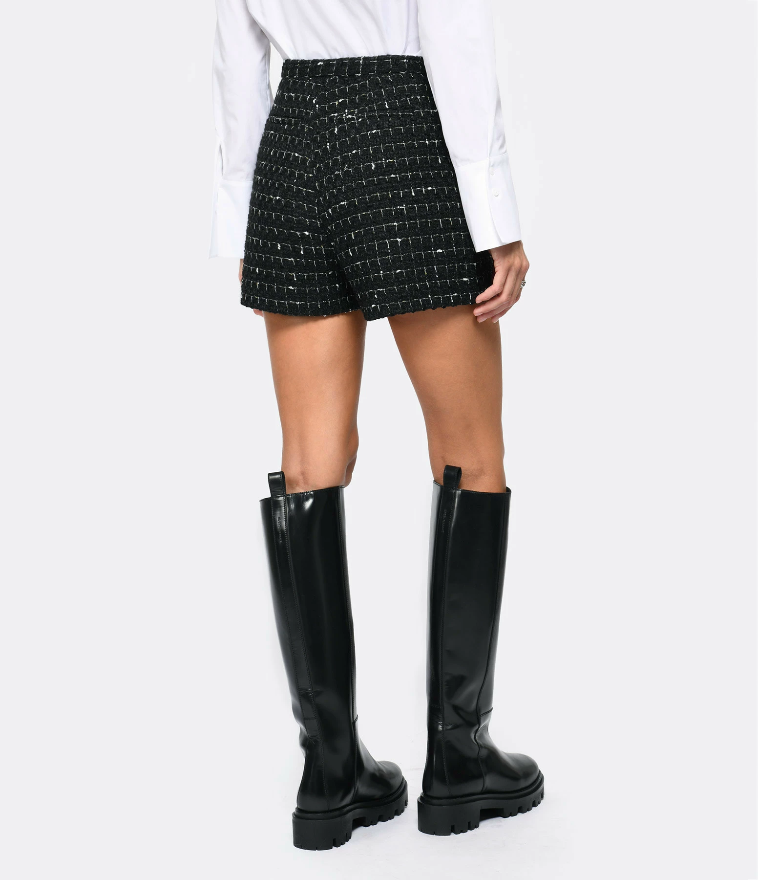 Short taille haute en tweed à carreaux noir et blanc. Fermeture par zip et crochet. Deux poches passepoilées à l’avant et deux poches plaquées à l’arrière. Coupe évasée. Base droite. Doublure en coton et viscose.